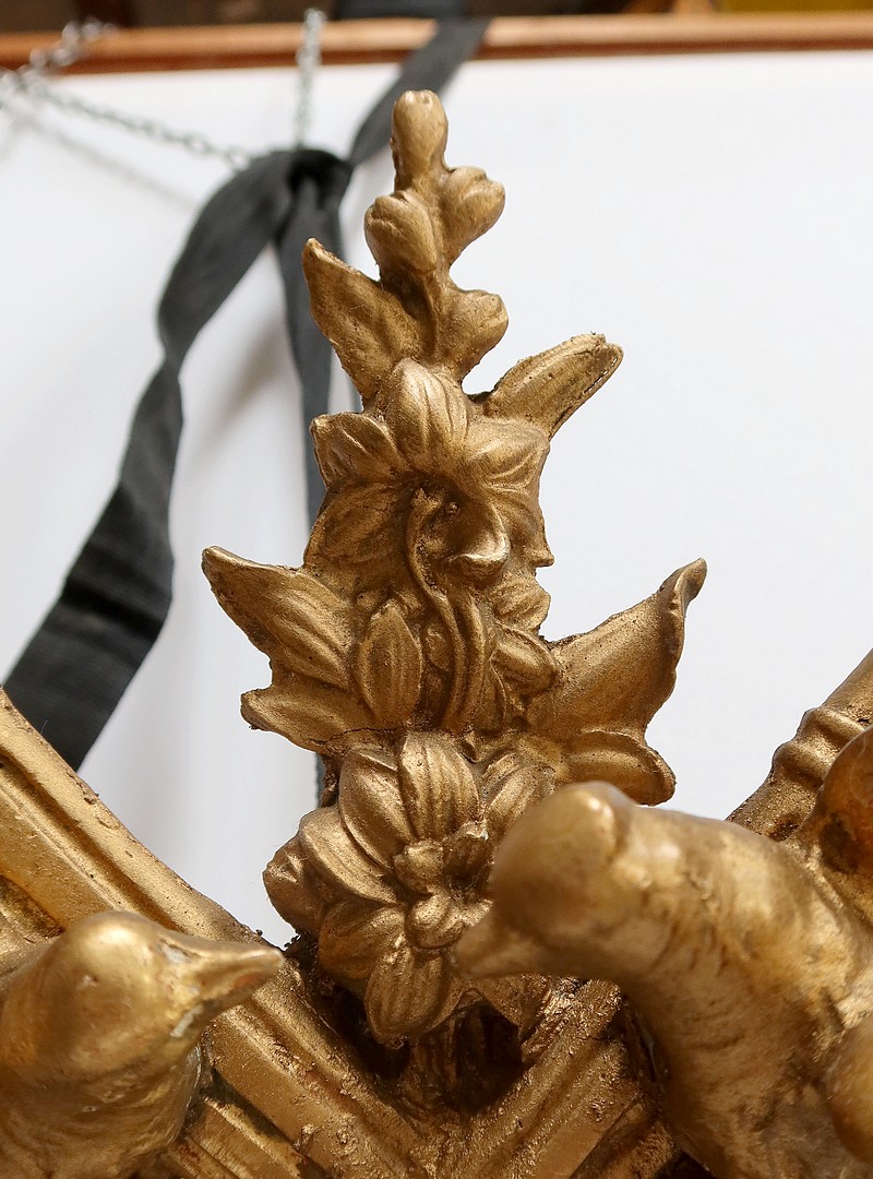 Sur le généreux fronton, où un carquois et un flambeau s’entrecroisent, deux oiseaux, posés sur deux branches fleuries, semblent s’observer l’un l’autre.