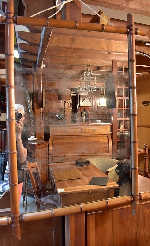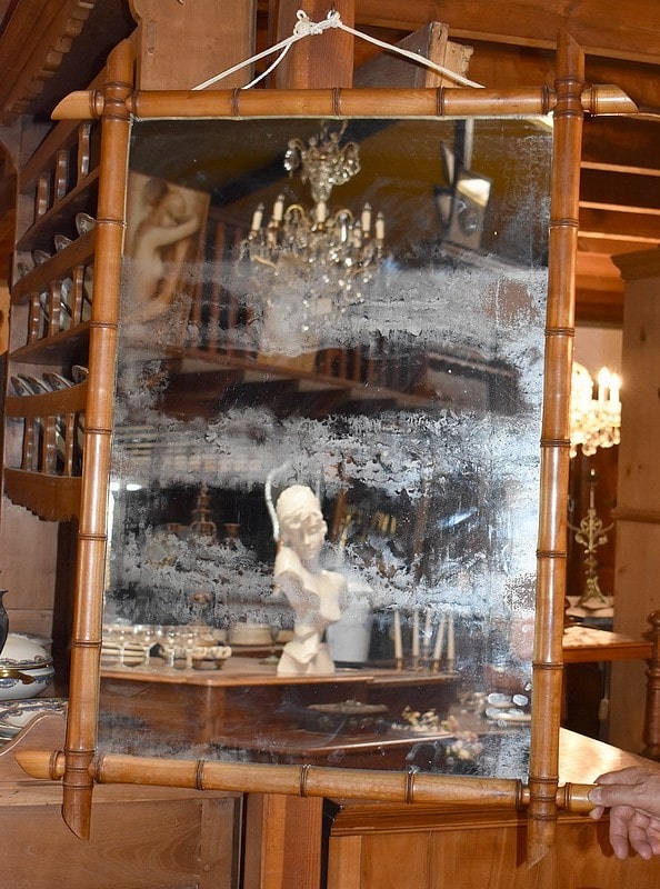 Le miroir, vieilli, présente des taches claires en forme de nuages. Une photo prise au flash (avant dernière) permet de les voir mais elles ne sont pas aussi visibles à l’oeil nu.