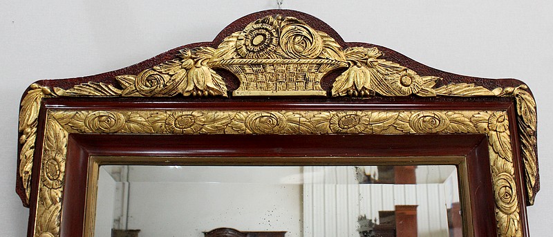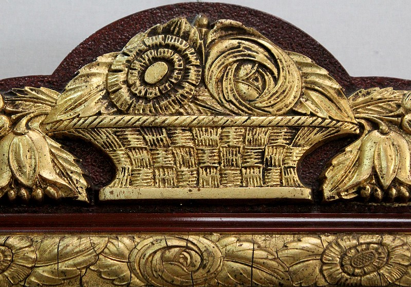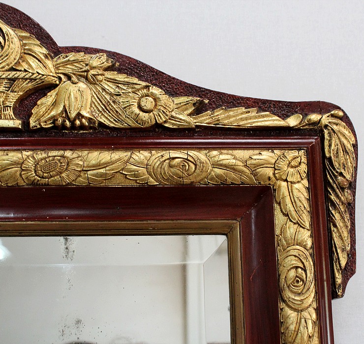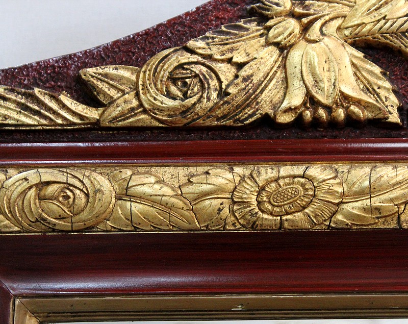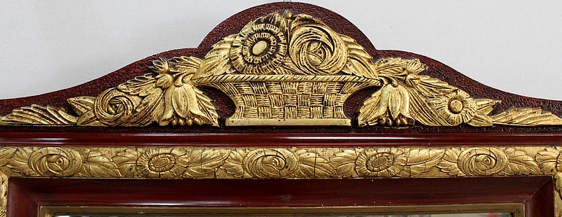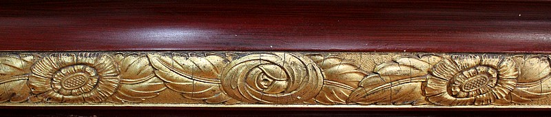 Sa teinte Acajou fait ressortir ses Ornementations dorées, sculptées de Fleurs et de Feuillage.