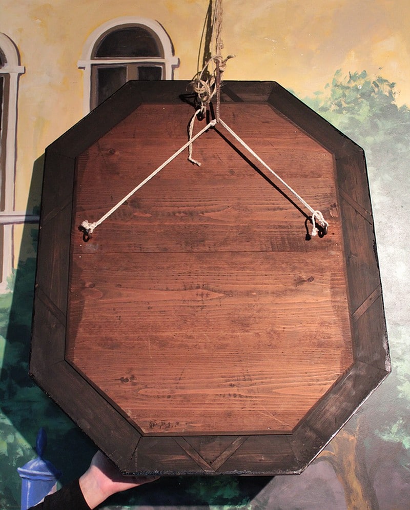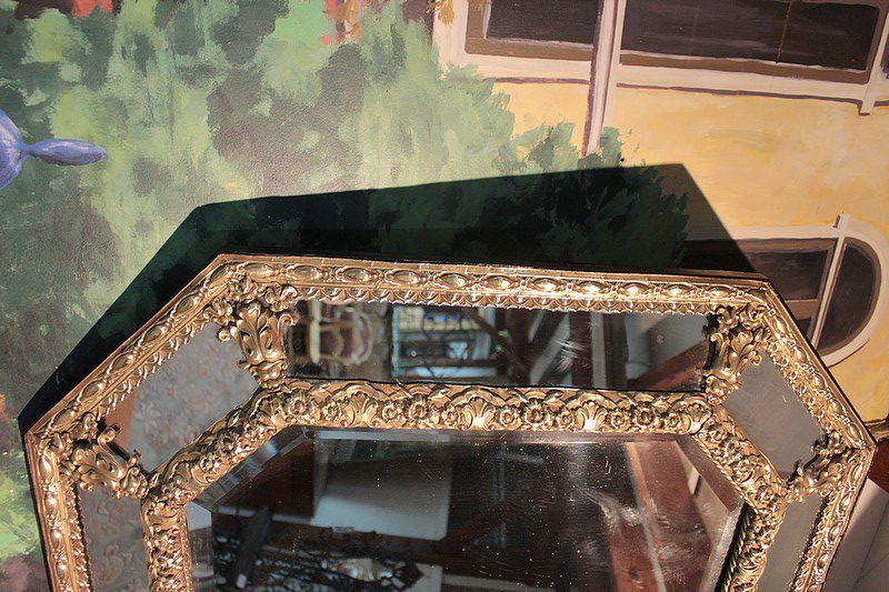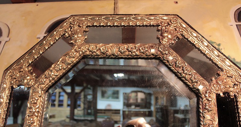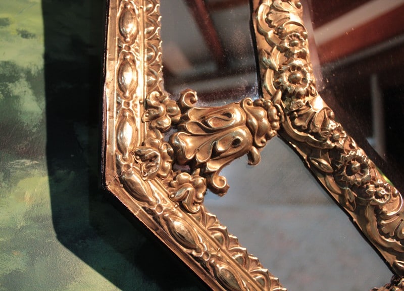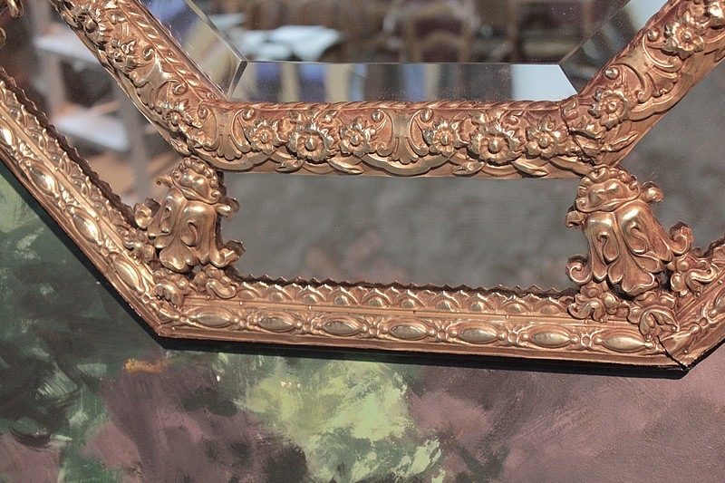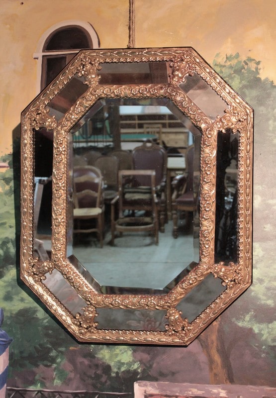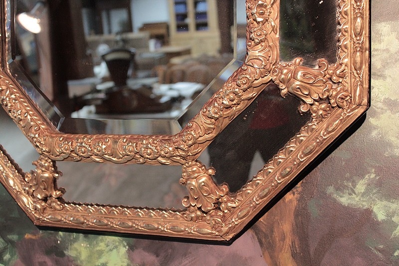 Miroir octogonal à facettes dans l’esprit Louis XIV. La glace centrale est biseautée. L’entourage est en laiton repoussé.