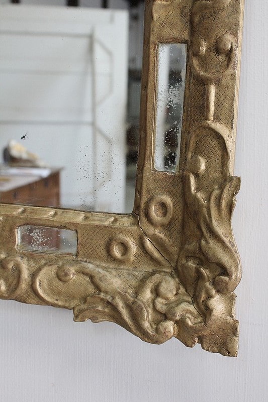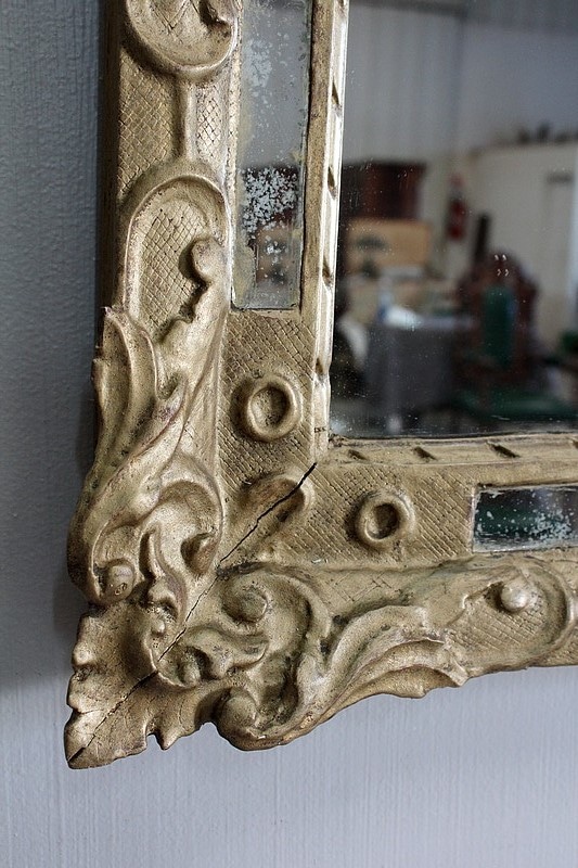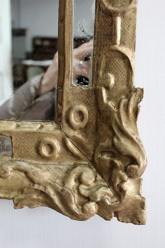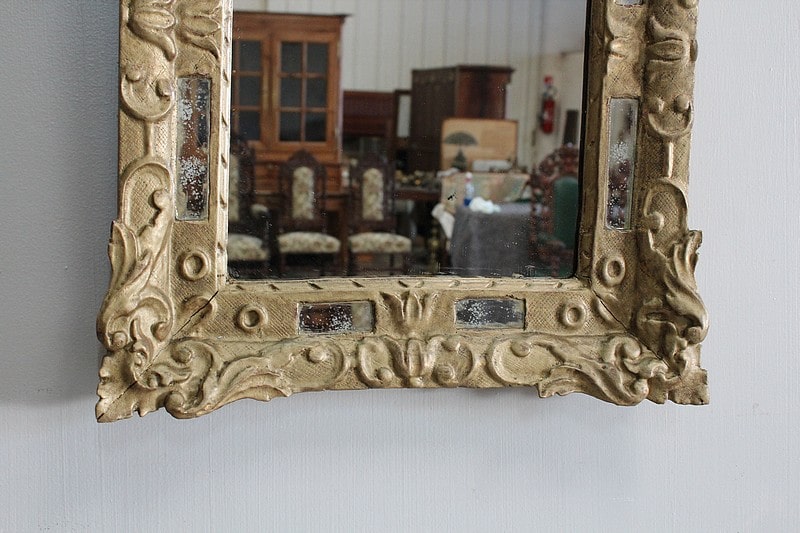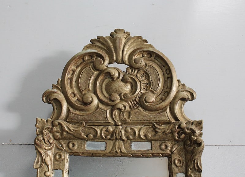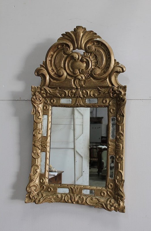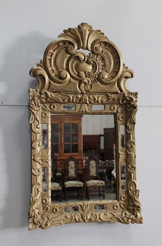 Miroir à fronton et pare-close de style Louis XIV, en bois doré et sculpté d’une grande coquille en fronton et de feuillages aux angles.