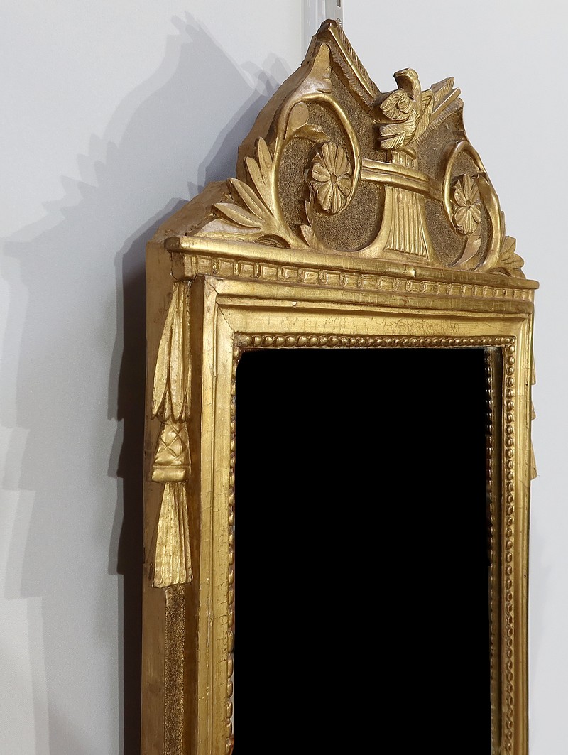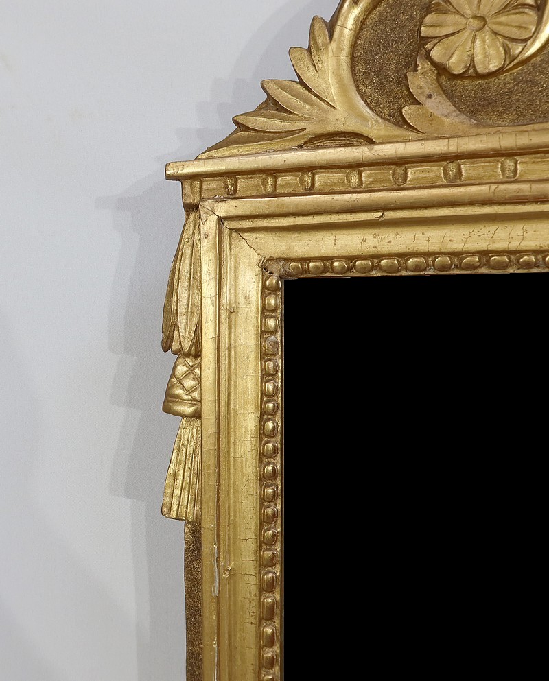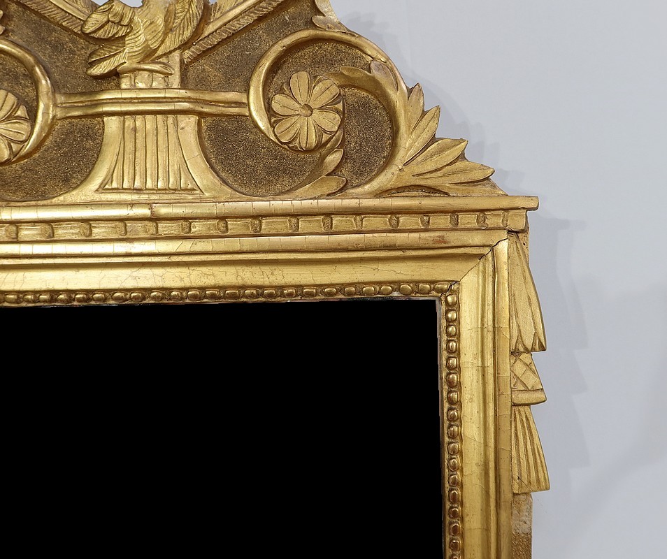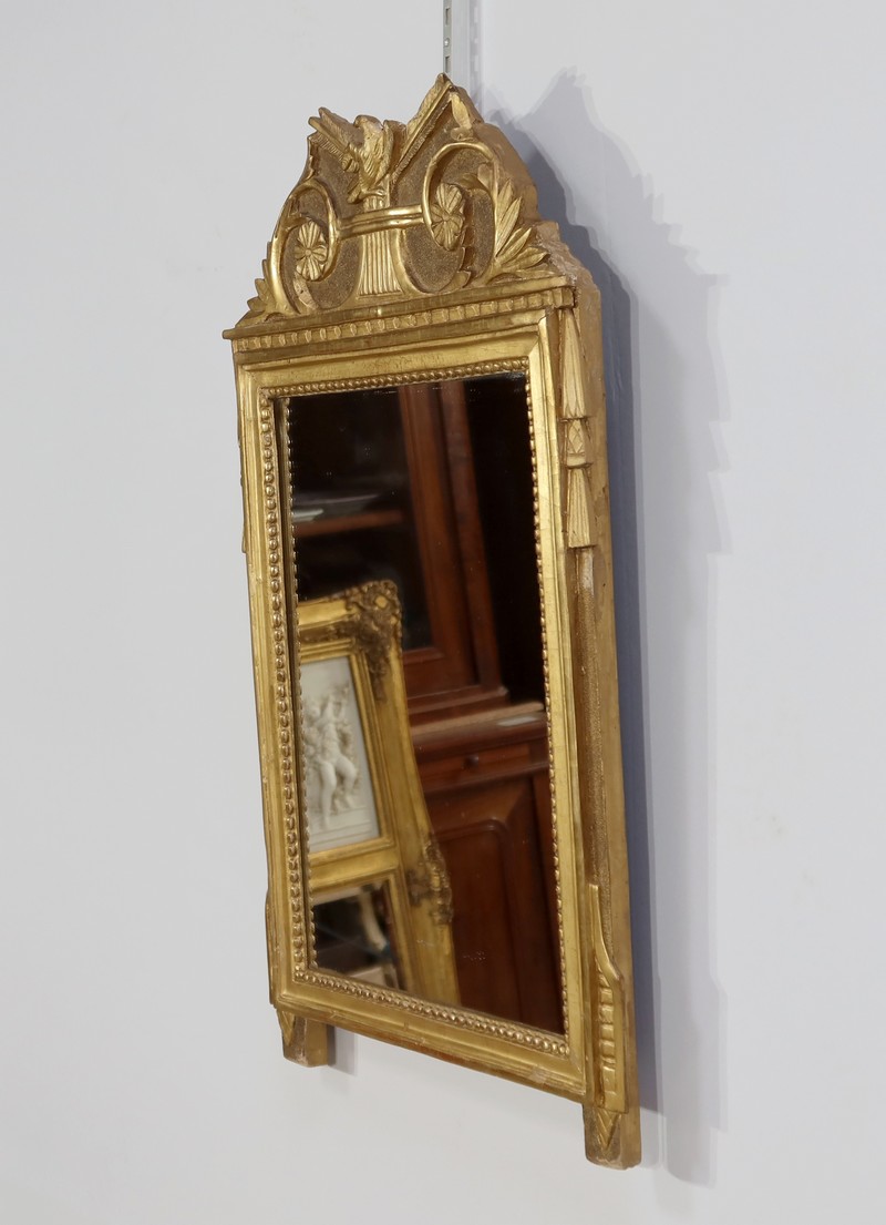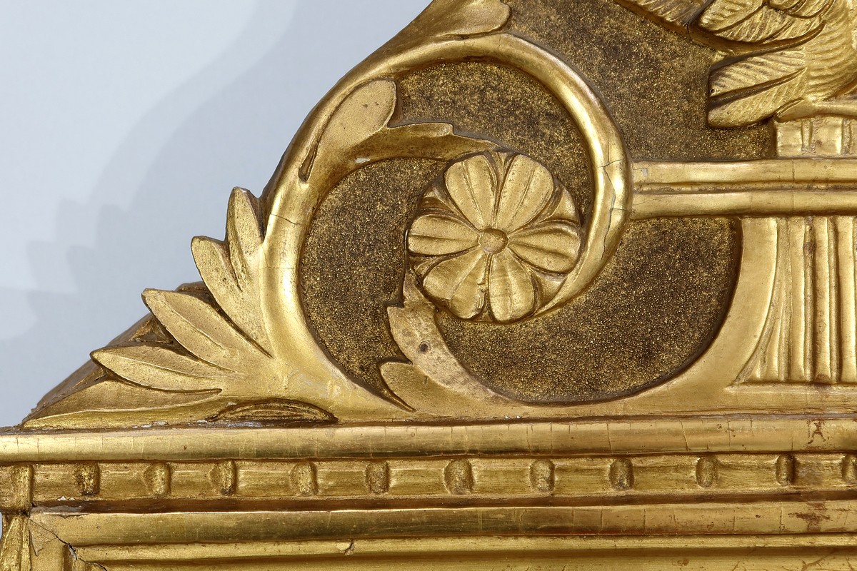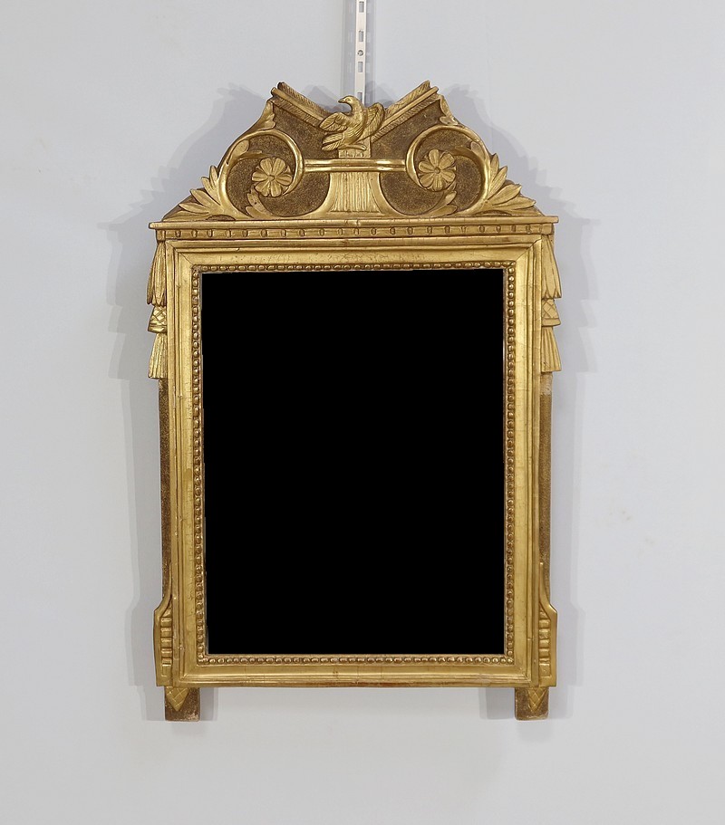 Charmant miroir rectangulaire en bois doré à cadre mouluré et perlé, sommé d’un grand fronton représentant une colombe entourée de flèches, de volutes et de fleurs. De chaque côté, des pompons forment des chutes sur le haut du cadre.
