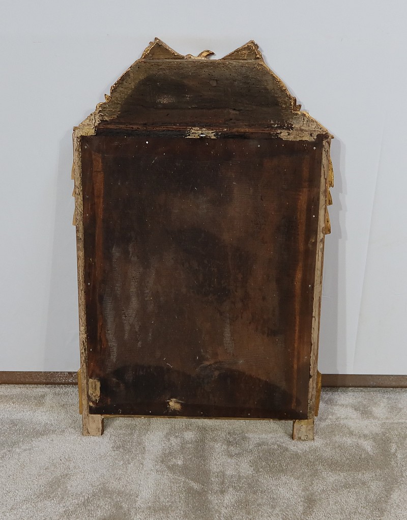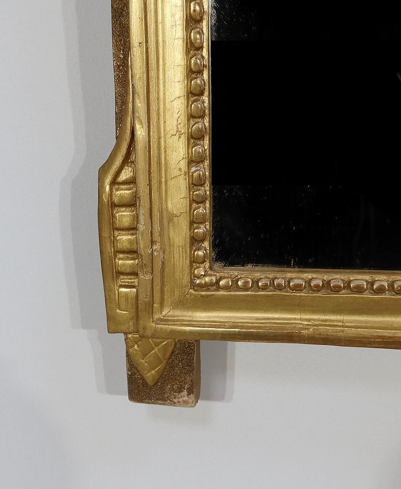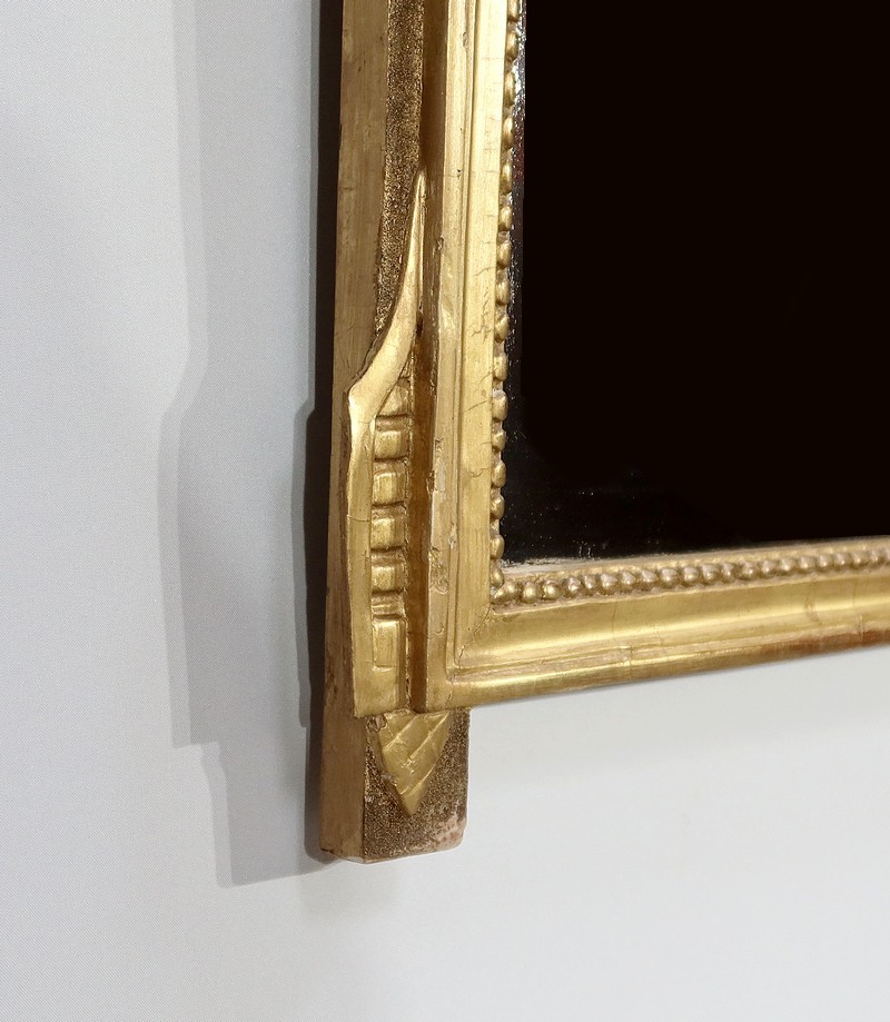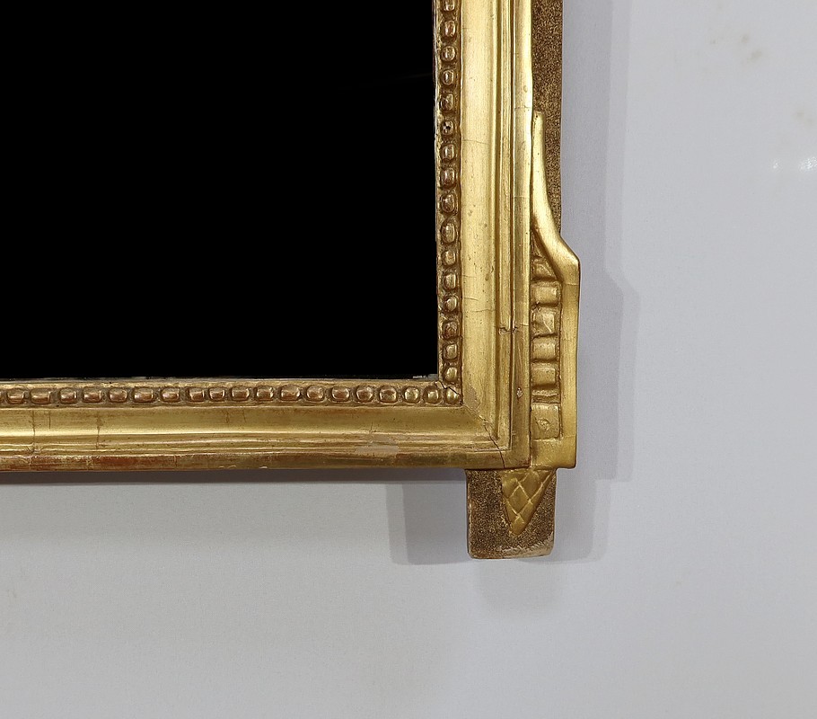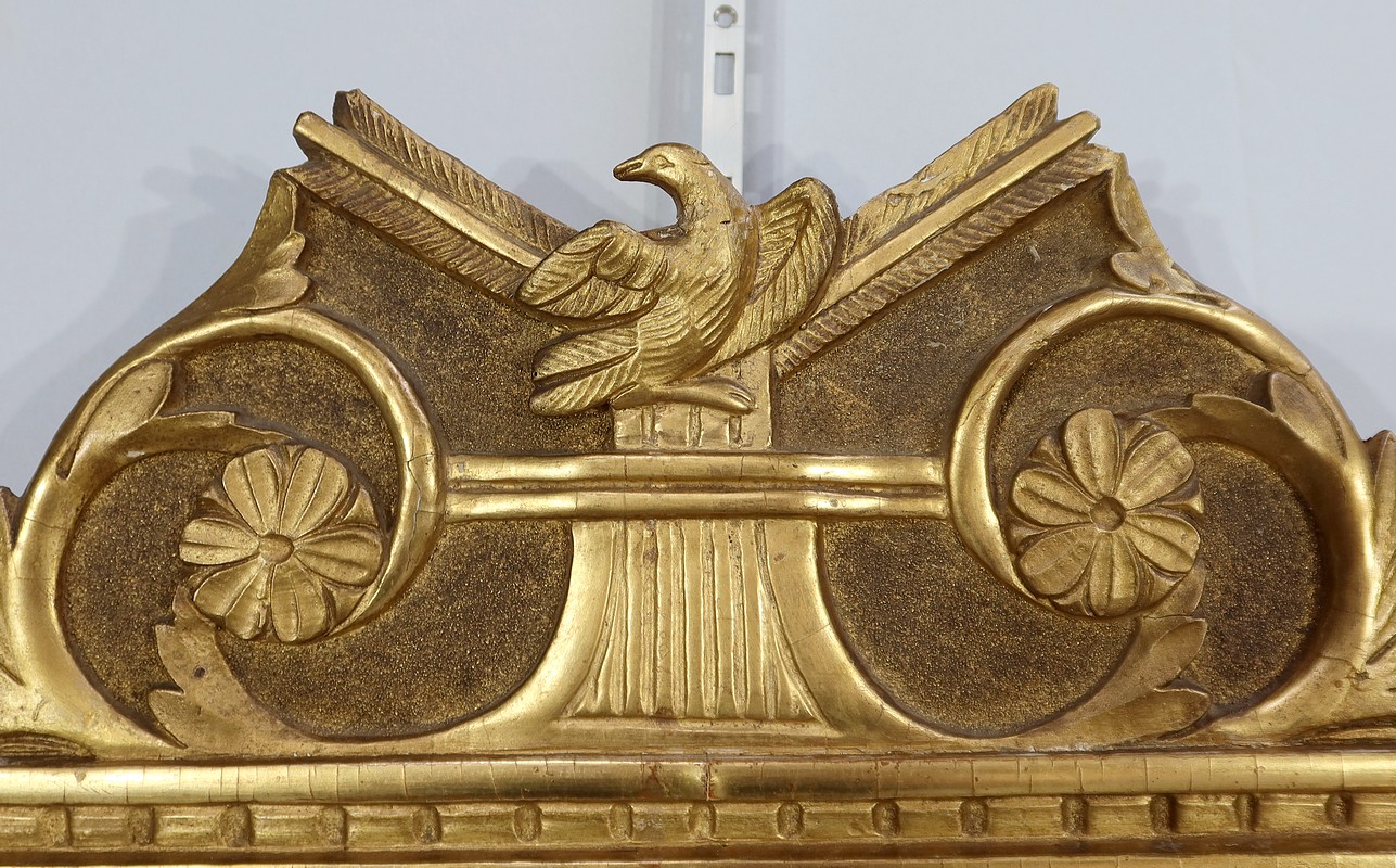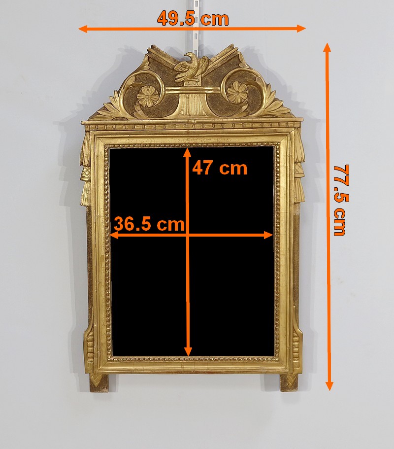 Charmant miroir rectangulaire en bois doré à cadre mouluré et perlé, sommé d’un grand fronton représentant une colombe entourée de flèches, de volutes et de fleurs. De chaque côté, des pompons forment des chutes sur le haut du cadre.