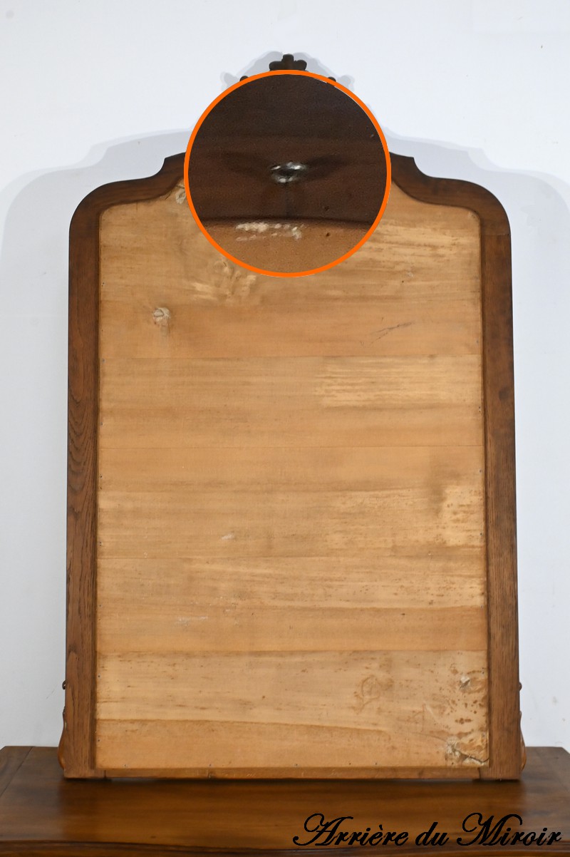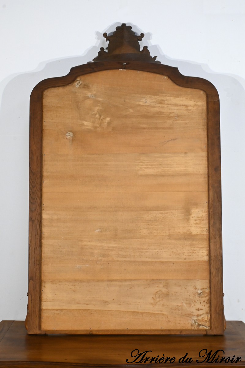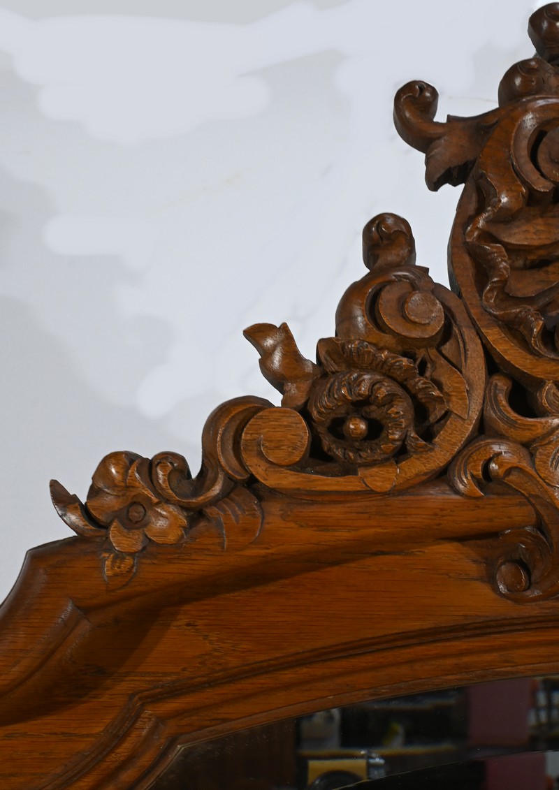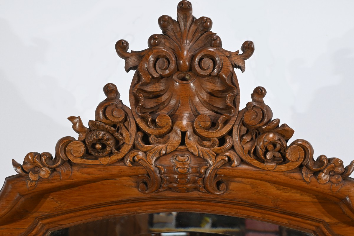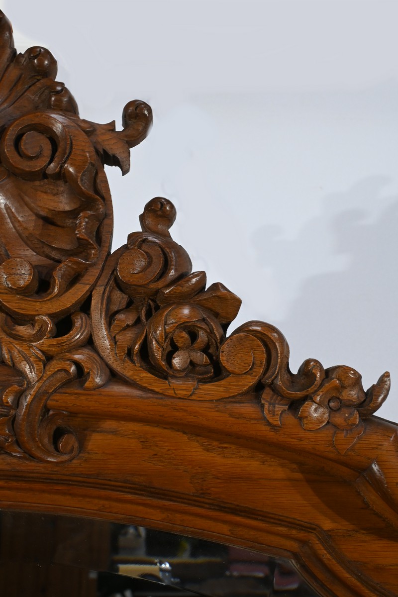 Ce miroir en chêne, inspiré du style Louis XV/Rocaille et datant de la fin du XIXe siècle, est une pièce remarquable par son élégance et son raffinement.