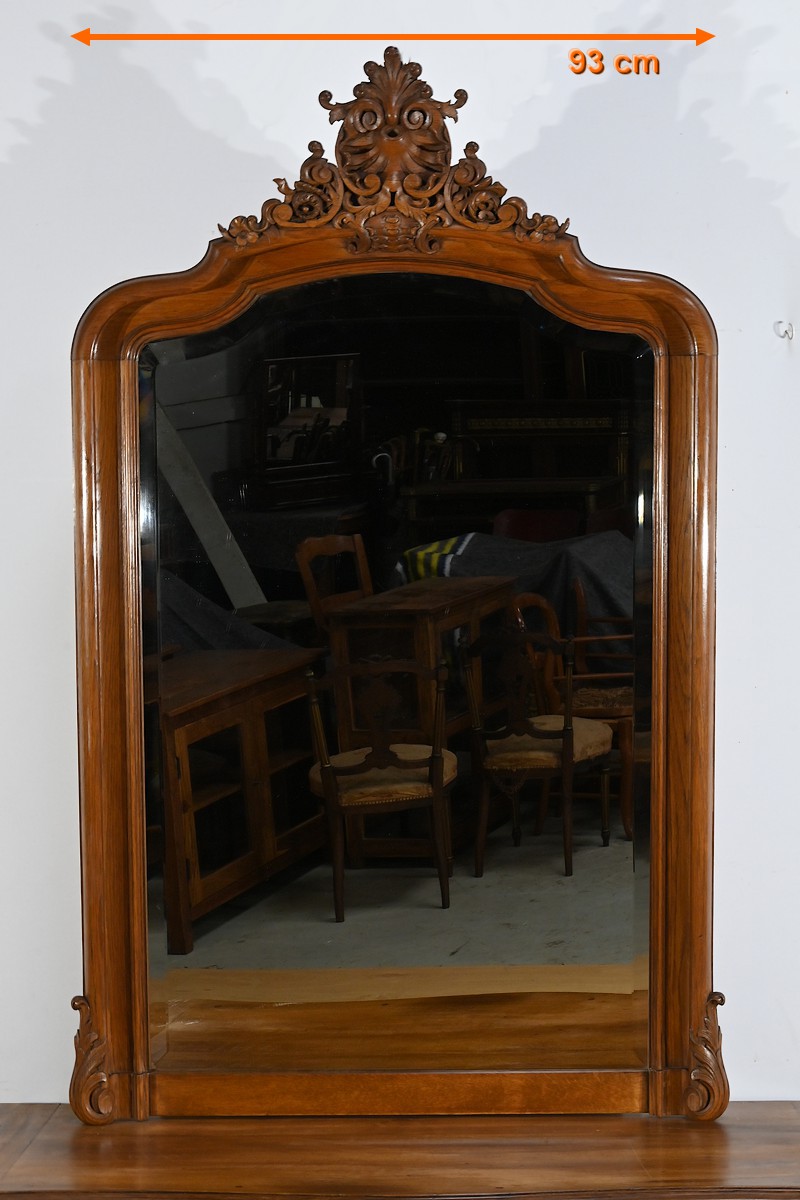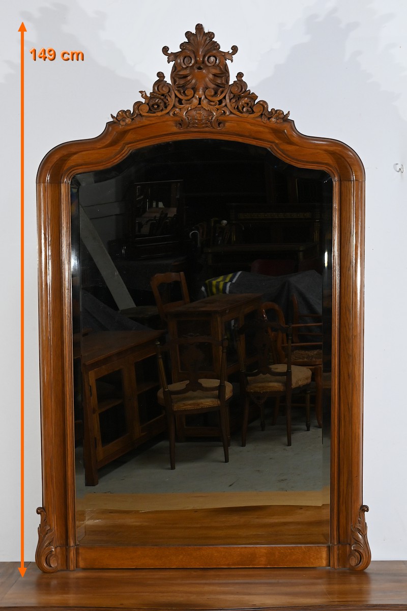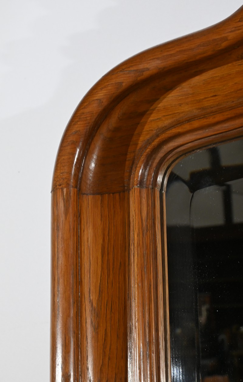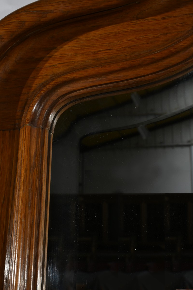 Ce miroir en chêne, inspiré du style Louis XV/Rocaille et datant de la fin du XIXe siècle, est une pièce remarquable par son élégance et son raffinement.