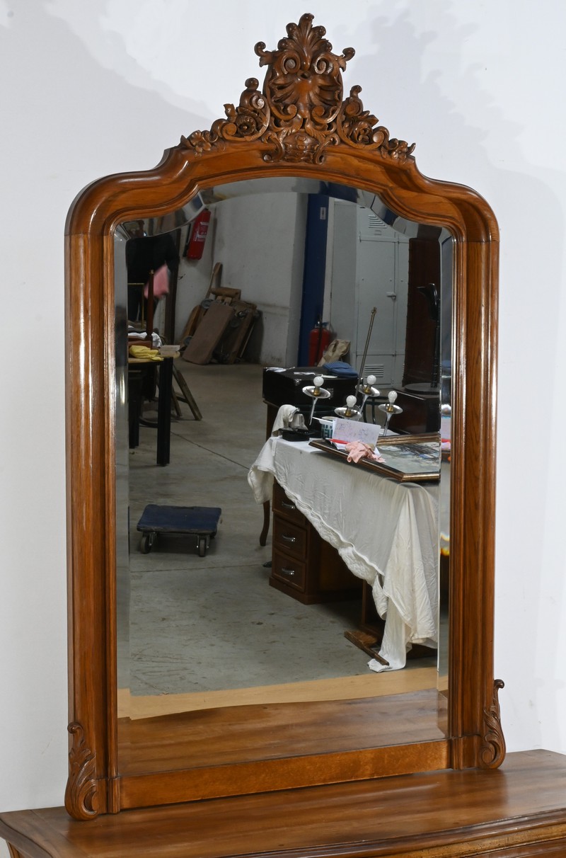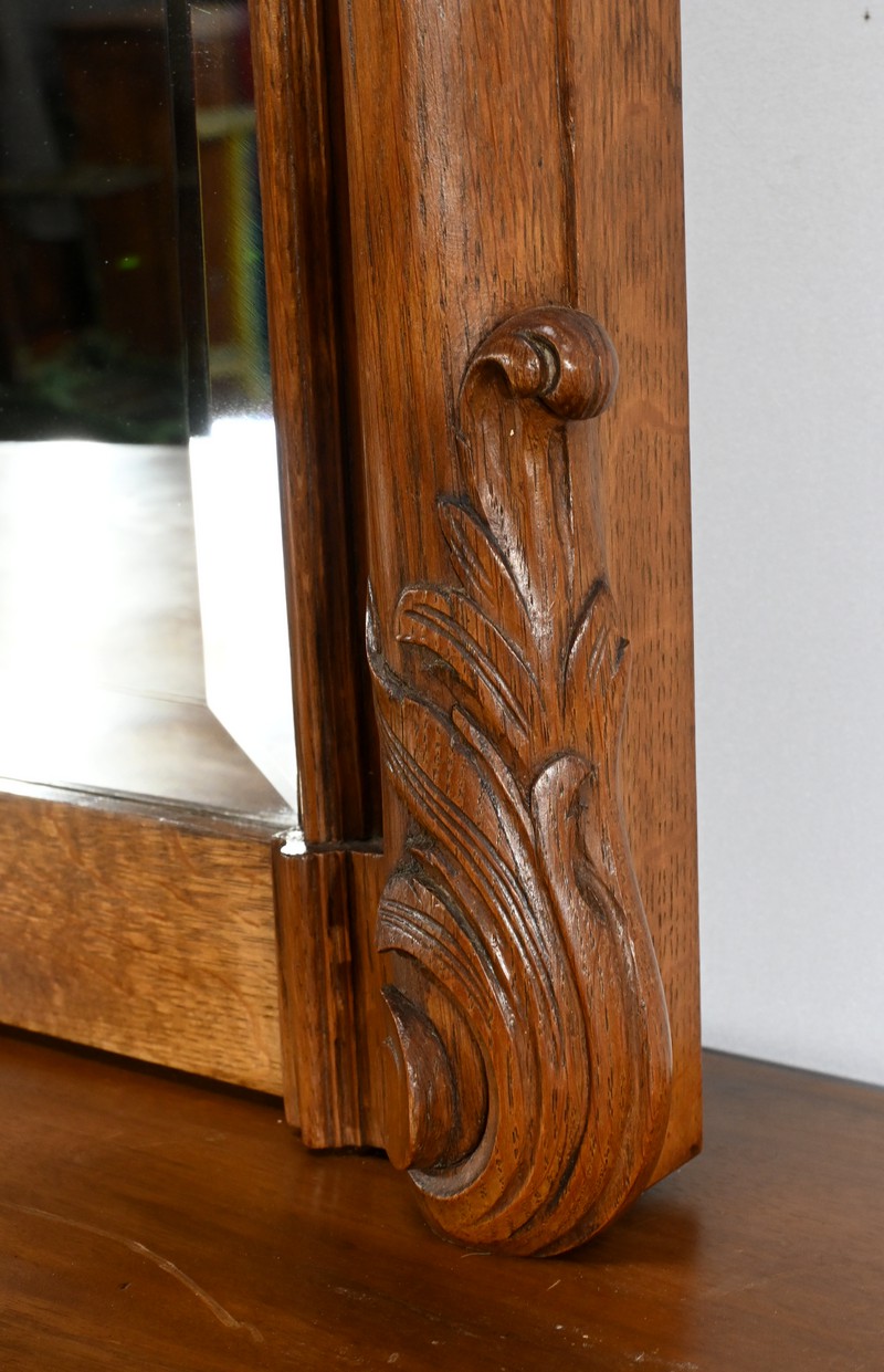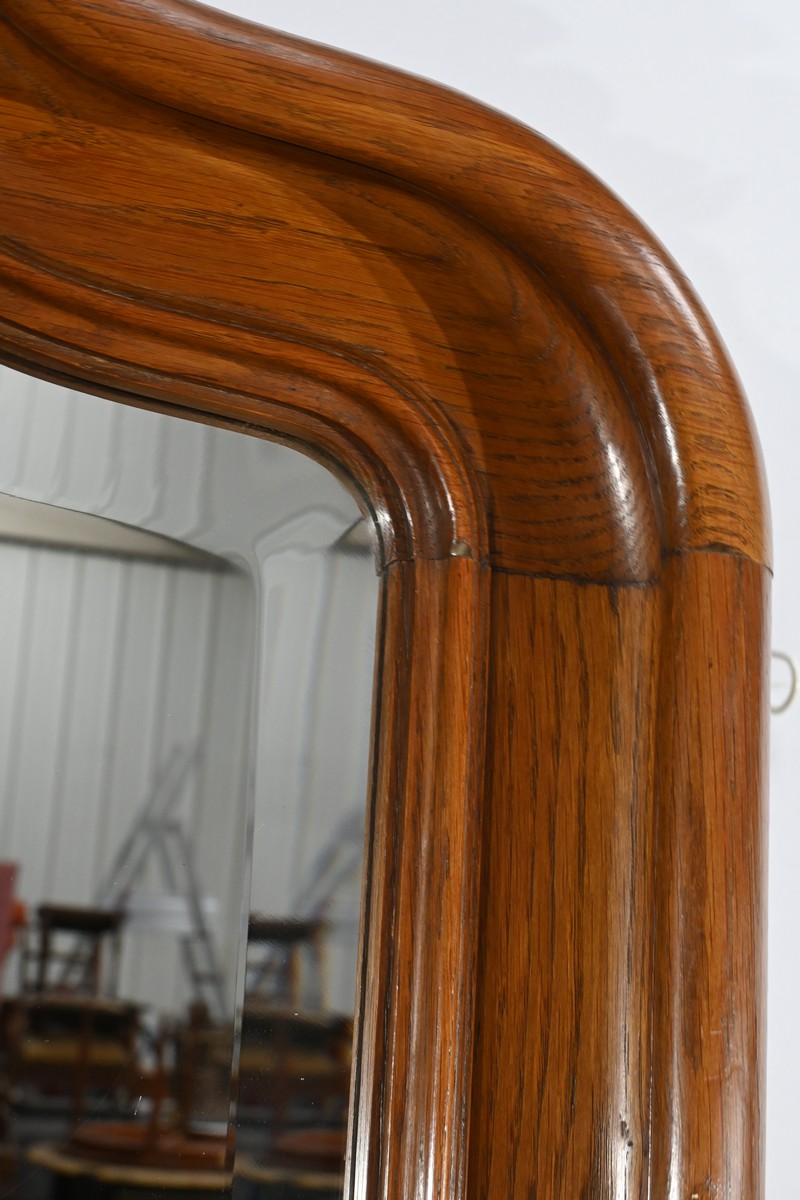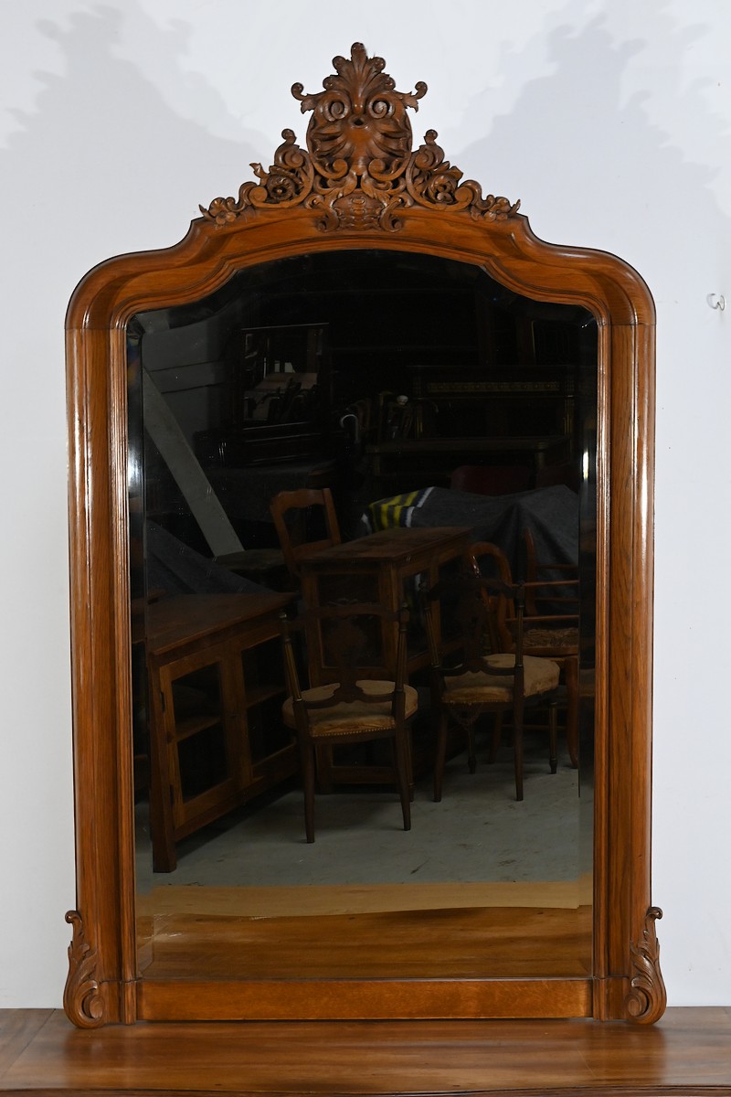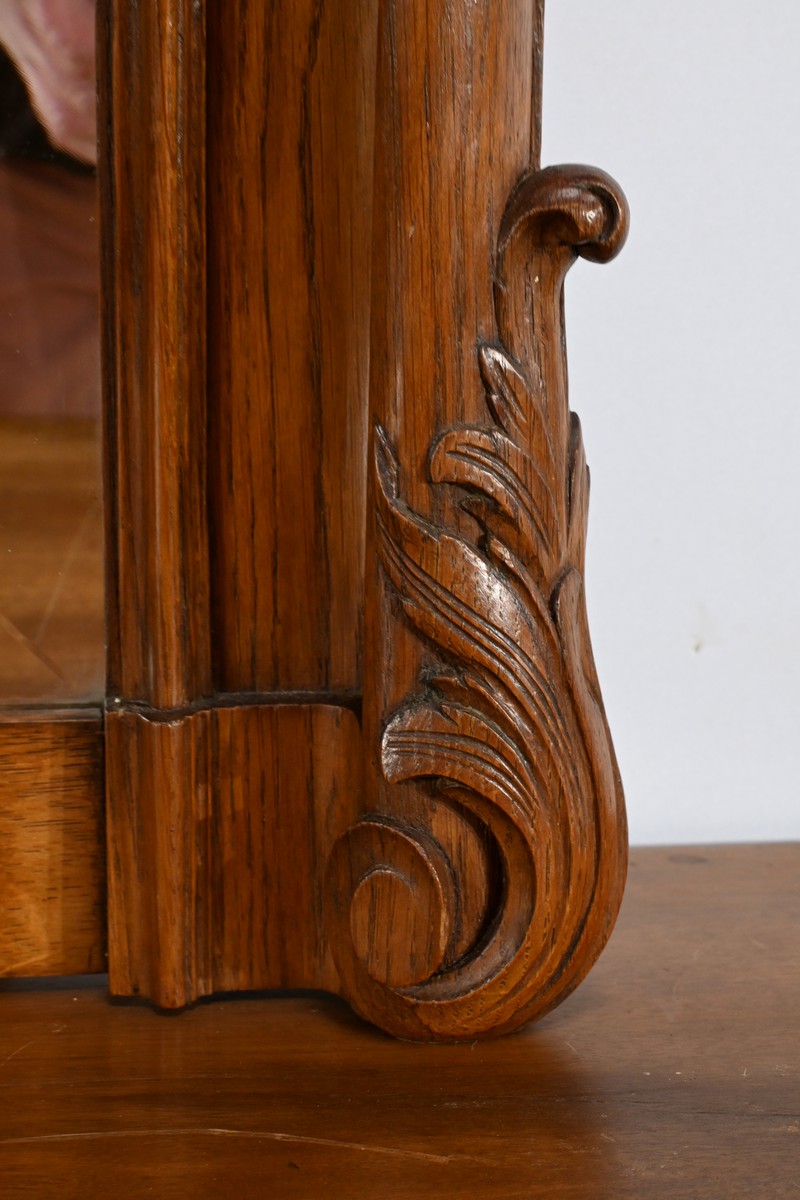 Ce miroir en chêne, inspiré du style Louis XV/Rocaille et datant de la fin du XIXe siècle, est une pièce remarquable par son élégance et son raffinement.