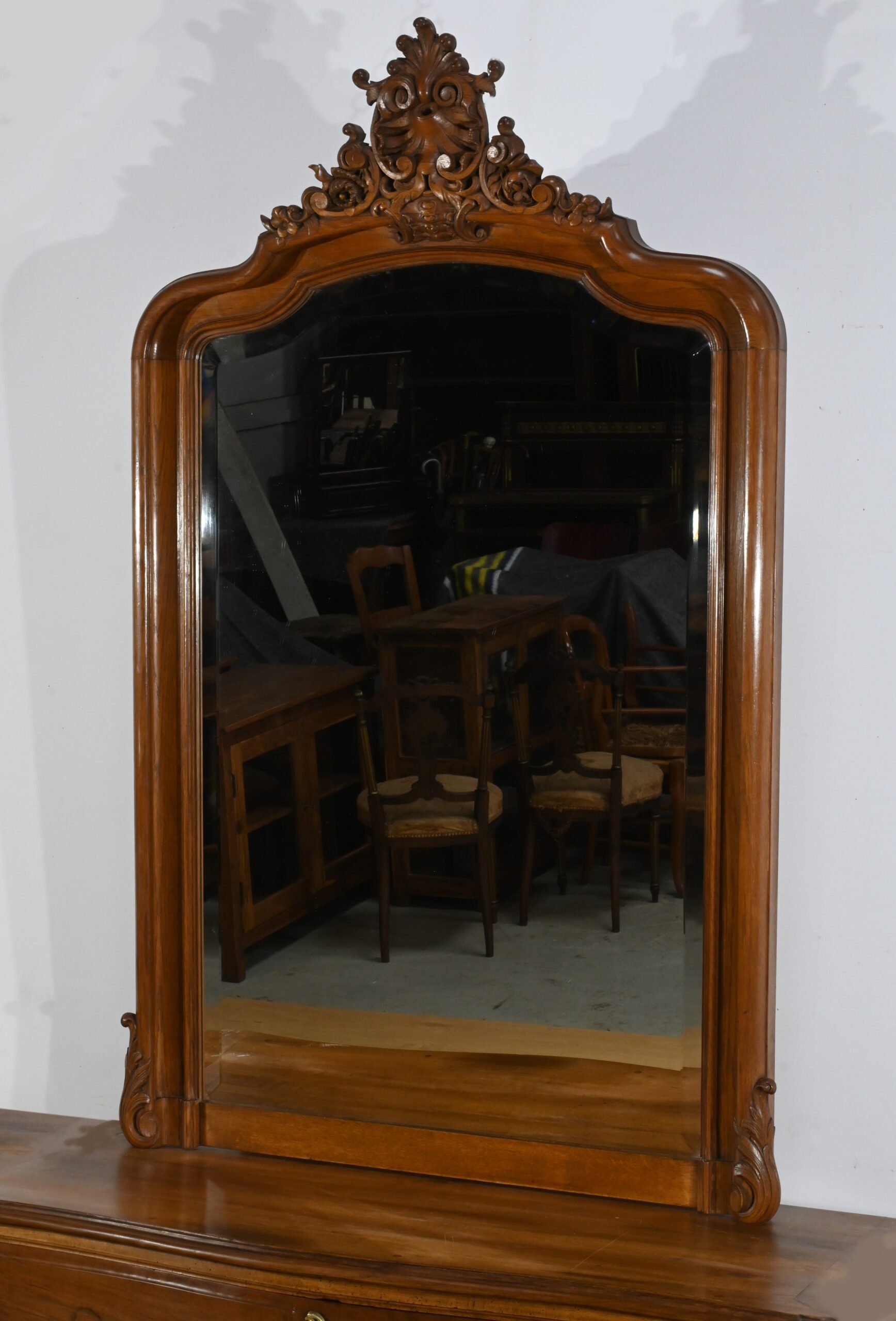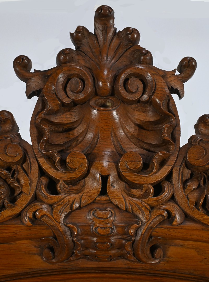 La particularité de ce miroir réside dans son fronton richement orné, où se déploient des motifs de coquille, de rinceaux, de volutes et de palmettes, témoignant de l’influence baroque et rococo de l’époque.