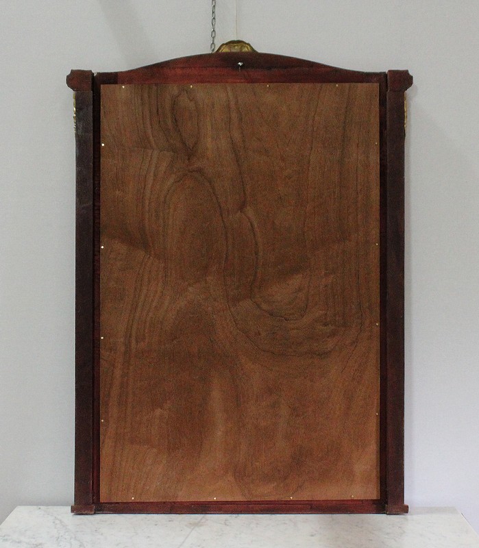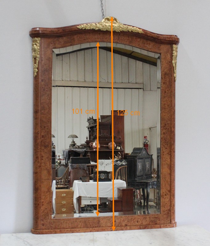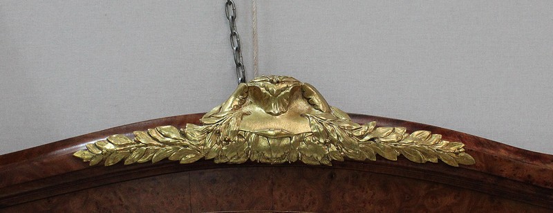 Ce Miroir, épais de 7cm, présente une Glace au Mercure avec une partie supérieure au léger Galbe, épousant la forme du Cadre. Sur sa Traverse la plus haute présentant des Moulures, il arbore un Bronze conséquent avec des motifs de Feuillages. De chaque côté, sur les Montants découpés en Quart de Cercle, on retrouve une Chute, en Bronze également.