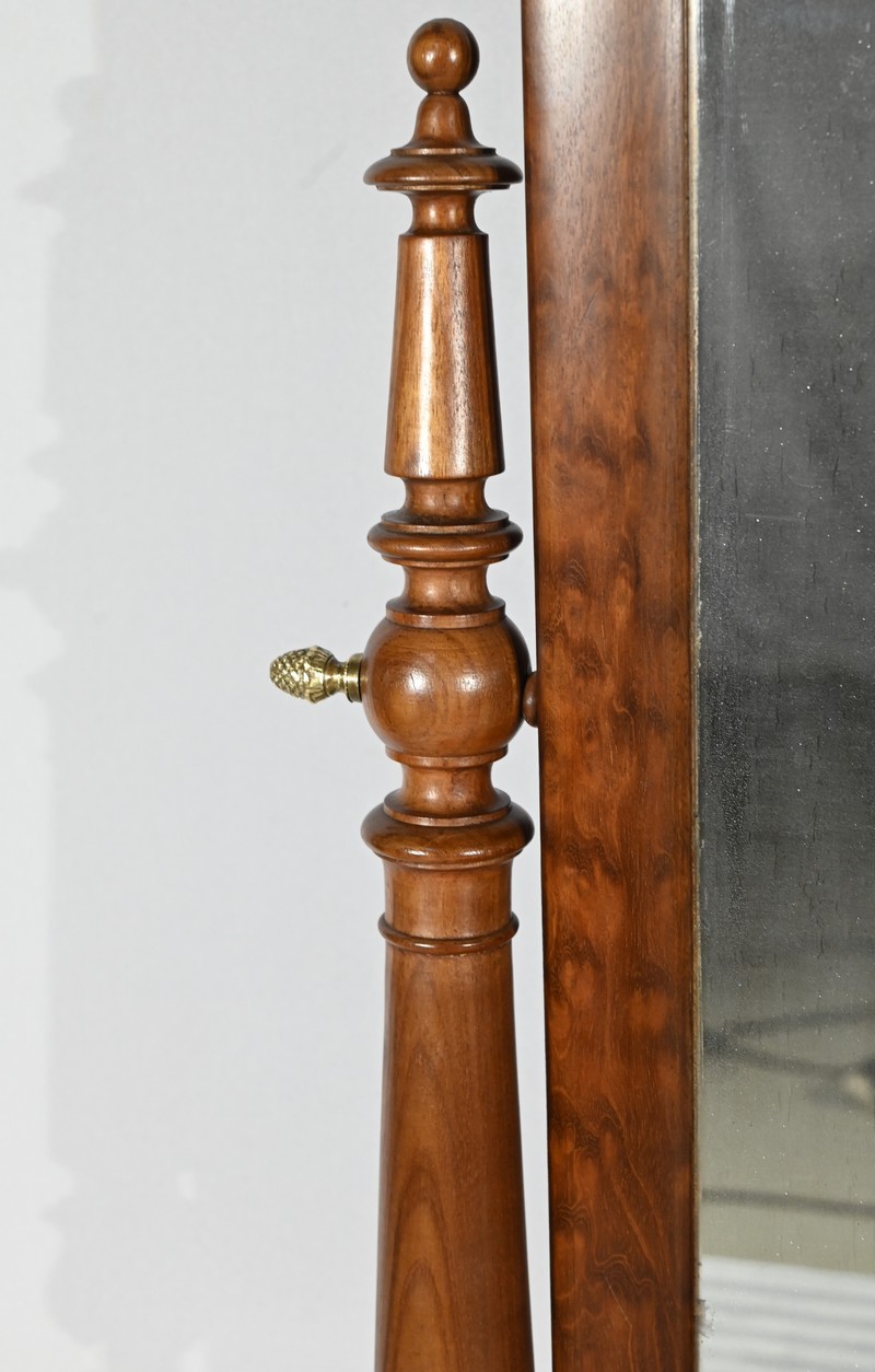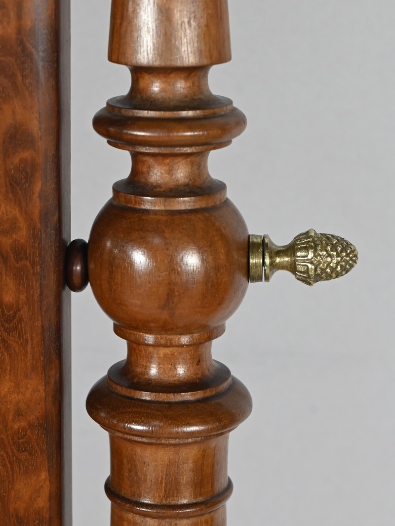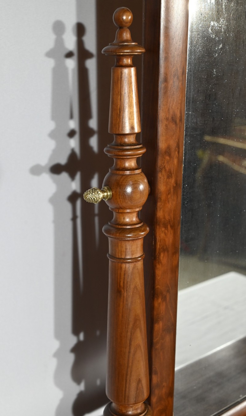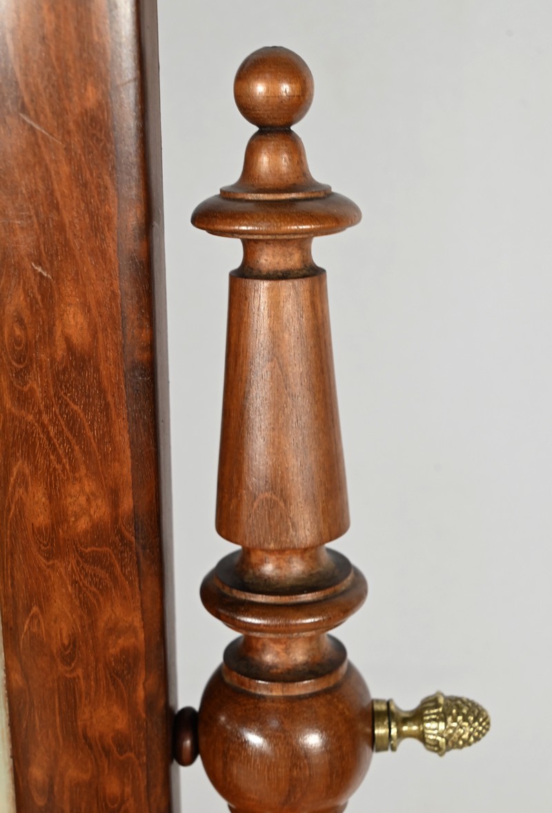 Ce miroir psyché ouvre par un tiroir à bouton bois tourné à façade en moucheté d’acajou.