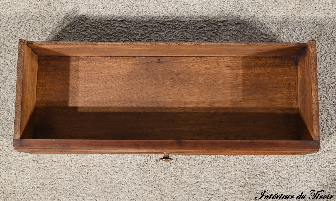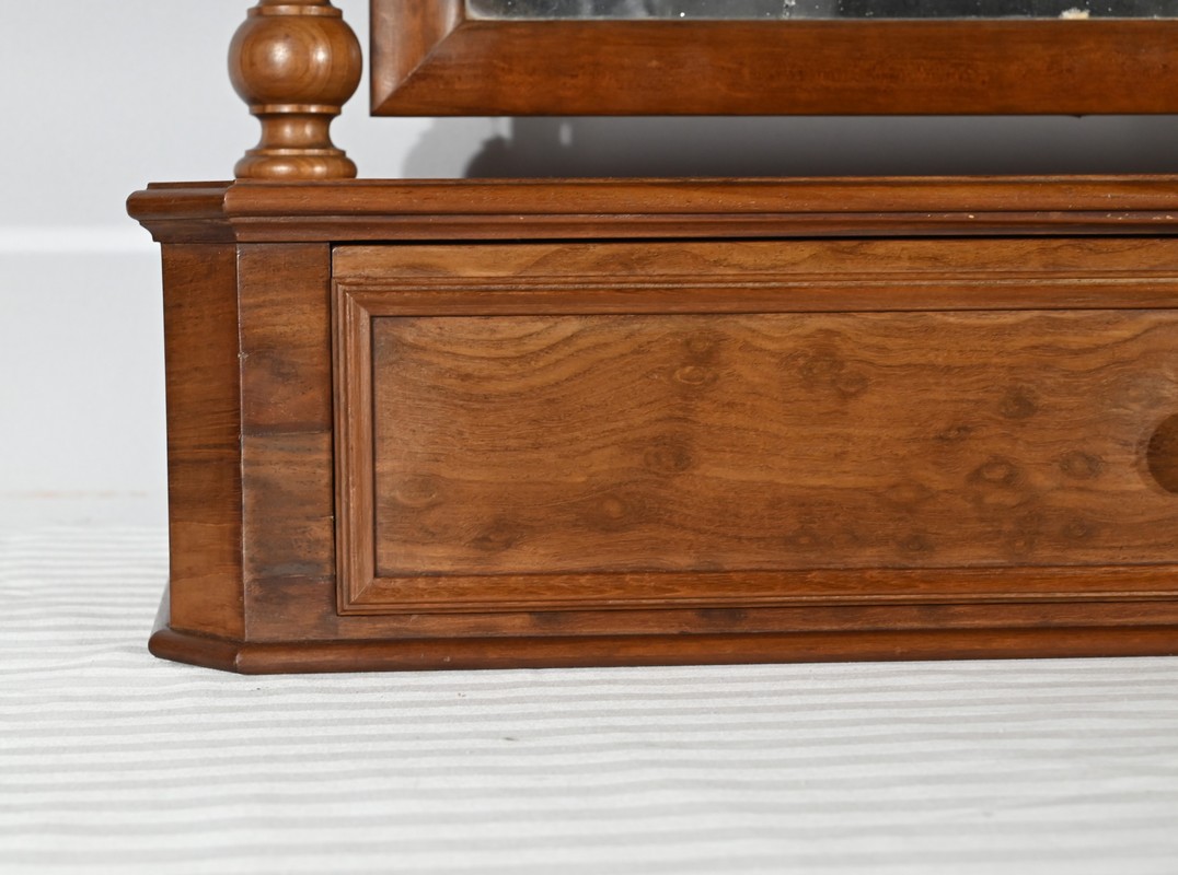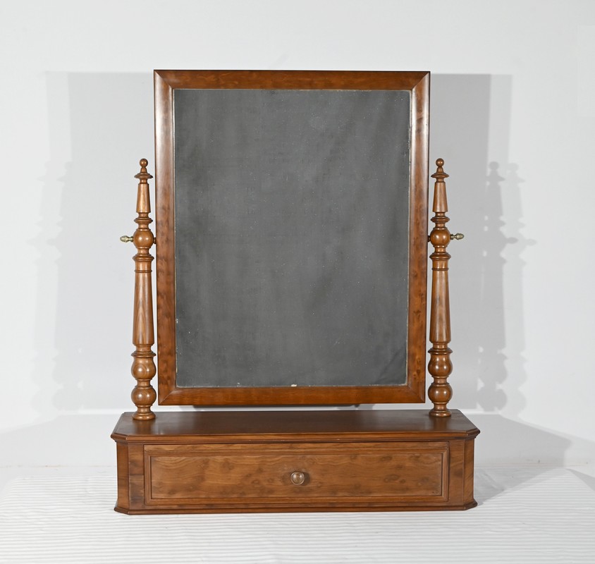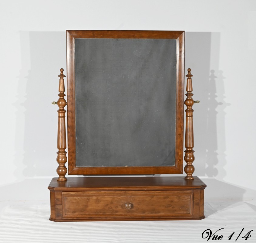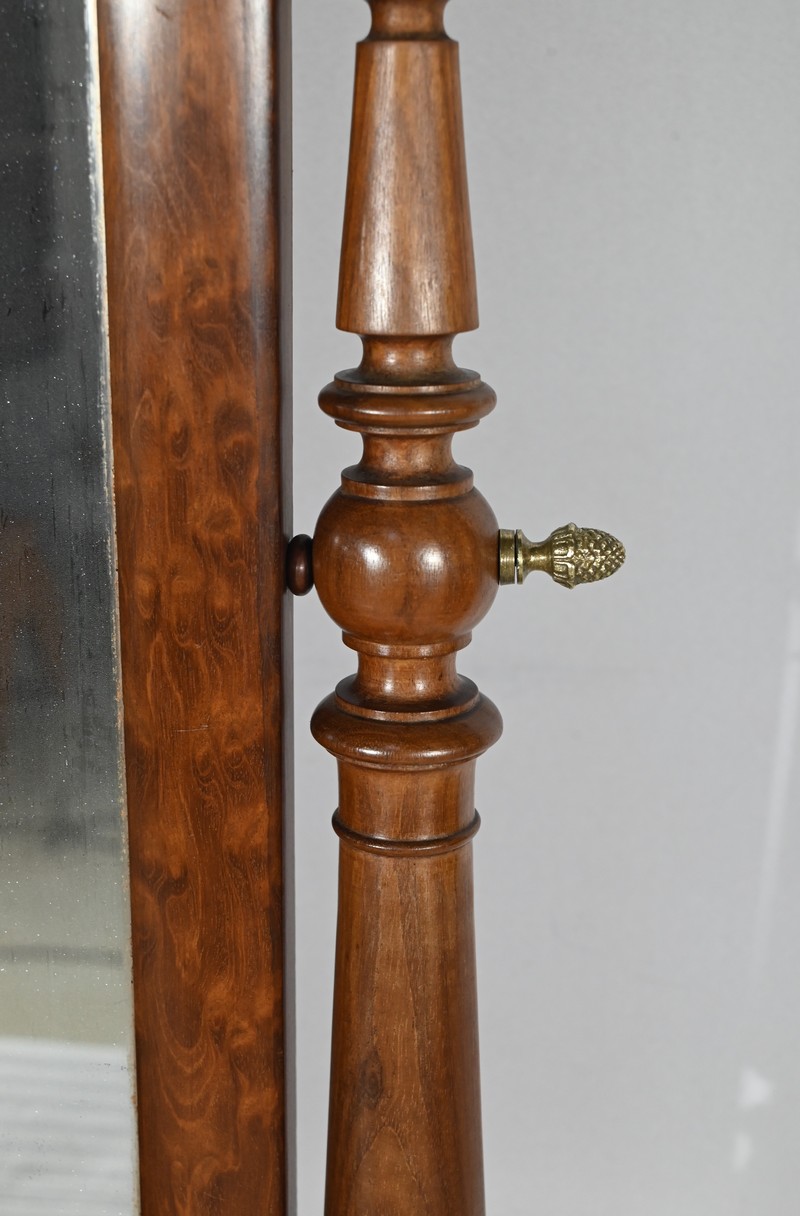 Ce miroir psyché ouvre par un tiroir à bouton bois tourné à façade en moucheté d’acajou.