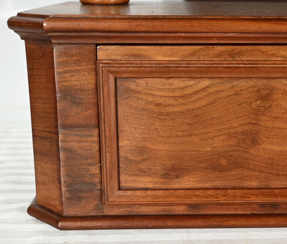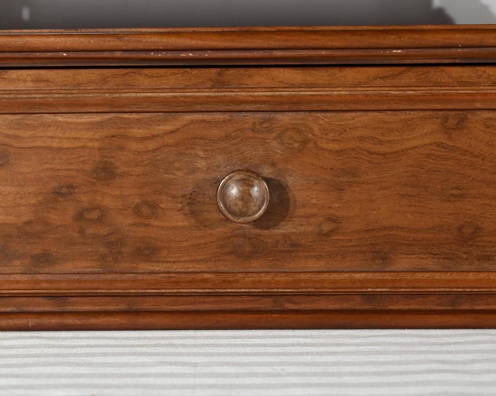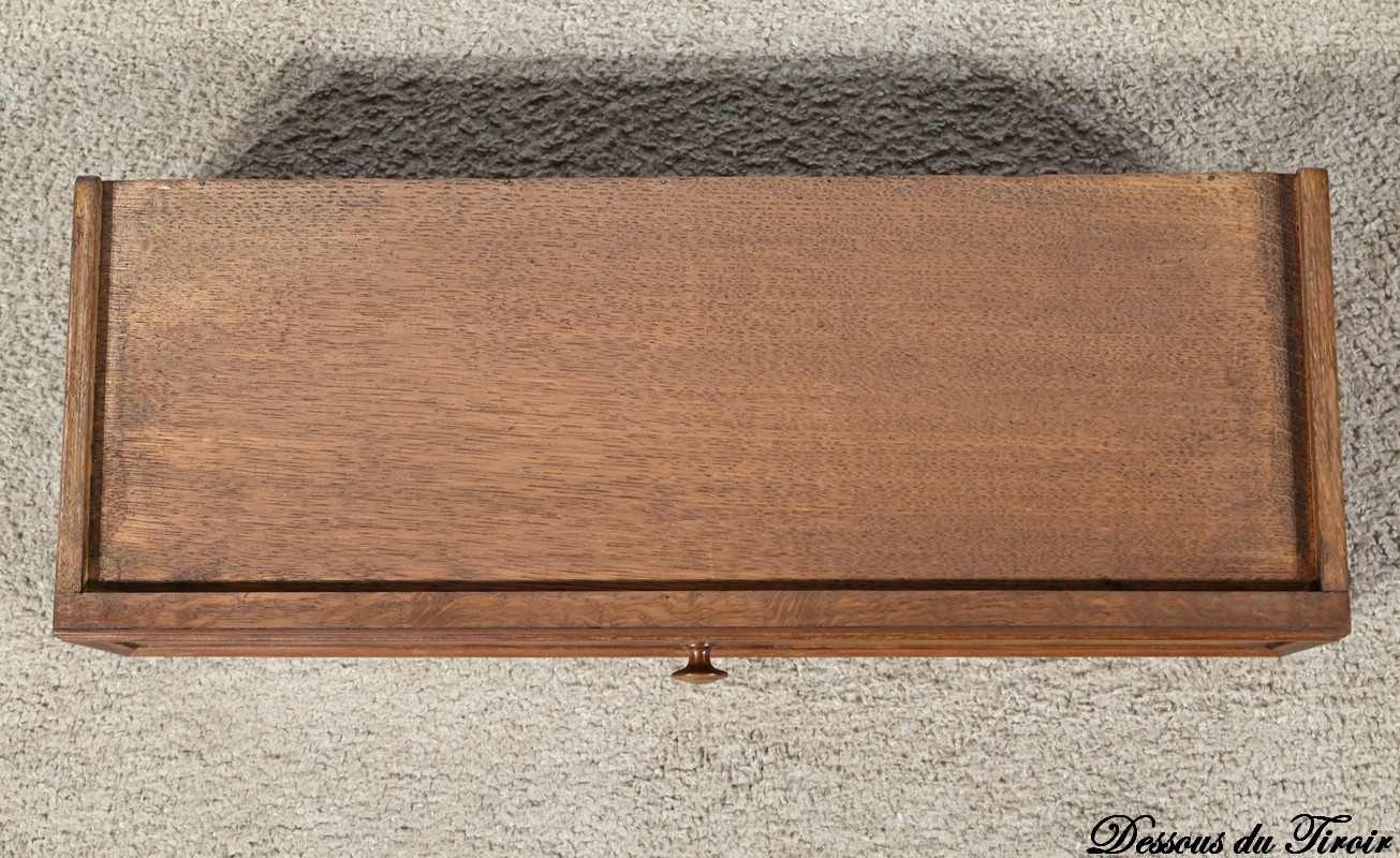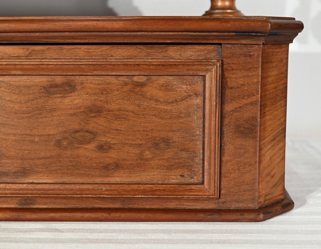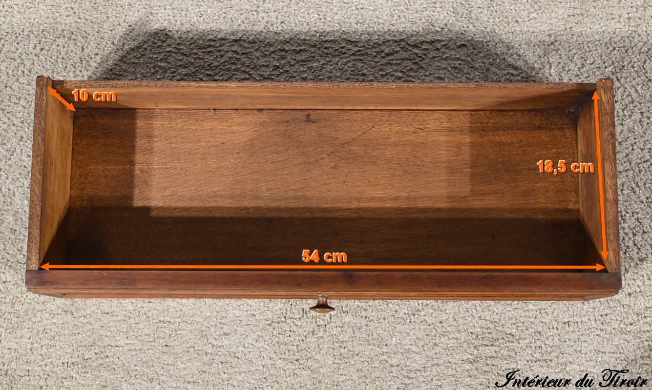 Ce miroir psyché ouvre par un tiroir à bouton bois tourné à façade en moucheté d’acajou.