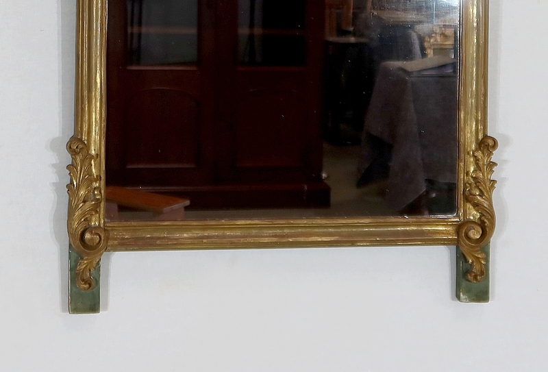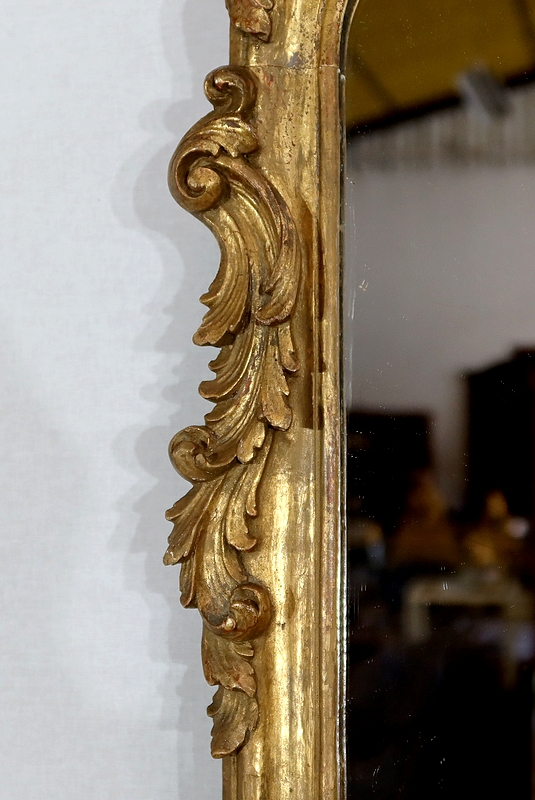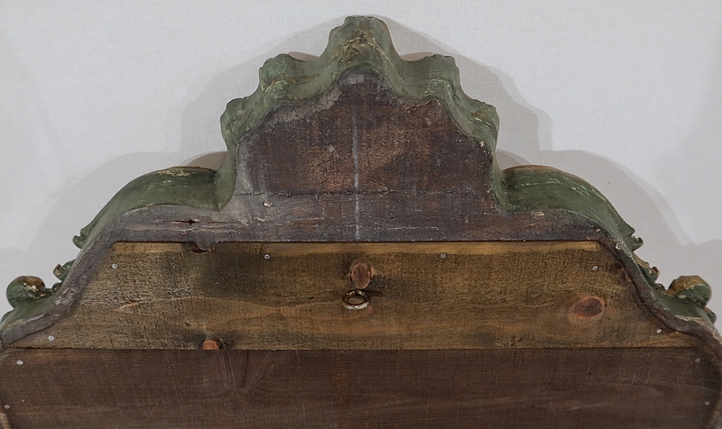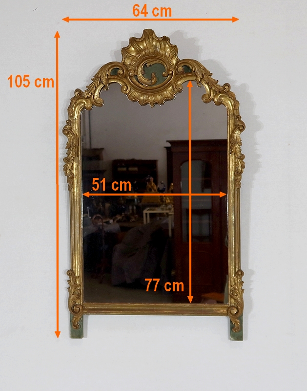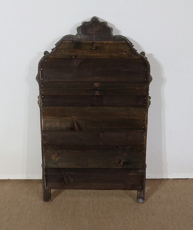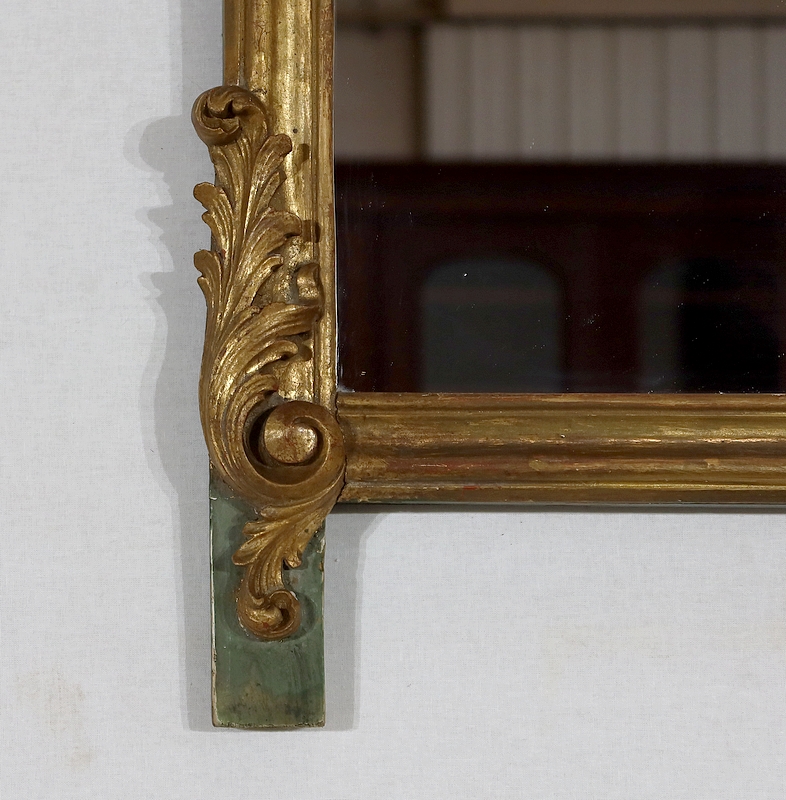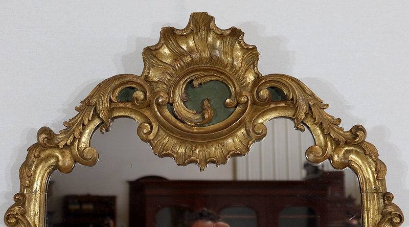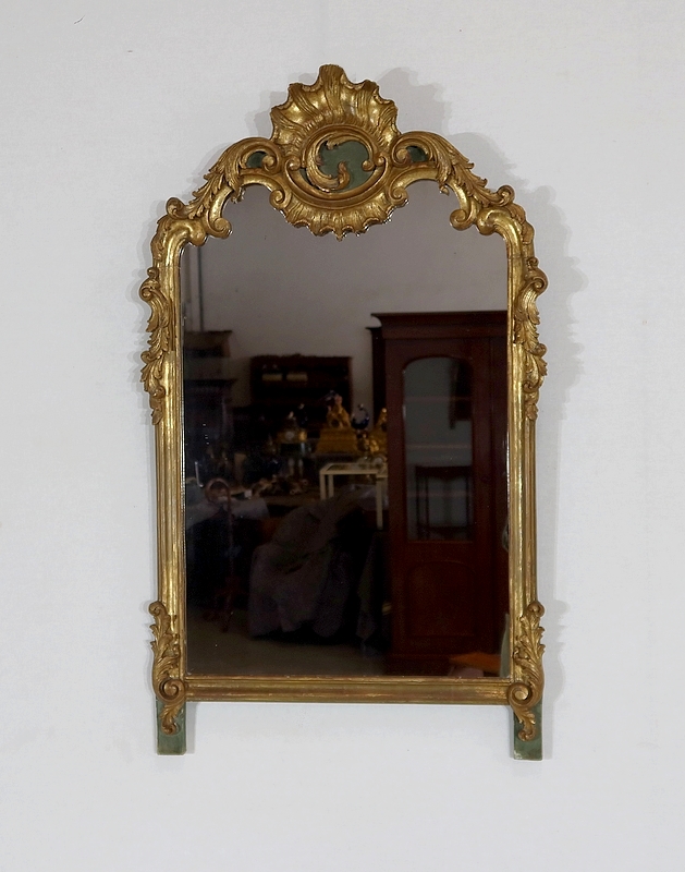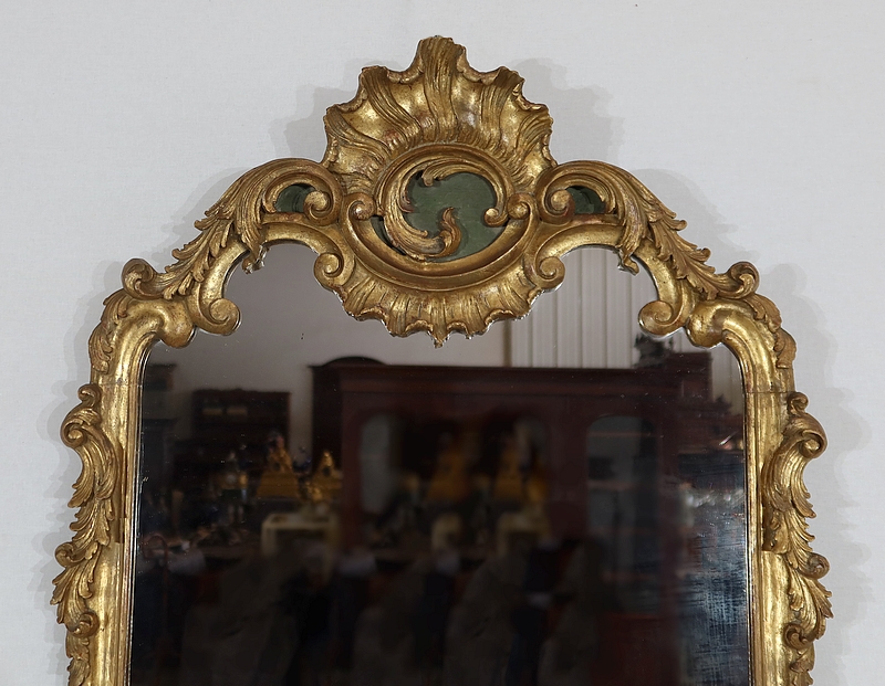 Superbe miroir de style Rocaille sommé d’un fronton majestueux formant une grande coquille avec volute asymétrique caractéristique du style Louis XV. Mise en relief par le bois teinté de vert, cette gracieuse ornementation est entourée de feuilles d’acanthe et de volutes stylisées.