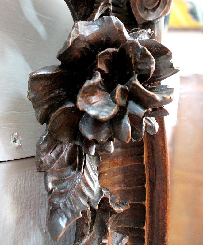 Ce dernier, Intégralement composé de Noyer massif, est Richement Sculpté de Volutes, de Fleurs, de Feuilles Entrelacés et d’Arabesques.
