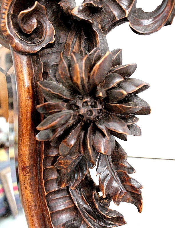 Sa glace au Mercure, est biseautée et Mouvementée sur son pourtour. Elle est bordée d’une baguette arrondie et Moulurée, puis d’un Encadrement Joliment Découpé.