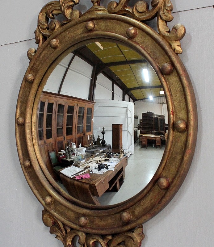 On notera que la Dorure laisse deviner de Discrètes et Subtiles nuances de Rouge, ajoutant à la Personnalité de cet Objet Ornemental. De plus, sa Glace Bombée permet une diffusion de Lumière différente des autres modèles plus courants, et un angle de vue plus important. C’est pourquoi – parenthèse historique – cet accessoire Tendance était autrefois appelé ‘Troisième Oeil’, puisqu’il permettait aux banquiers et aux marchands de surveiller l’ensemble de leurs bureaux ou de leurs boutiques. On attribuait également des vertus Magiques aux Miroirs Sorcières, comme le pouvoir d’observer les domestiques en l’absence de leurs maîtres, ou bien celui de protéger leurs propriétaires. Vous l’aurez compris, on s’offrira à travers ce Miroir bien plus qu’un simple élément de Décoration …