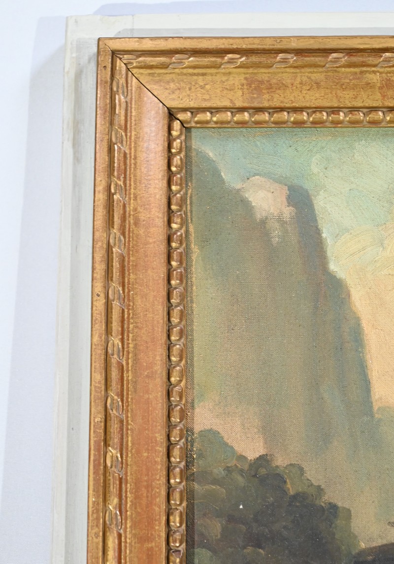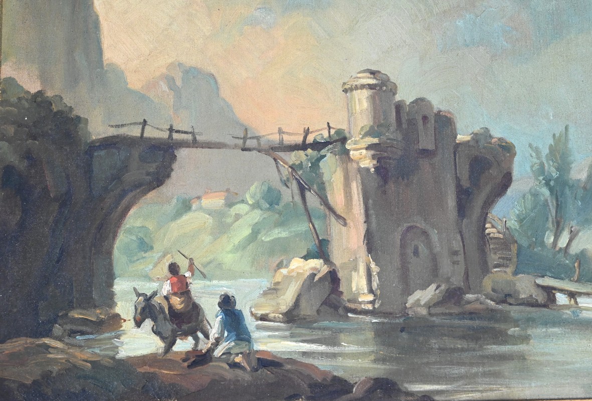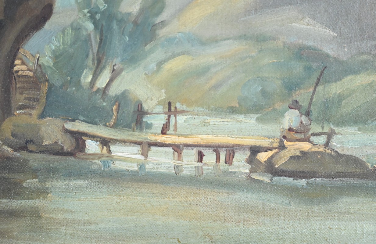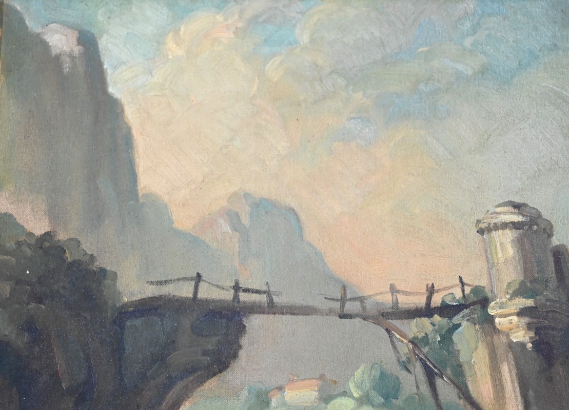 La partie supérieure est agrémentée d’une peinture à l’huile sur toile représentant une petite maison de pécheur bâtie sur un rocher au plein milieu d’une rivière et accessible par un pont en bois. Le paysage est montagneux et boisé.