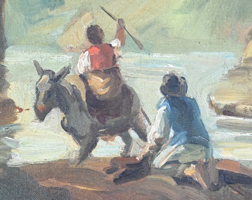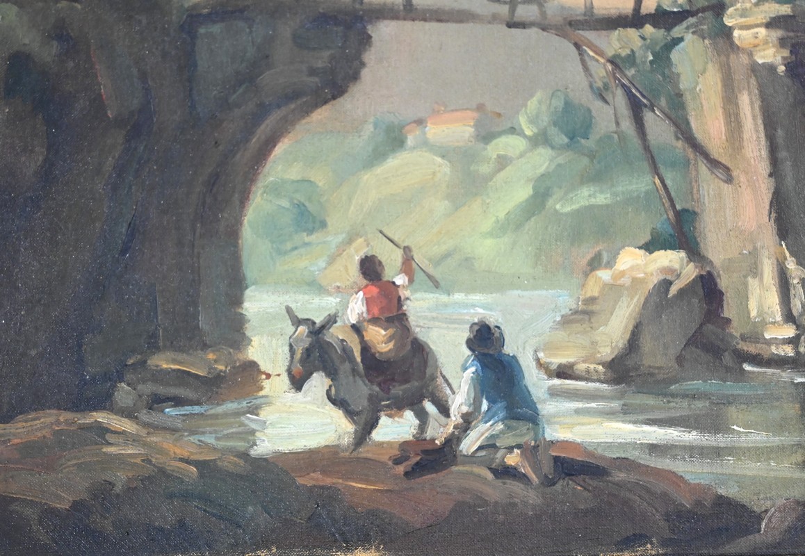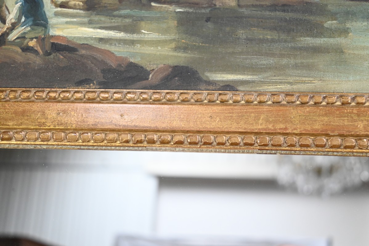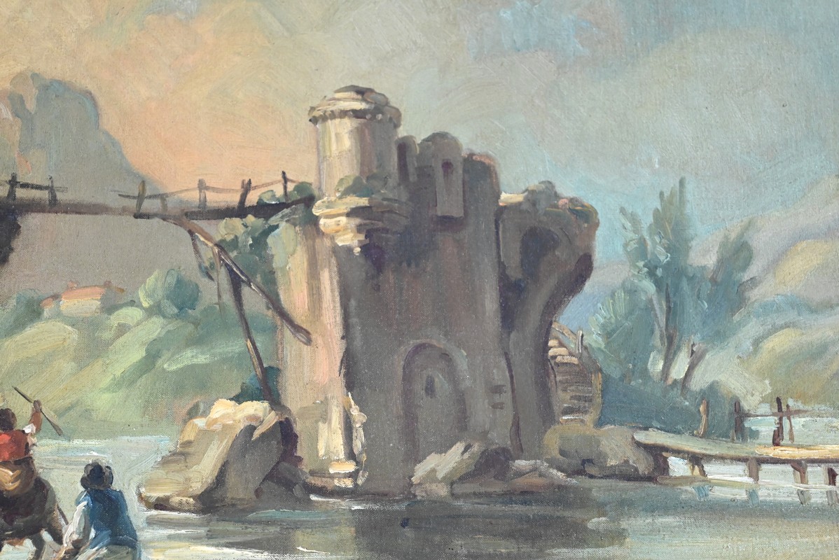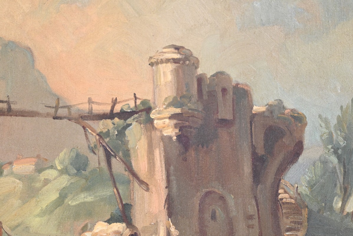 La partie supérieure est agrémentée d’une peinture à l’huile sur toile représentant une petite maison de pécheur bâtie sur un rocher au plein milieu d’une rivière et accessible par un pont en bois. Le paysage est montagneux et boisé.