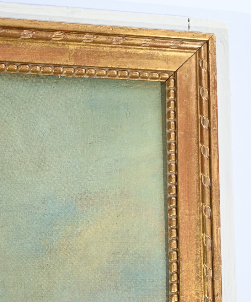 Ces éléments sont ceints par un cadre, en bois doré, perlé et festonné.