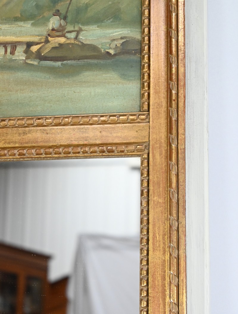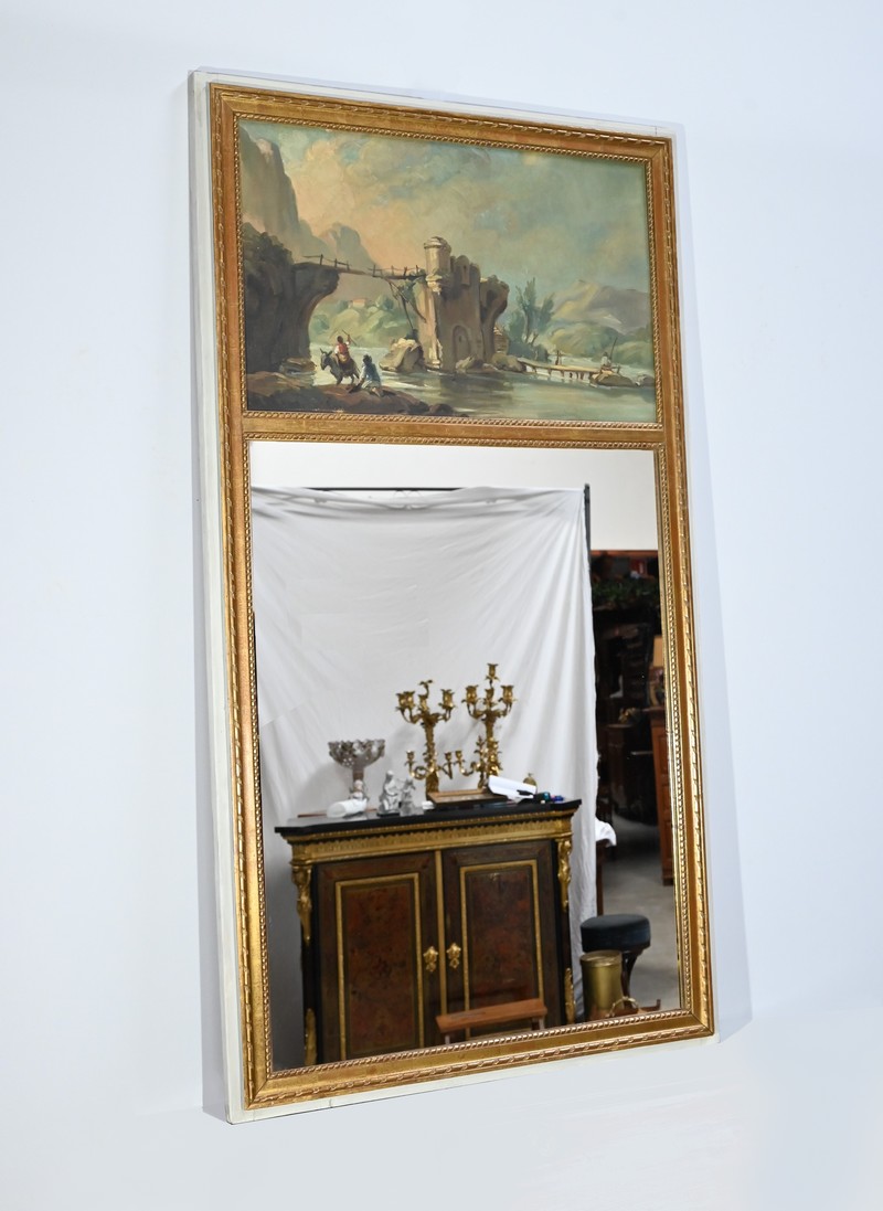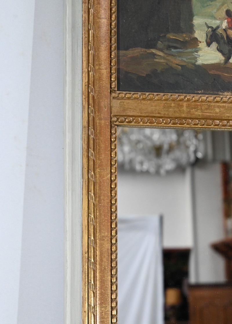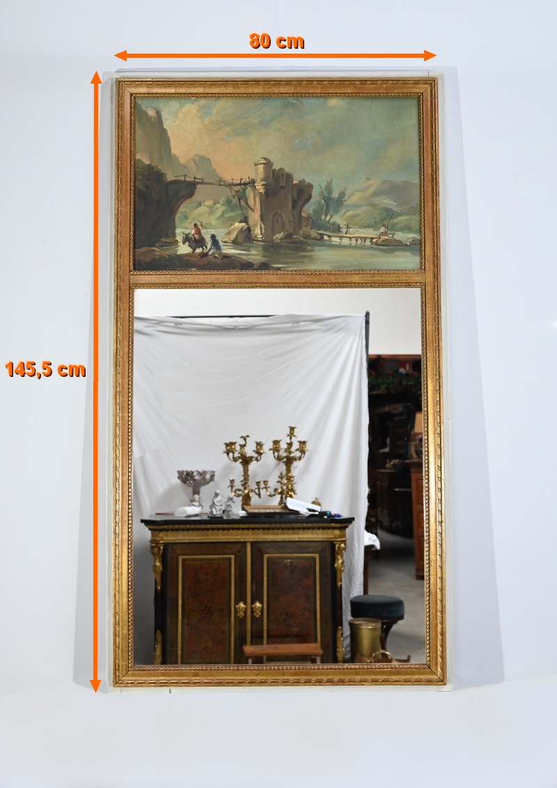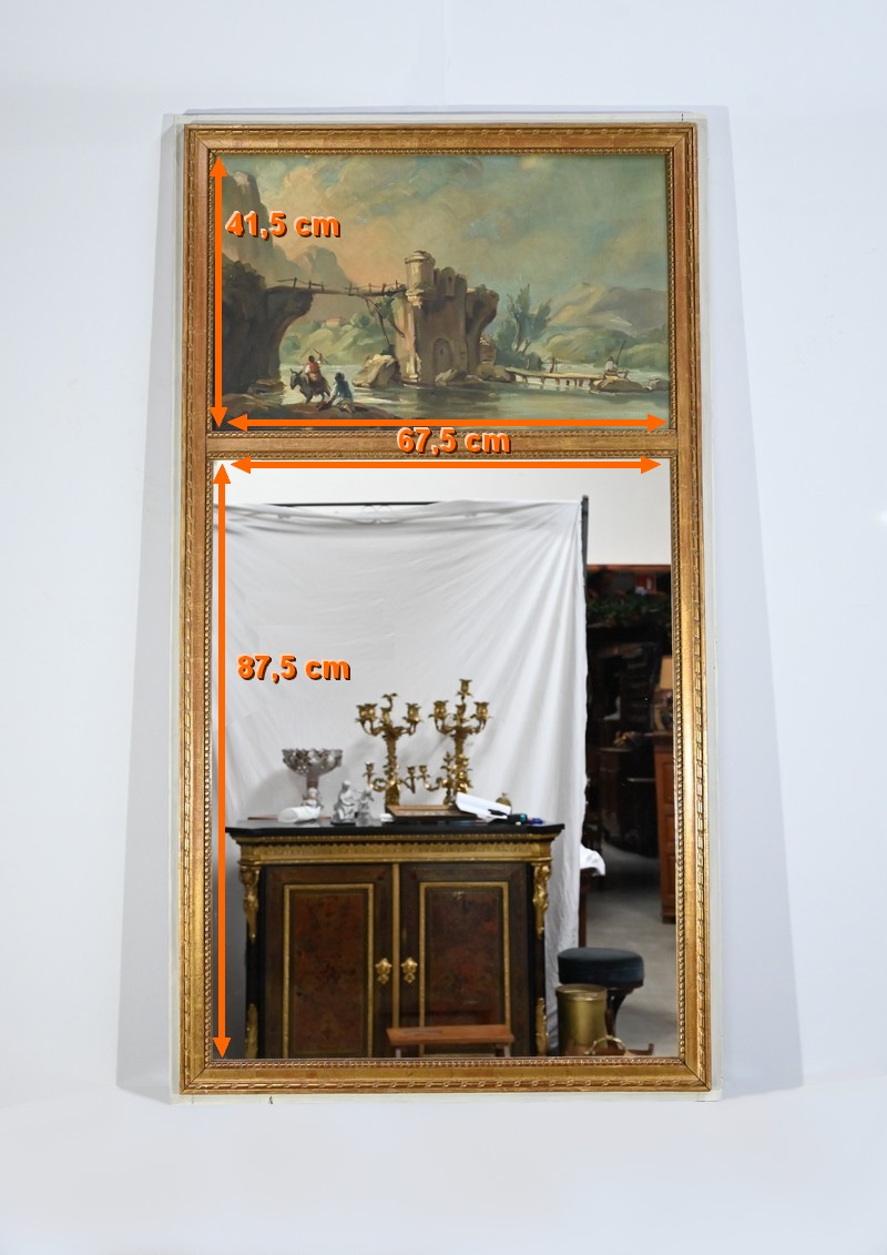 Ce miroir trumeau présente en partie inférieure une importante glace occupant environ deux tiers de la surface.