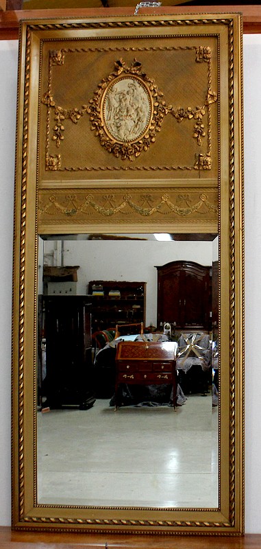 Grand Miroir Trumeau composé d’une Glace au Mercure Biseautée en Parfait état et d’un panneau Rectangulaire en partie supérieur finement Décoré.