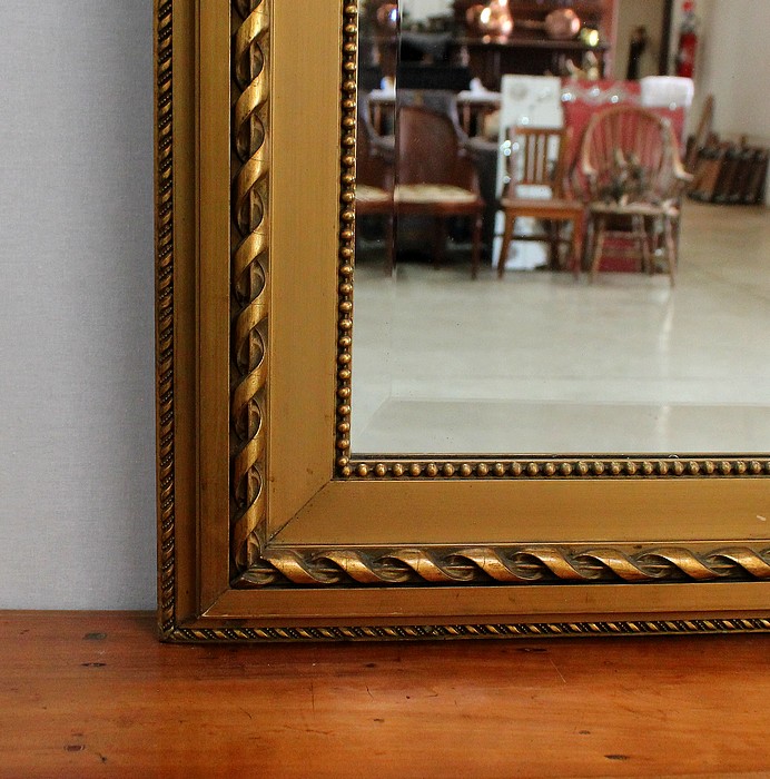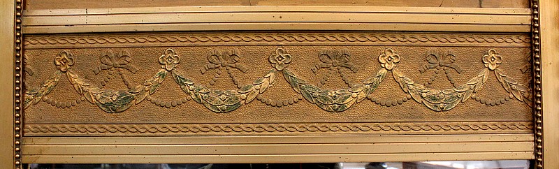 Cette Glace bénéficie d’un Cadre à Coupe d’onglet agrémenté de Guirlandes de Perles et de Moulures Enrubannées.