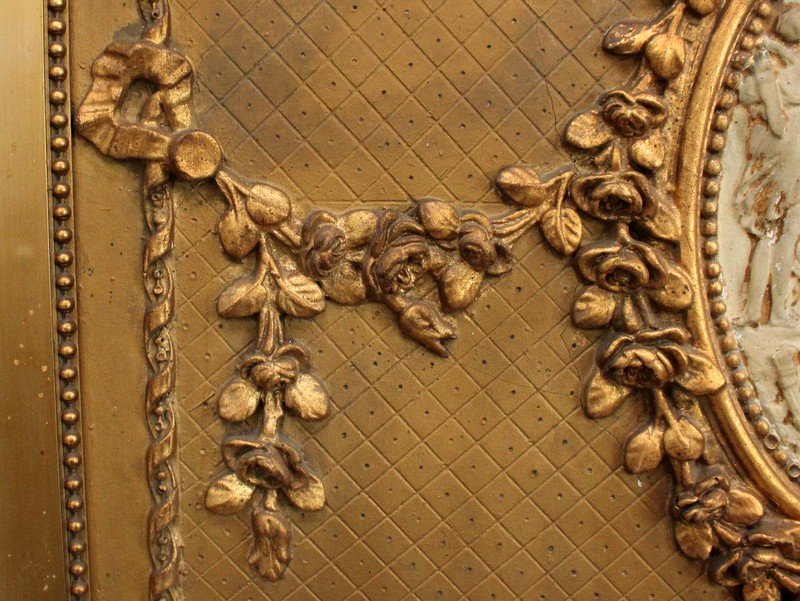 En partie supérieure, un Bas-relief en Albâtre de forme Ovale représente une Scène Romantique animée de Femmes et d’Animaux. Surmontée d’ un Nœud, entourée d’une Guirlande Perlée et d’une Couronne de Fleurs, cette Sculpture centrale est encadrée de Rubans et d’Ornementations florales.