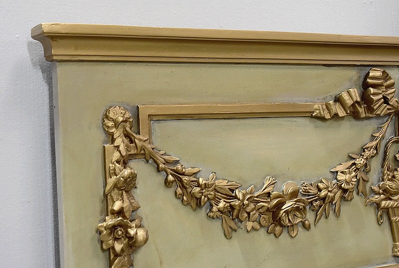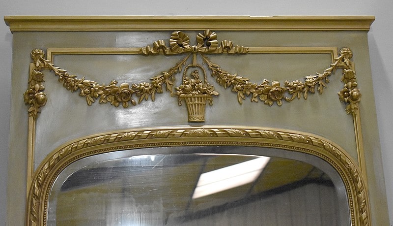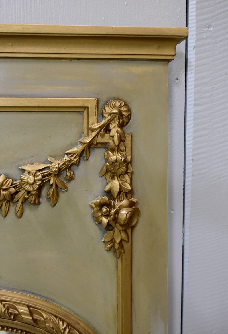 Miroir Trumeau de style Louis XVI en bois rechampi et stuc doré.