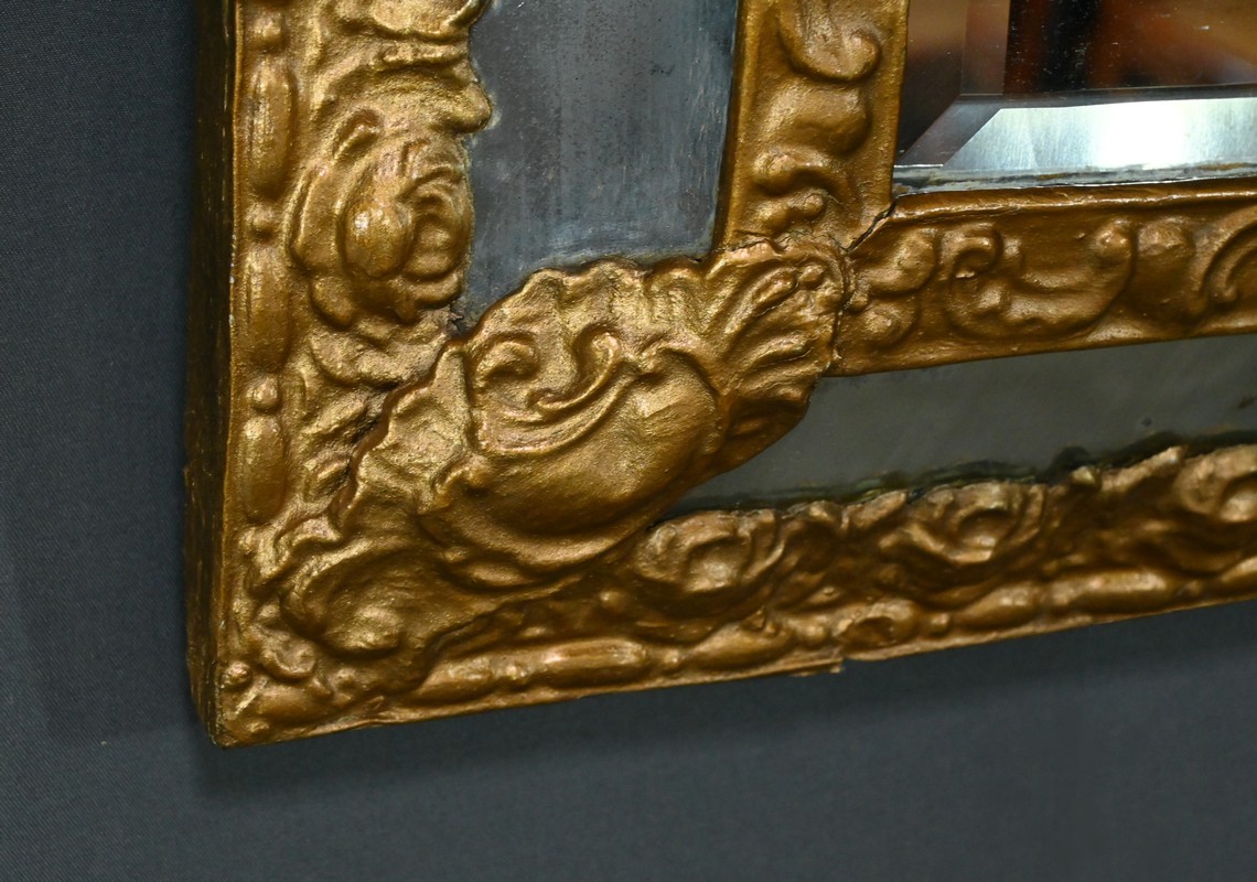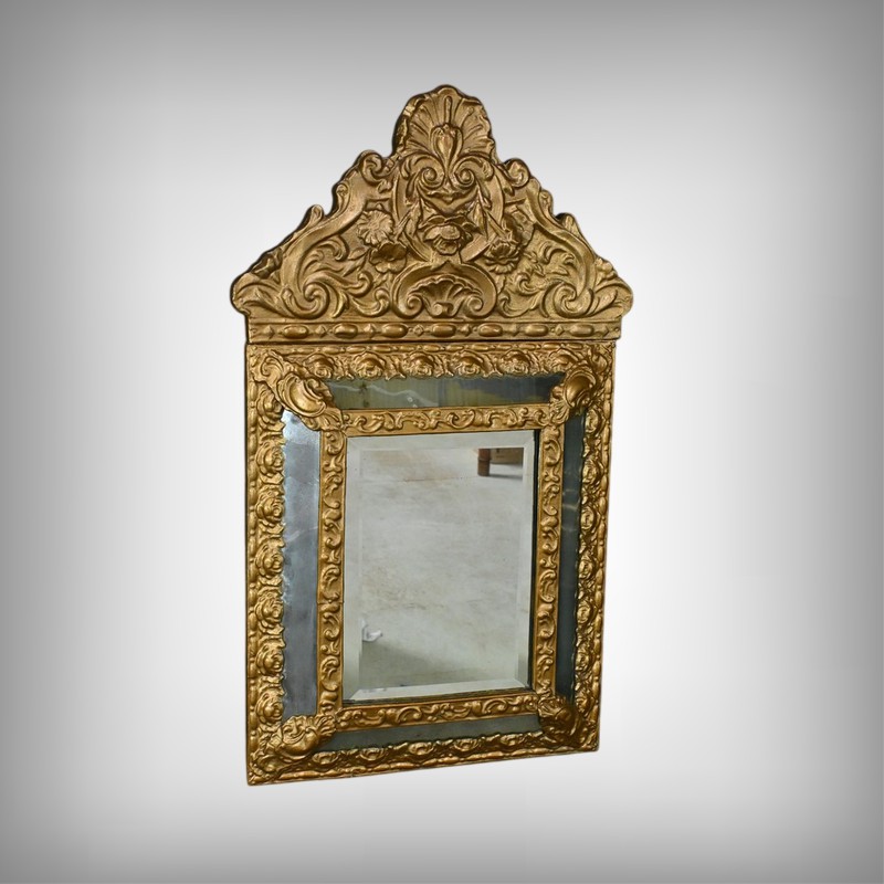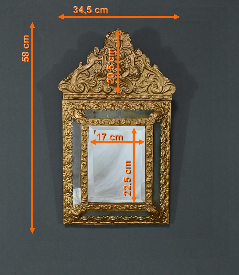Arborant 5 glaces au mercure , ce miroir à parcloses en laiton repoussé peint est une véritable pièce d’ornement, mêlant finesse et sophistication.