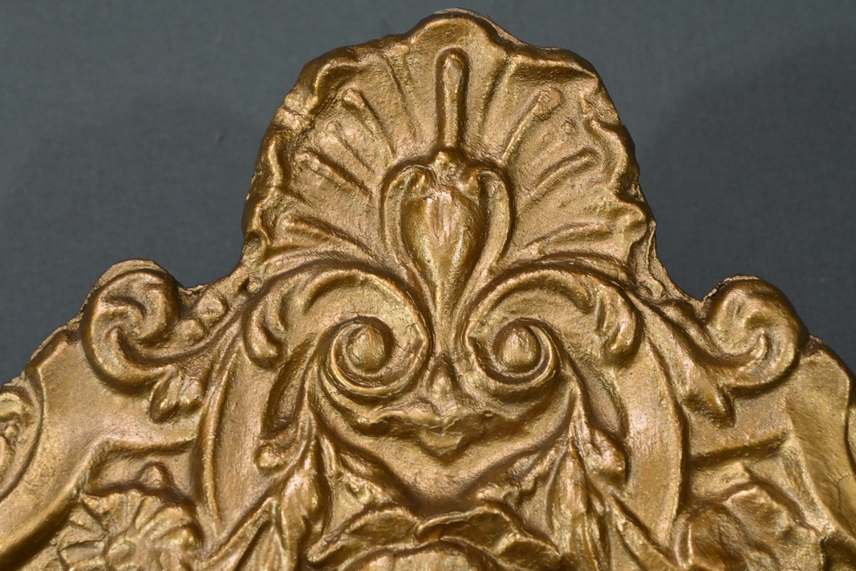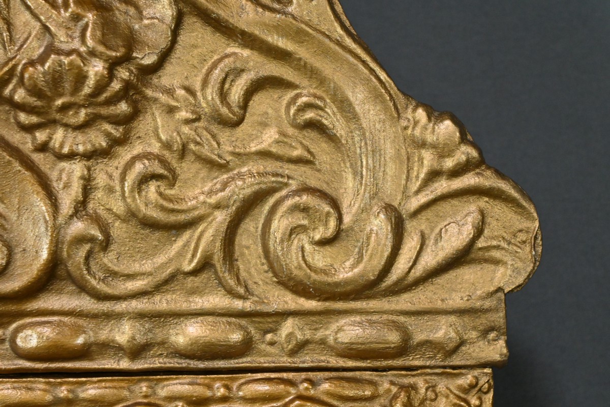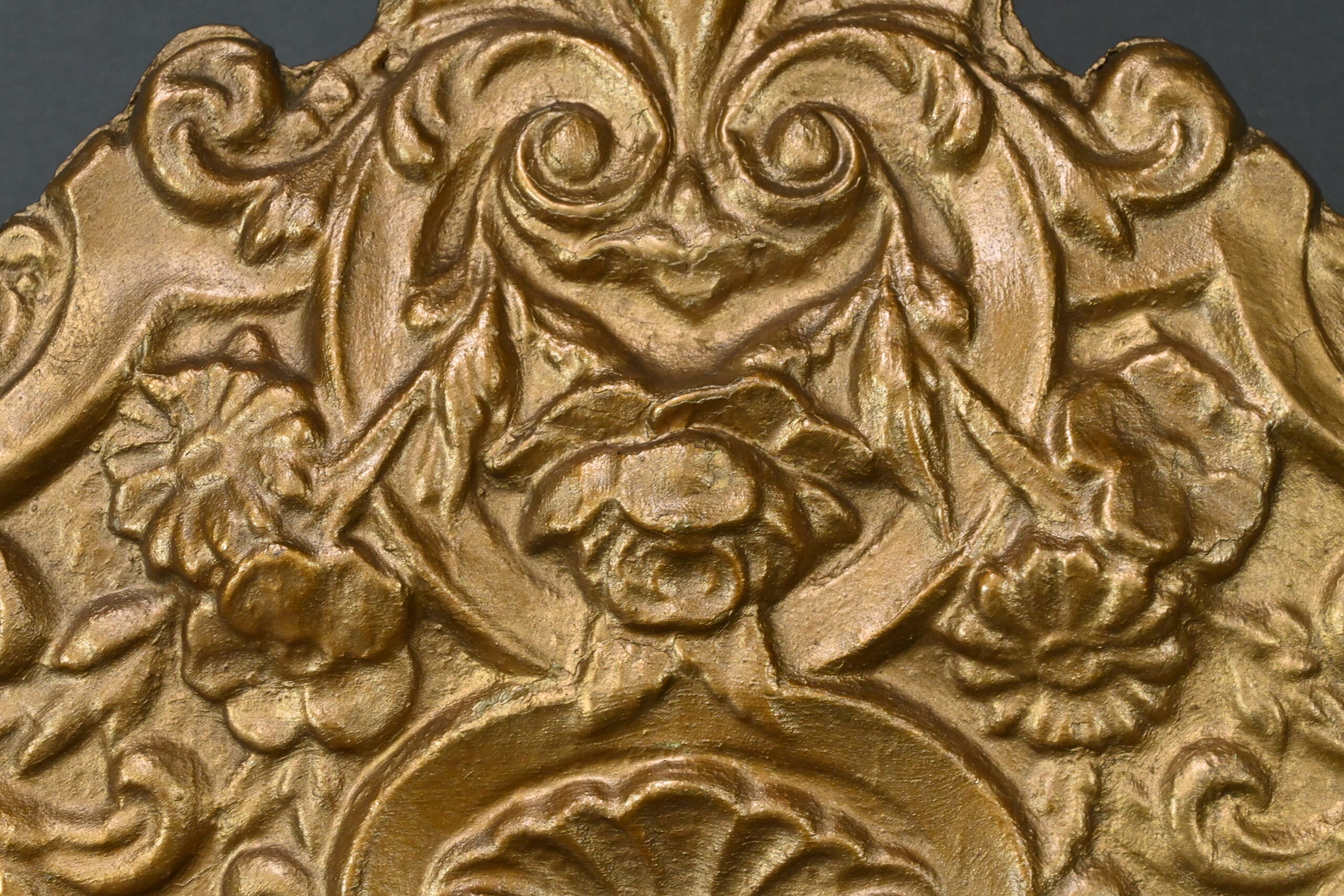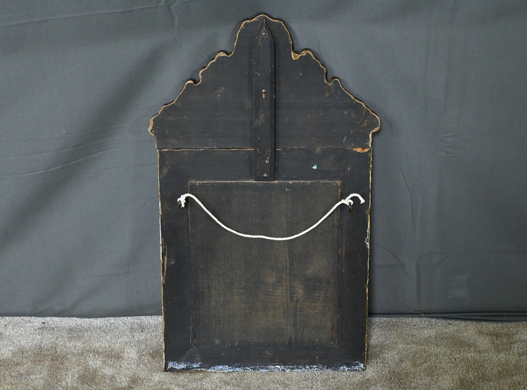 Son cadre minutieusement ouvragé se distingue par une riche décoration de volutes et de rinceaux, évoquant l’élégance des styles baroque et rococo.