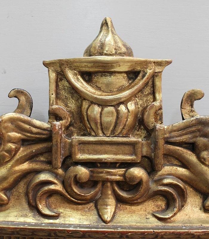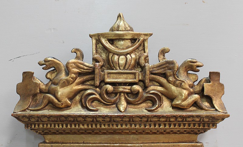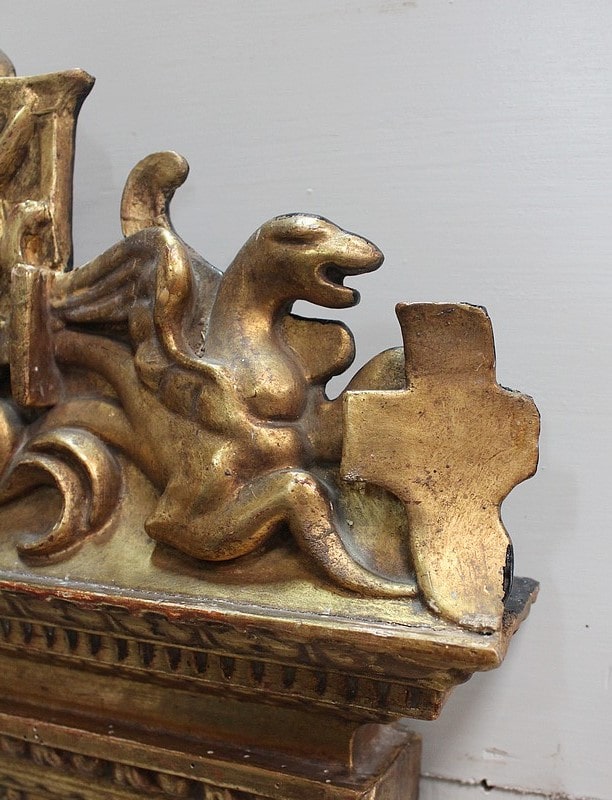 Il est pourvu d’un Fronton à Décors d’Animaux Ailés de part et d’autre d’un Blason. La scène repose sur une base enjolivée de frises rappelant celles évoquées plus haut et que l’on retrouvera également en partie basse.