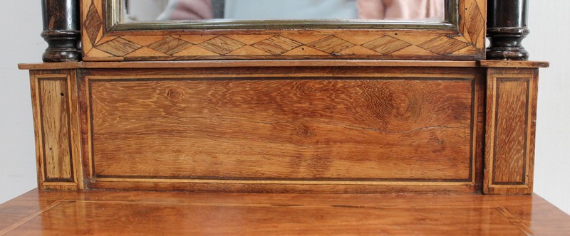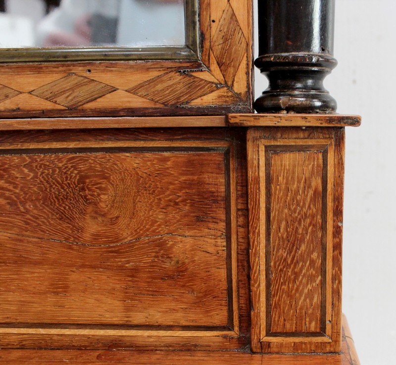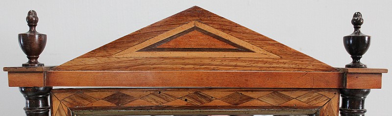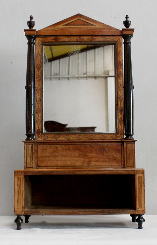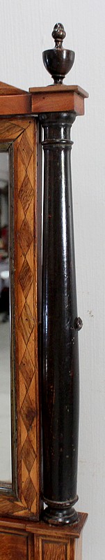 Elle se compose d’une Glace au Mercure d’Origine, montée sur un Châssis Inclinable à Volonté, et entourée d’un Jonc en Laiton vieilli et de Motifs géométriques lumineux. Cette partie Miroir est surmontée d’une Pyramide Stylisée et Élégante, et deux Colonnes Cylindriques Laquées Noires coiffées de Bobèches sont postées de part et d’autre.