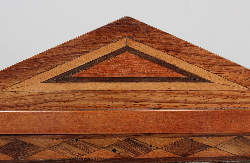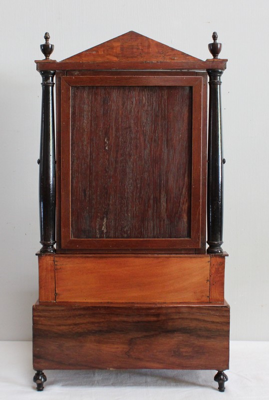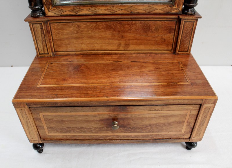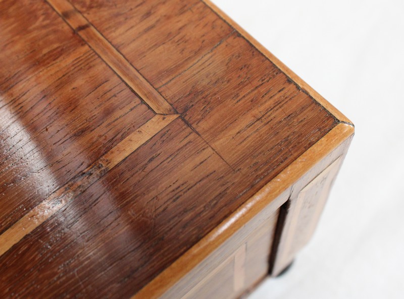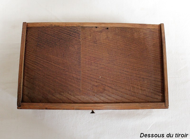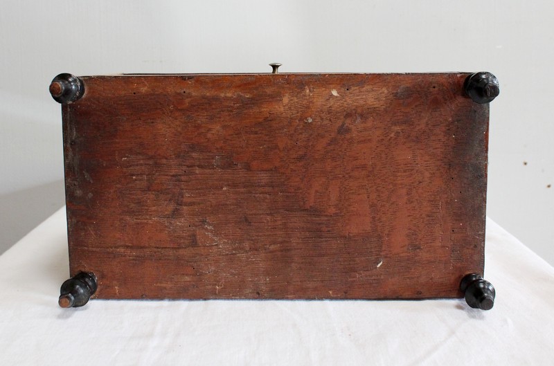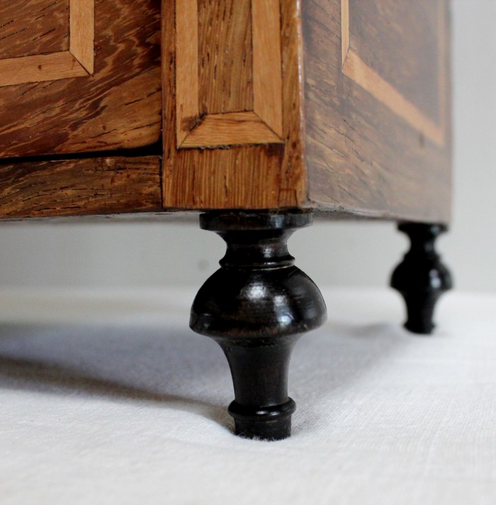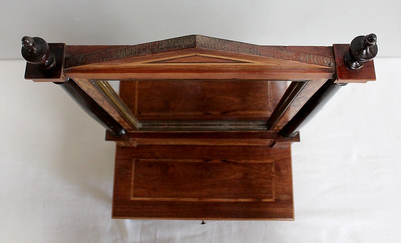 La partie basse de ce Bien offre un petit tiroir de 9 cm de profondeur. Sa façade est enjolivée d’un Joli Filet de Citronnier formant encadrement, que l’on retrouve sur le dessus, les côtés et les montants avant de cet élément inférieur.