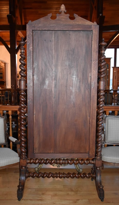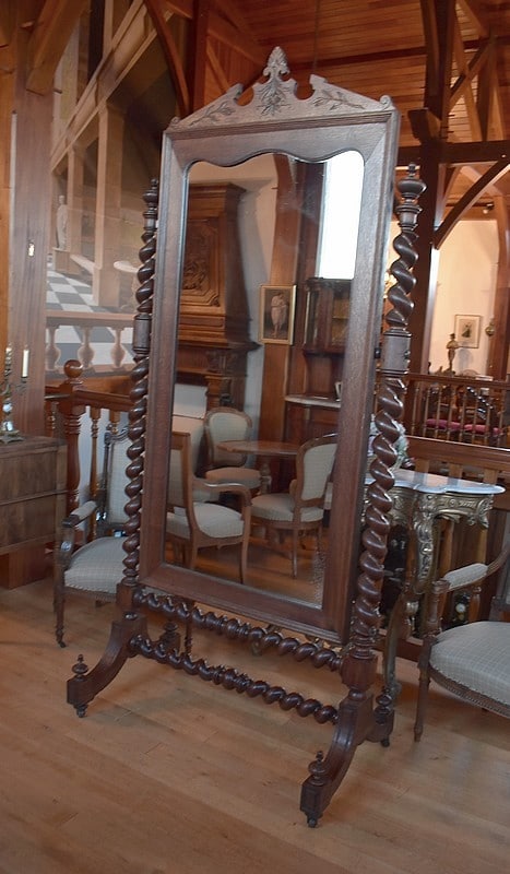 Grande psyché de style Louis XIII en chêne. Le miroir, avec encadrement surmonté d’un fronton sculpté de feuilles, est entouré de 2 colonnes torsadées.