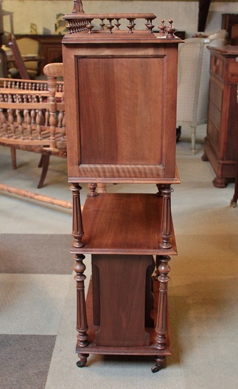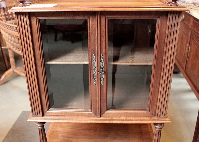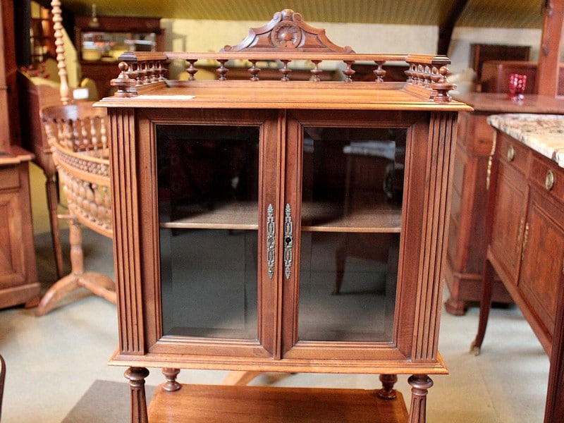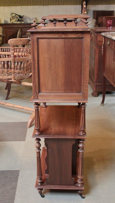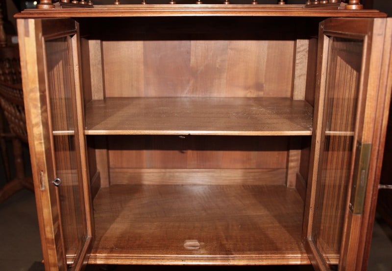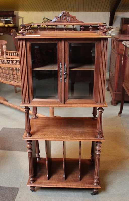 Étagère à musique en noyer dans le goût Louis XVI, époque 1920. La partie haute ouvre par 2 petites portes vitrées (avec verres biseautés) et est entourée sur 3 faces d’une galerie bois avec sculpture en fond. Les montant et les colonnes sont à cannelures. Elle repose sur 4 petits pieds ronds sur roulettes. Époque 1920.