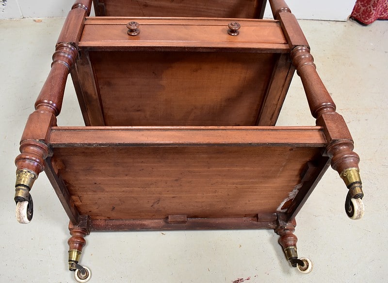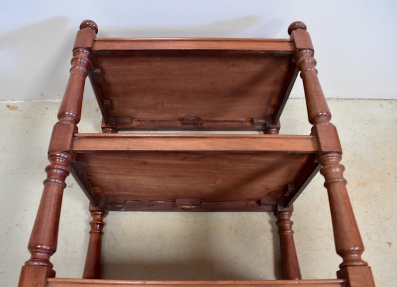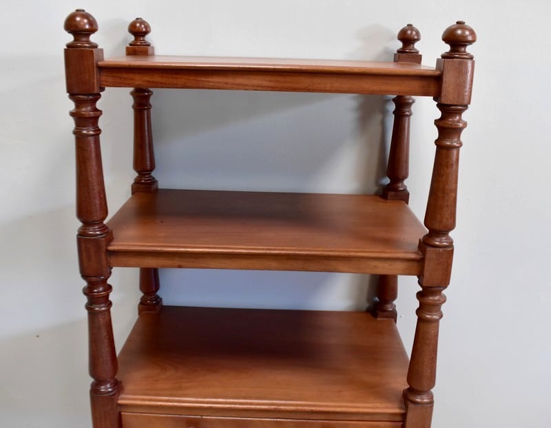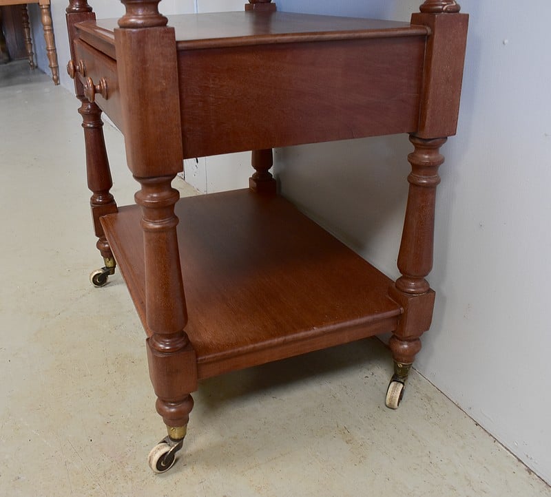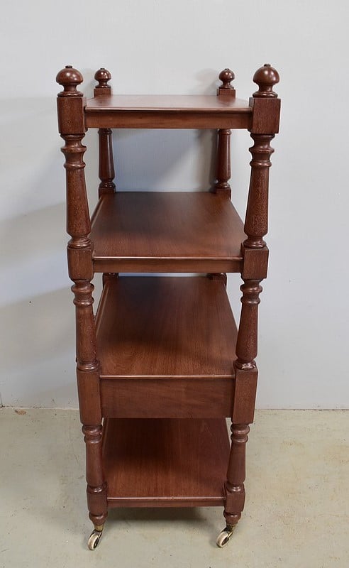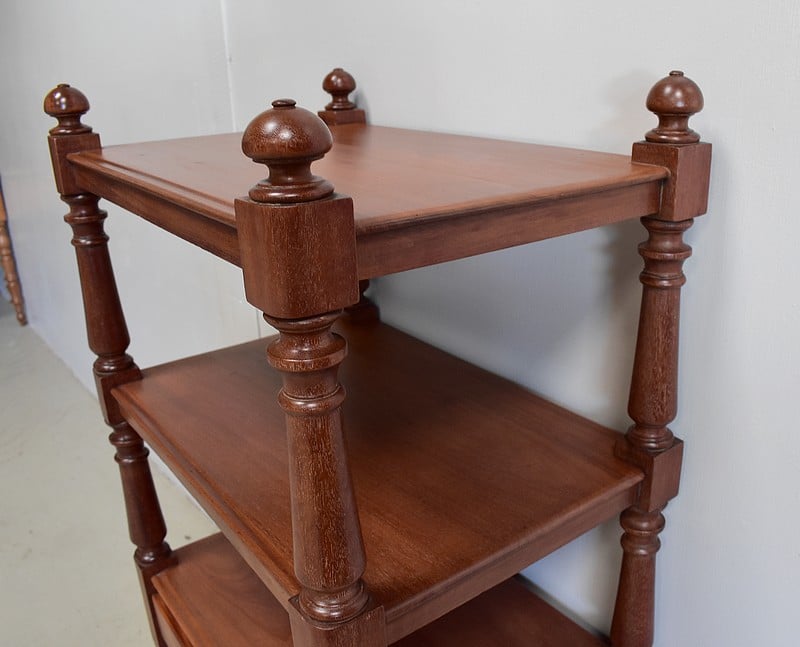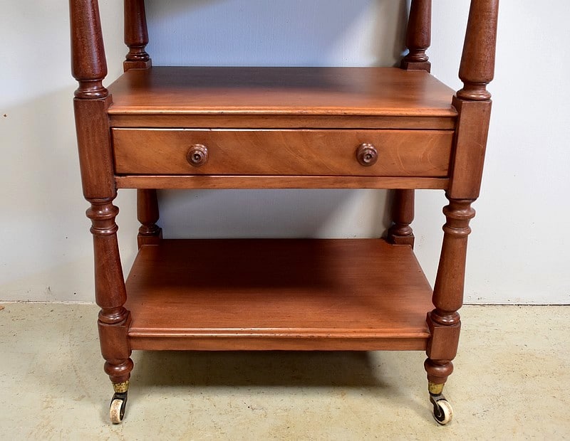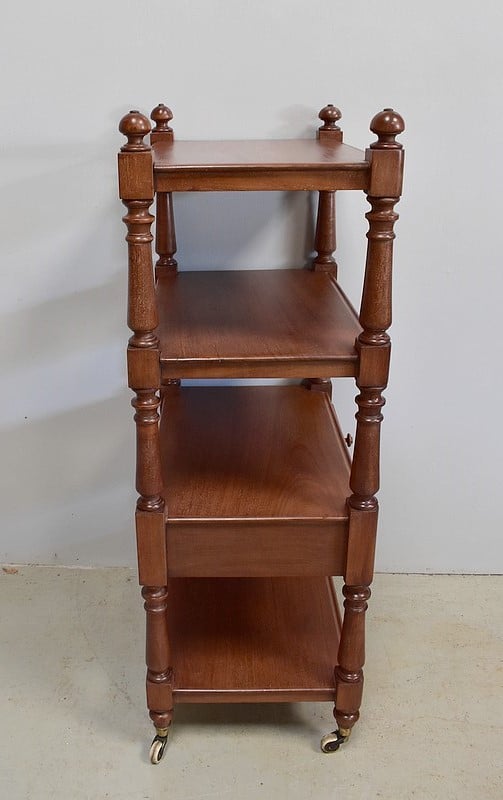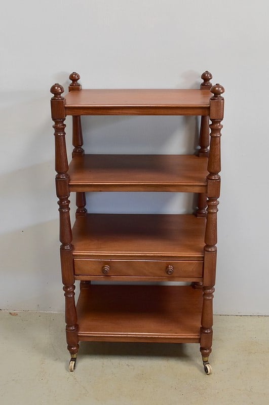 Étagère desserte en acajou blond à 4 plateaux et ouvrant par un tiroir sous le troisième plateau.