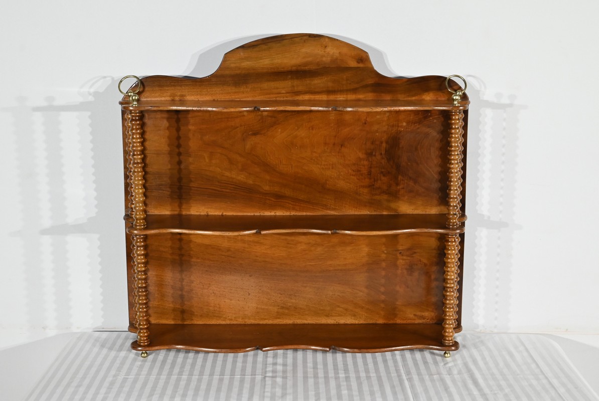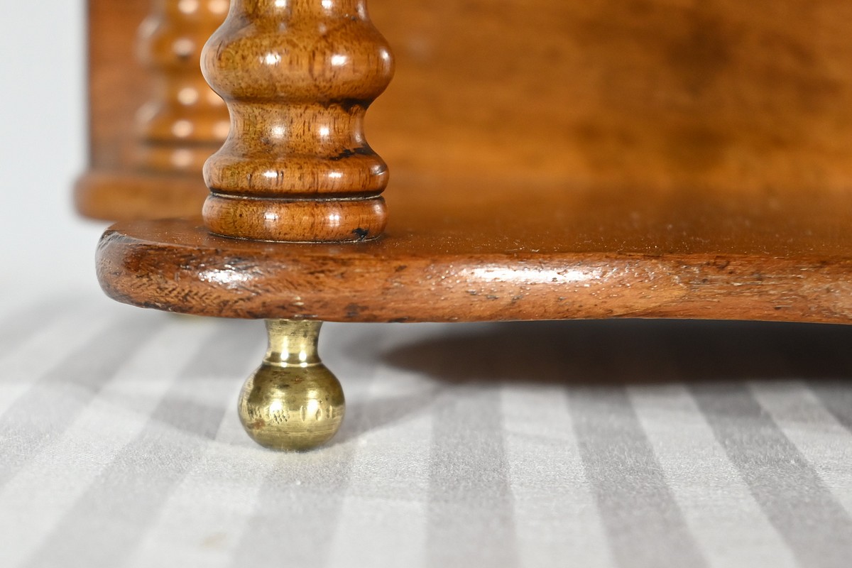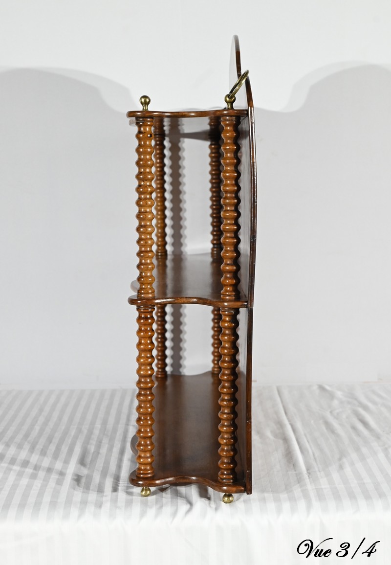 Cette étagère en noyer à trois niveaux présente des montants tournés en bobine sommés de petites boules et d’anneaux en laiton.