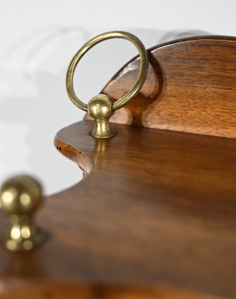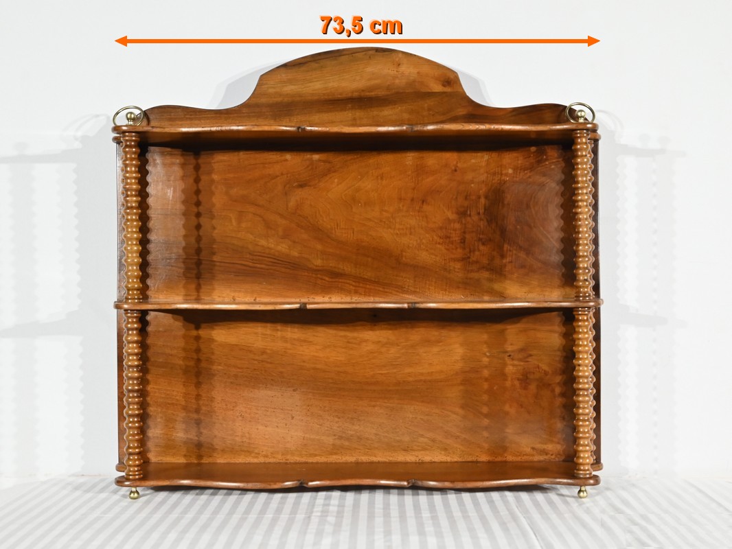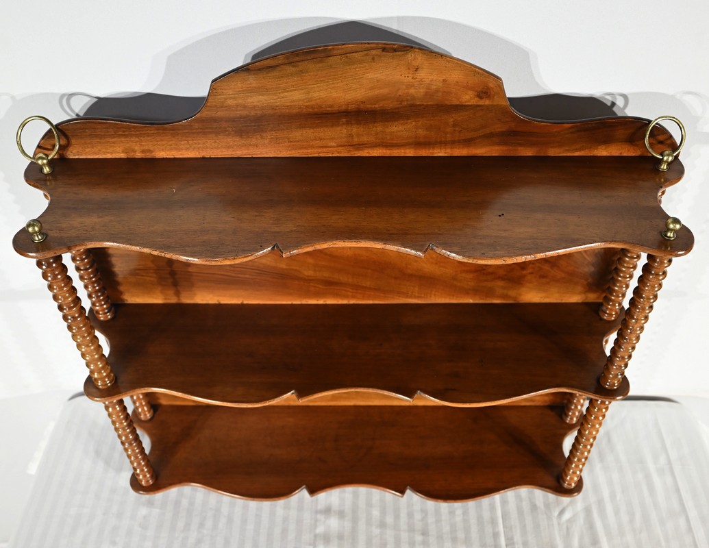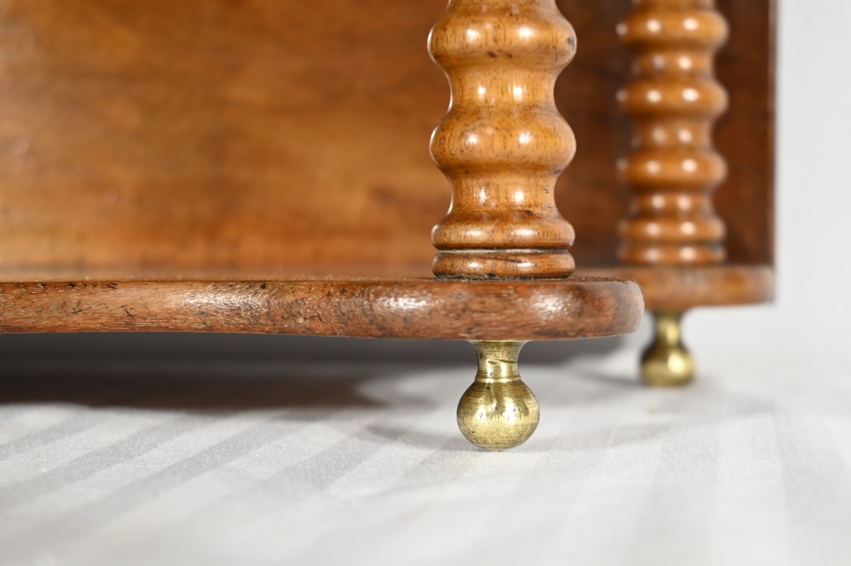Cette étagère en noyer à trois niveaux présente des montants tournés en bobine sommés de petites boules et d’anneaux en laiton.