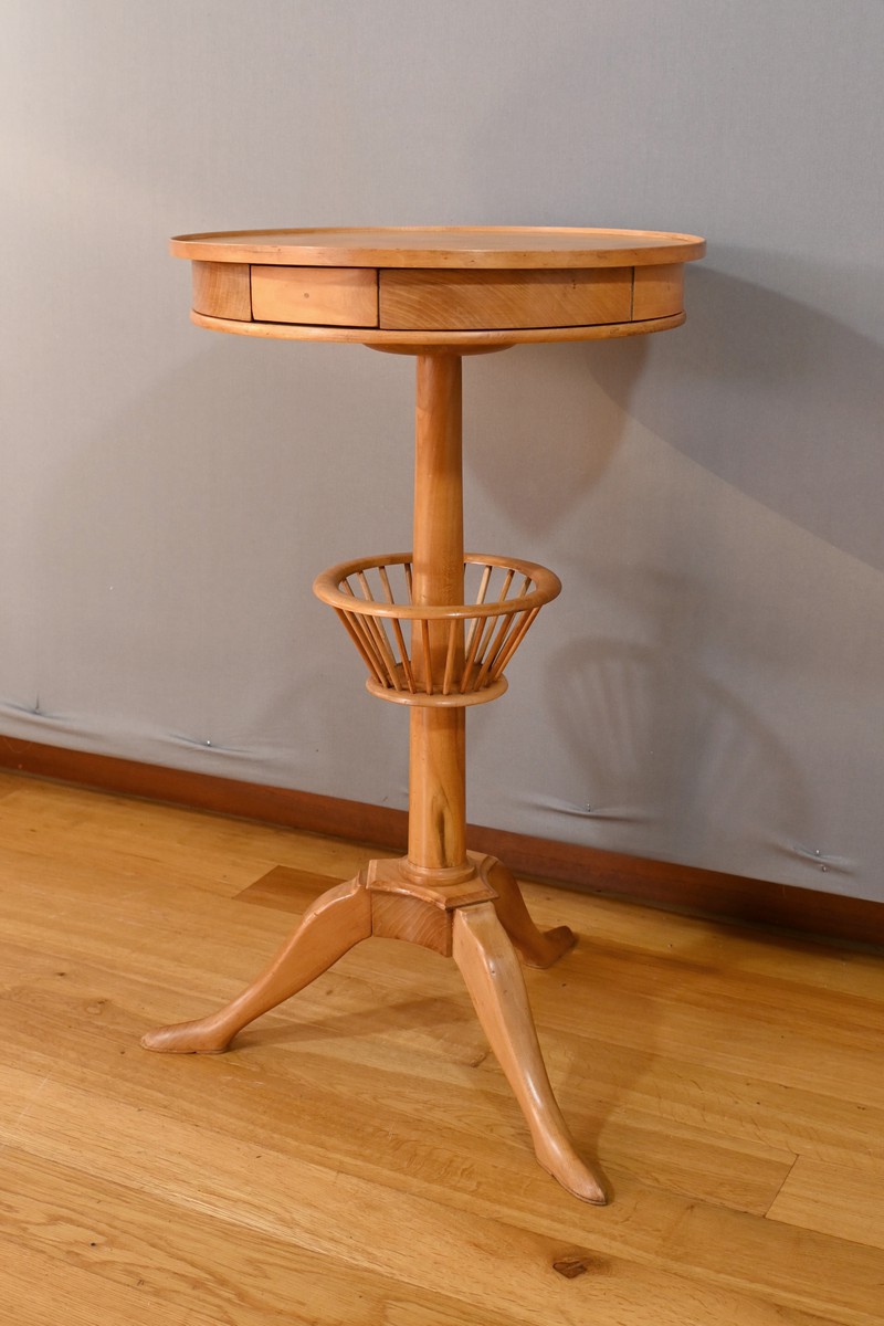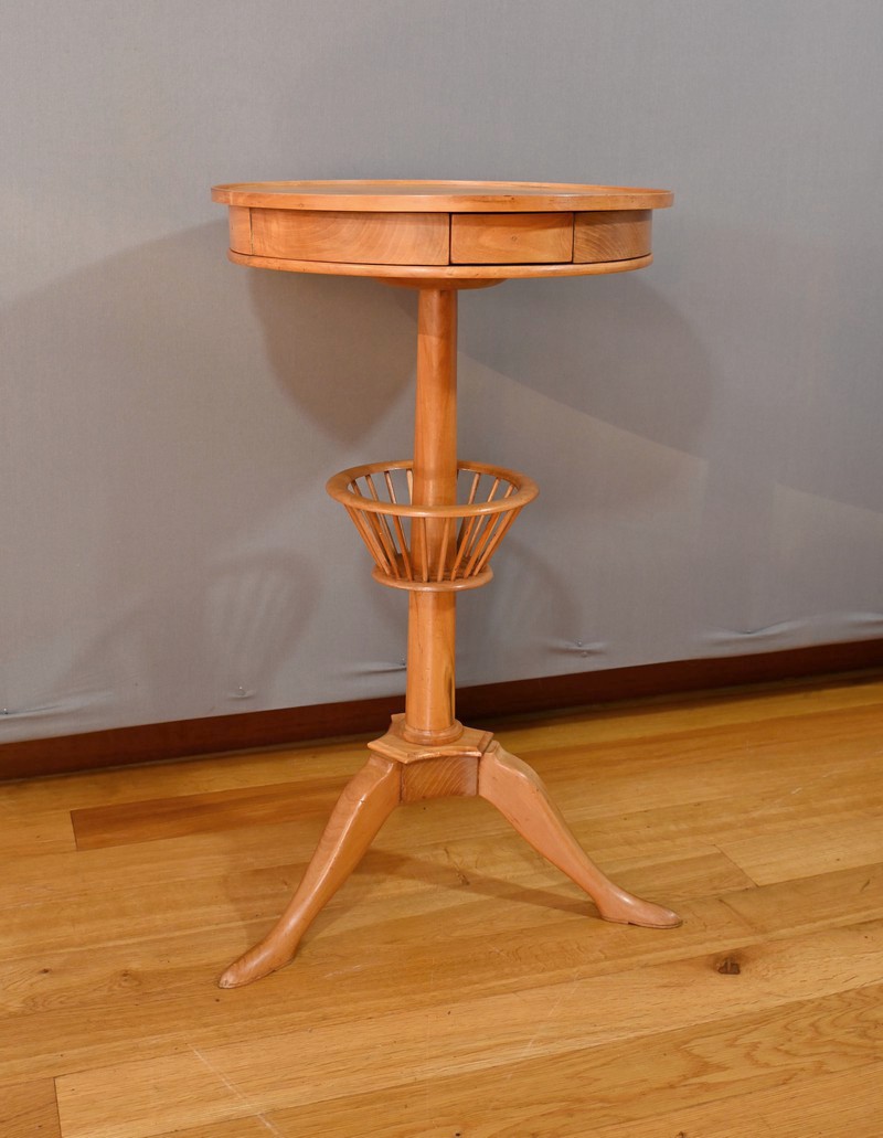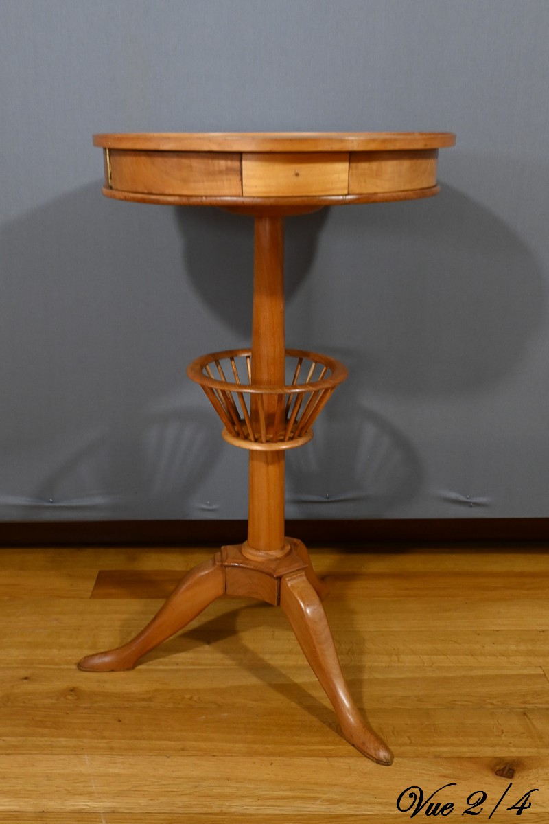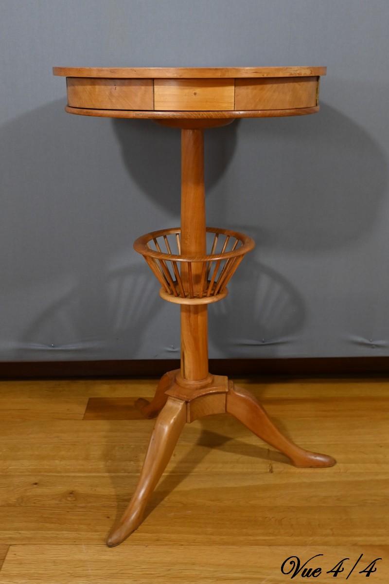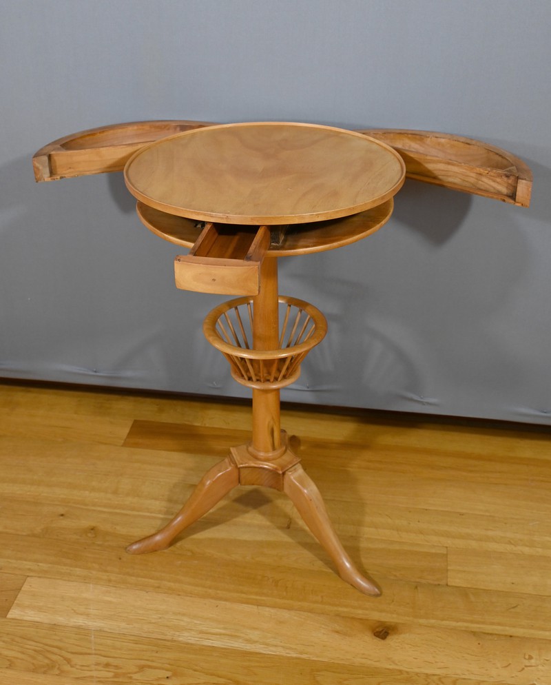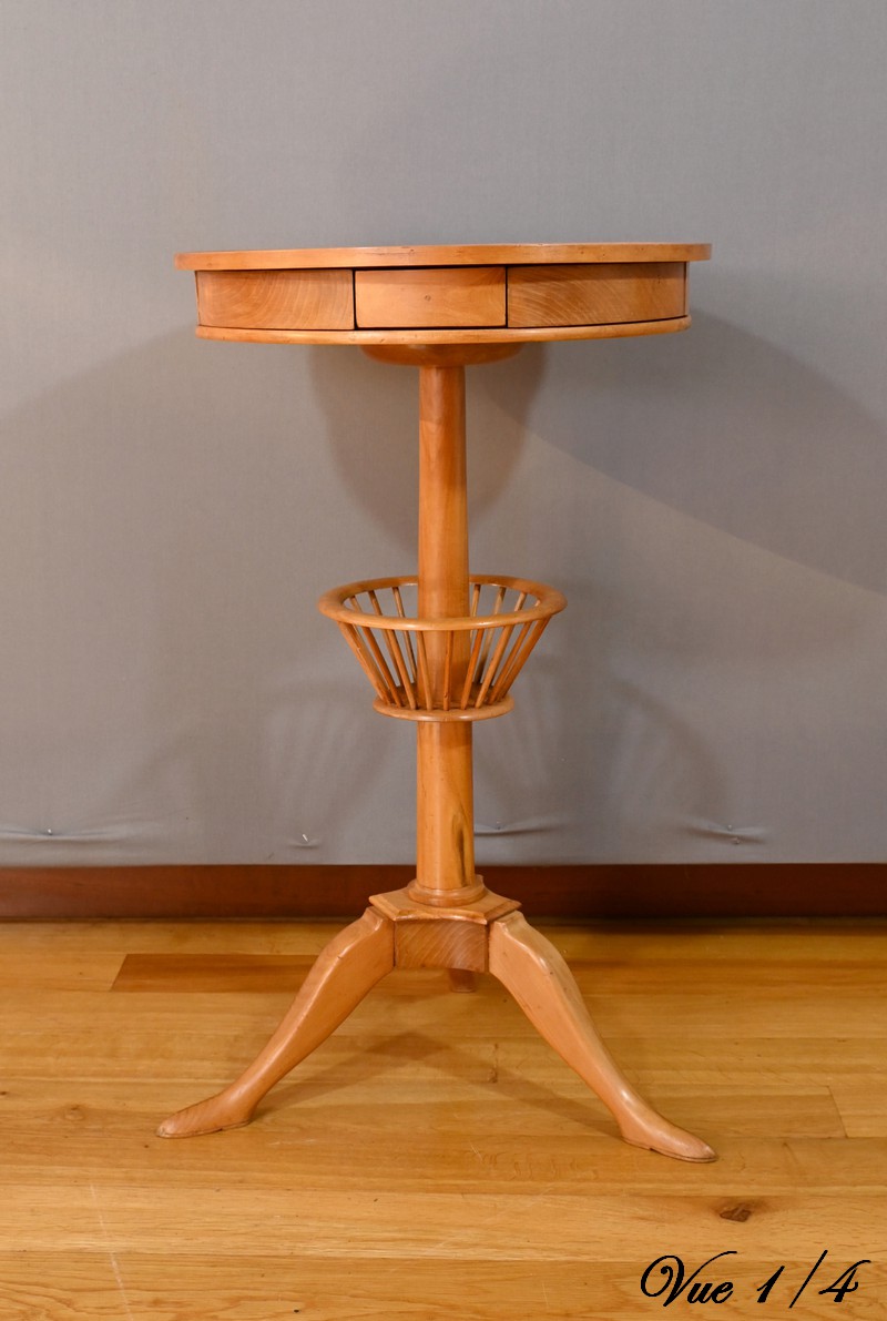 Ce guéridon-tricoteuse en merisier blond est une pièce de mobilier ingénieuse et élégante, parfaite pour les amateurs de meubles anciens et fonctionnels.