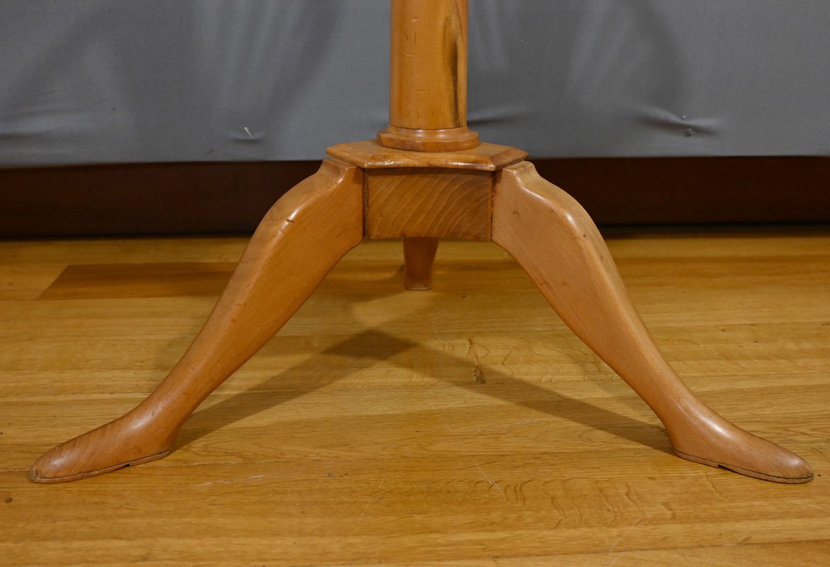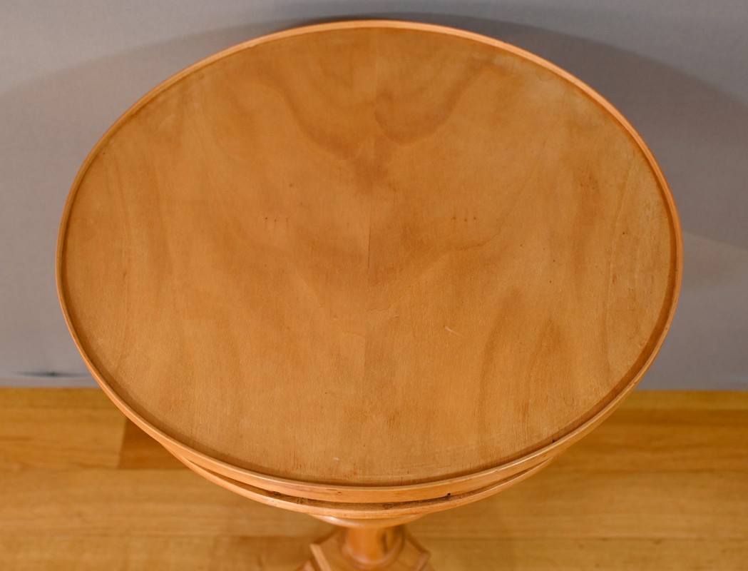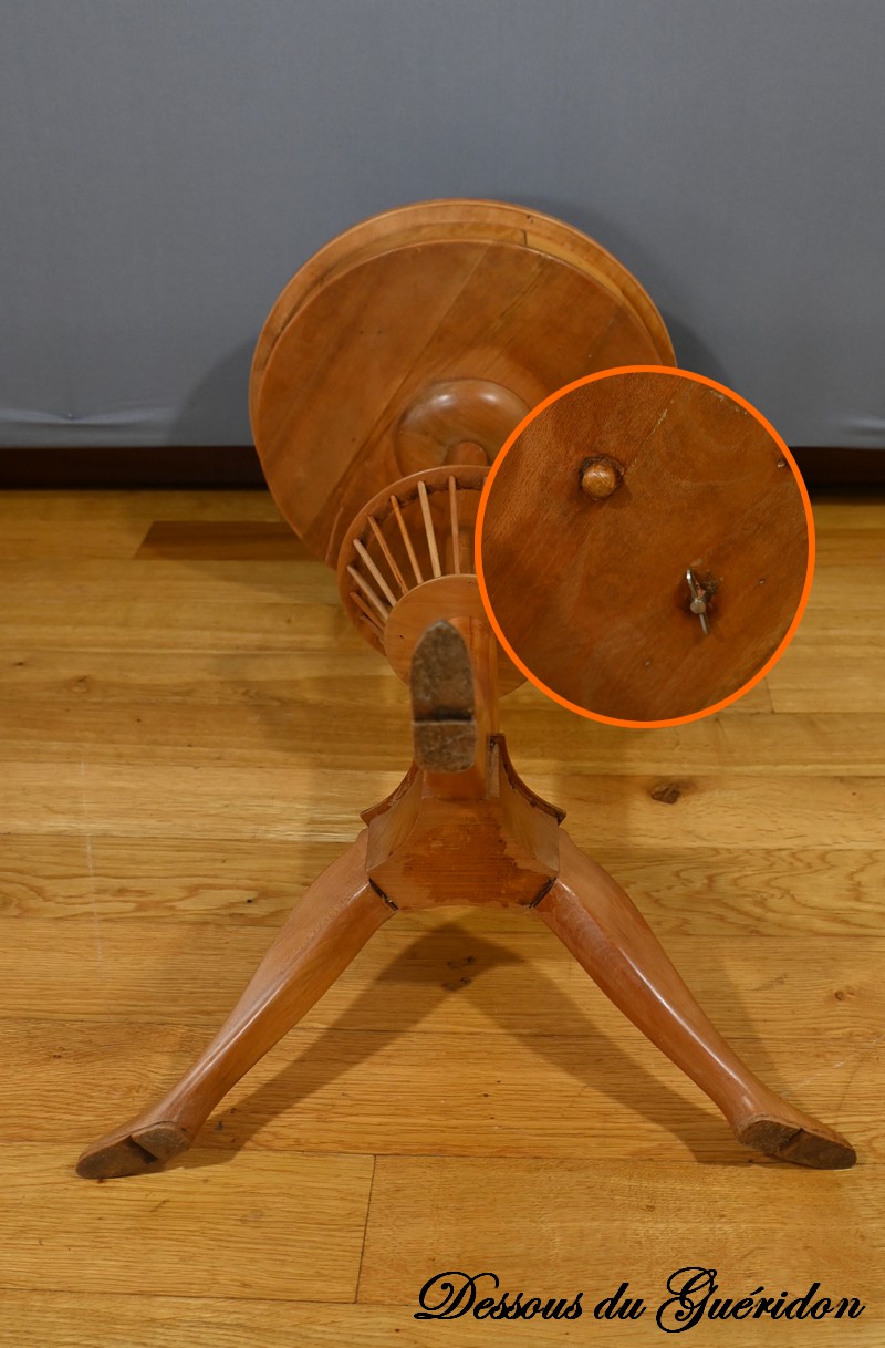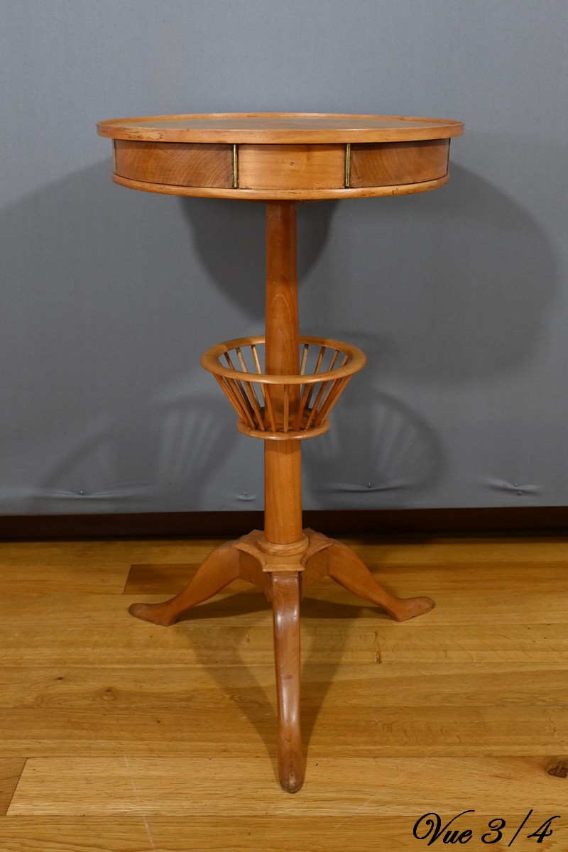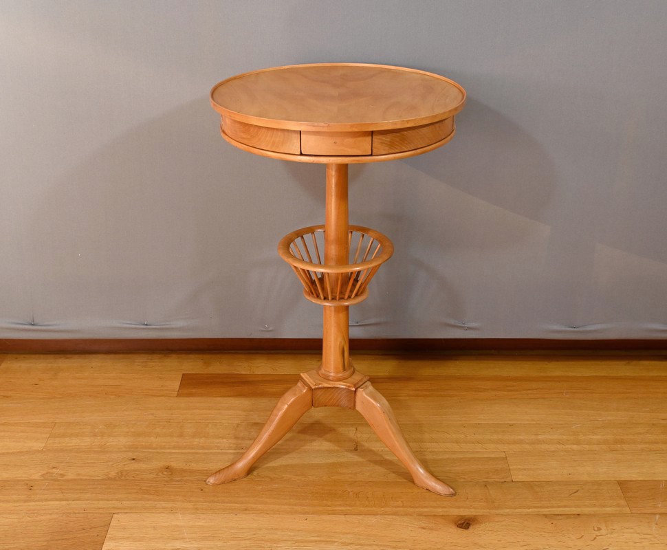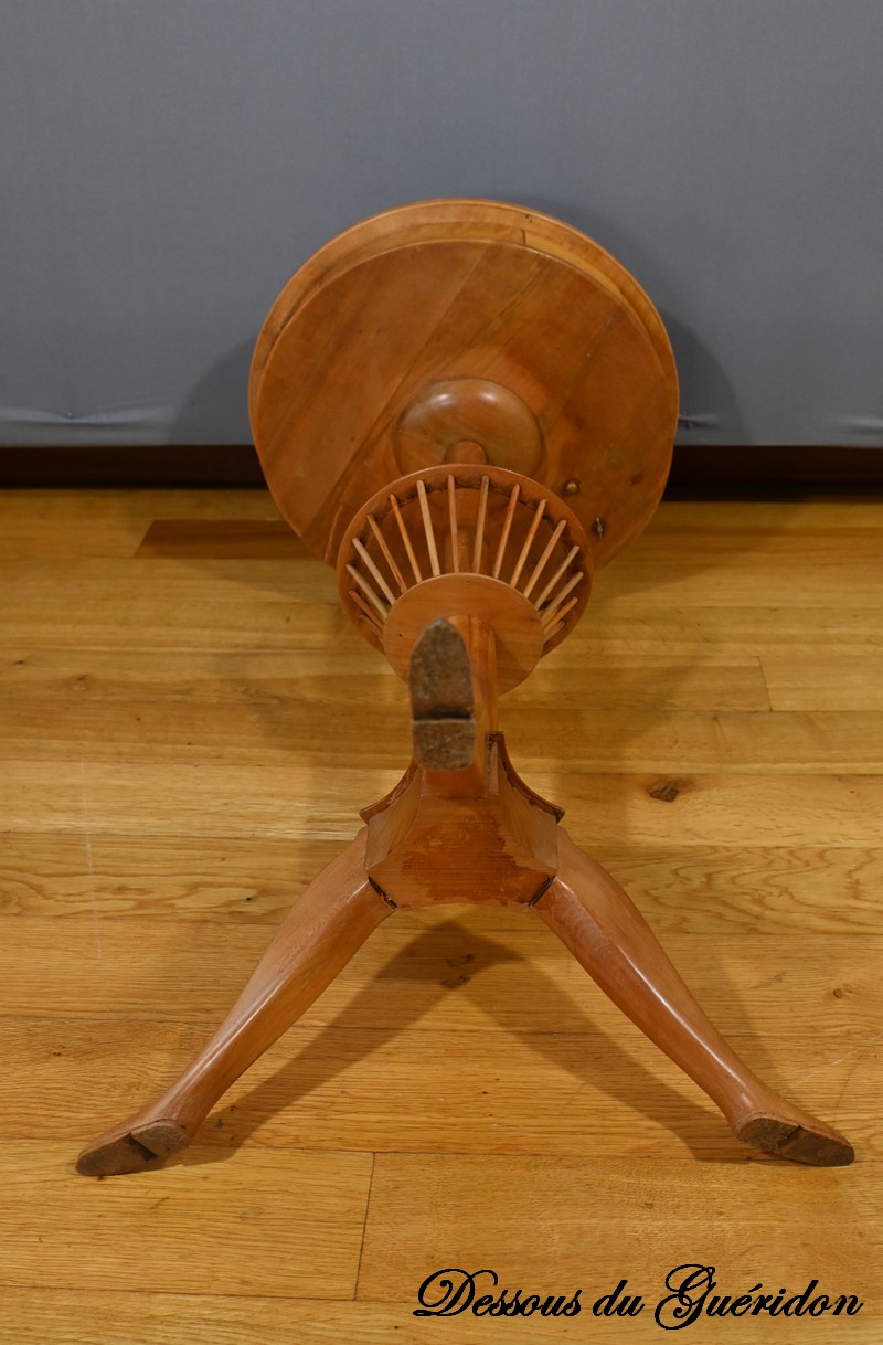 Ce guéridon-tricoteuse en merisier blond est une pièce de mobilier ingénieuse et élégante, parfaite pour les amateurs de meubles anciens et fonctionnels.