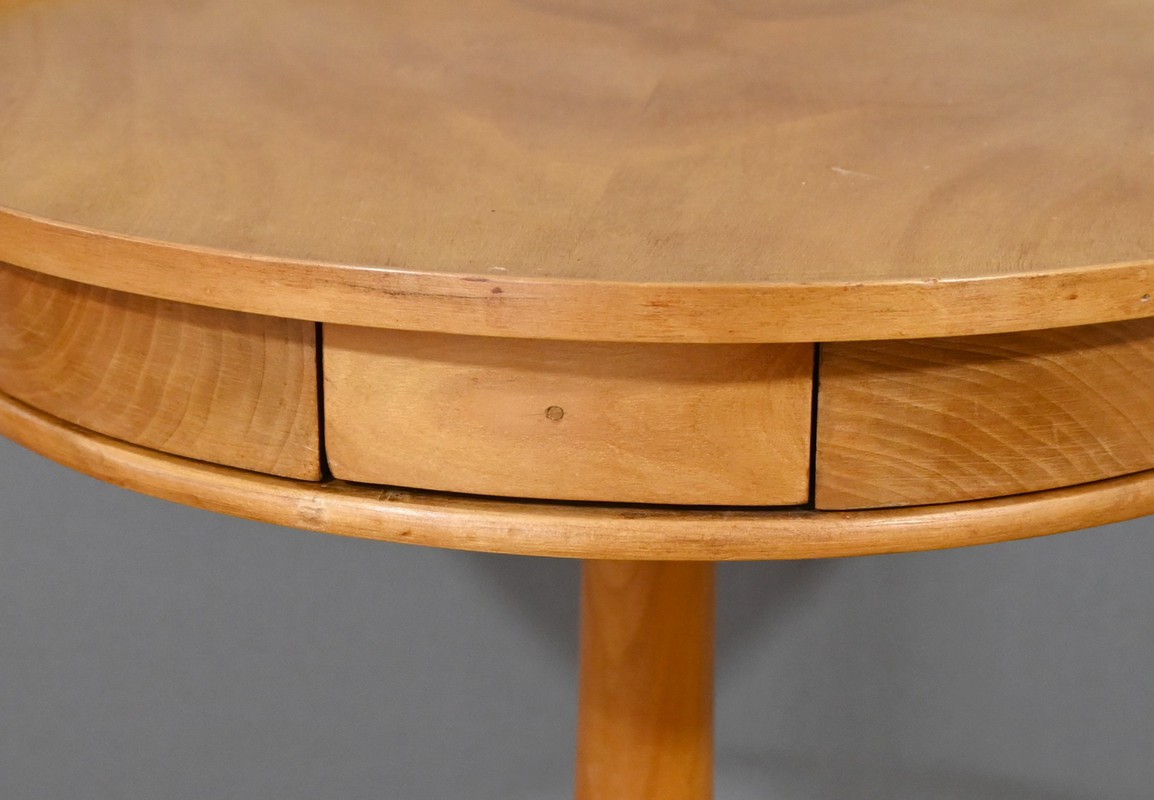 Le plateau circulaire s’ouvre par deux tiroirs demi-lune montés sur axe déporté, ainsi qu’un tiroir central.