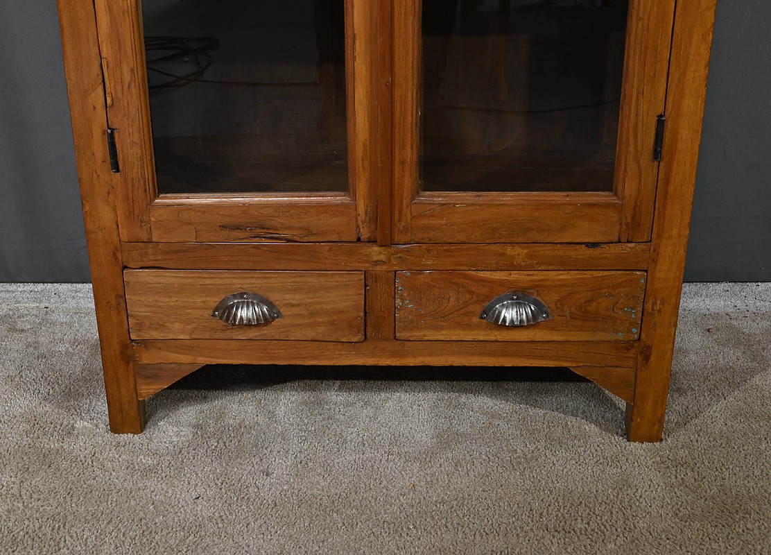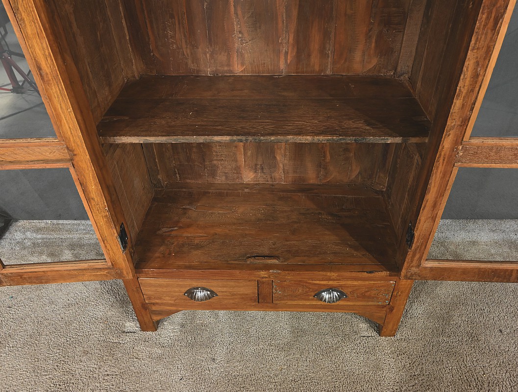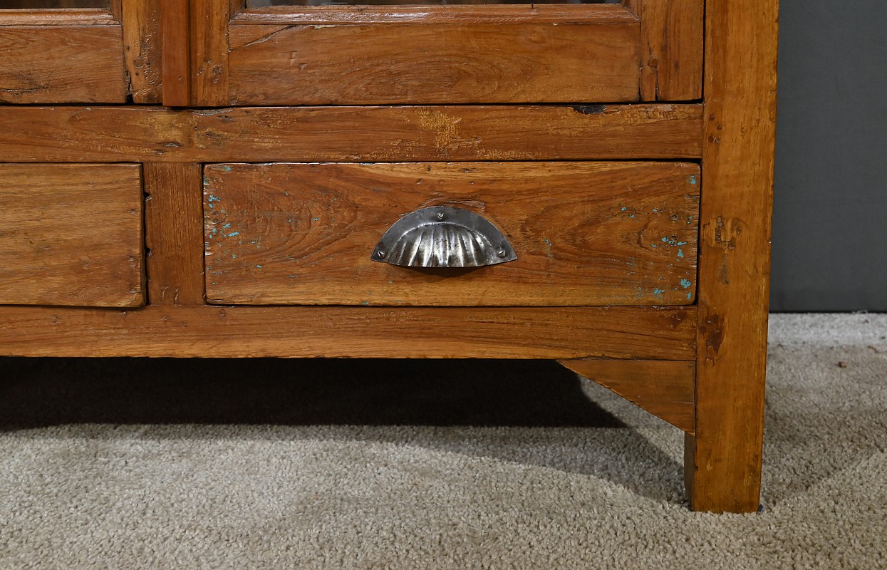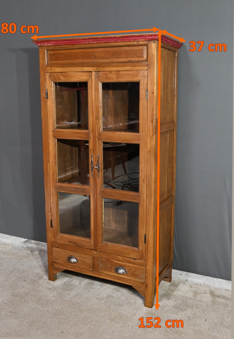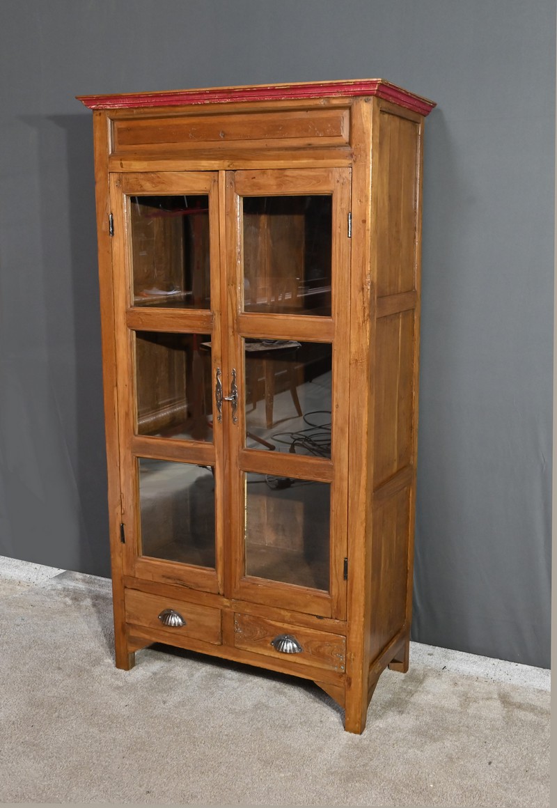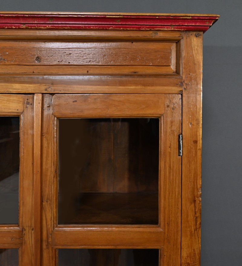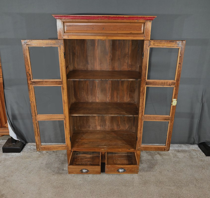 Meuble Vitrine en teck massif, intéressante par ses dimensions, ouvrant par deux portes dotées de trois vitres séparées de larges barreaux. L’intérieur de ce meuble de rangement est garni de deux étagères fixes. Deux entrées fer, une clé et une serrure en état de fonctionnement complètent ce bien. On notera également la présence de deux tiroirs avec poignée de tirage en forme de coquille. La petite corniche de ce meuble est teinte d’un rouge patiné par le temps.