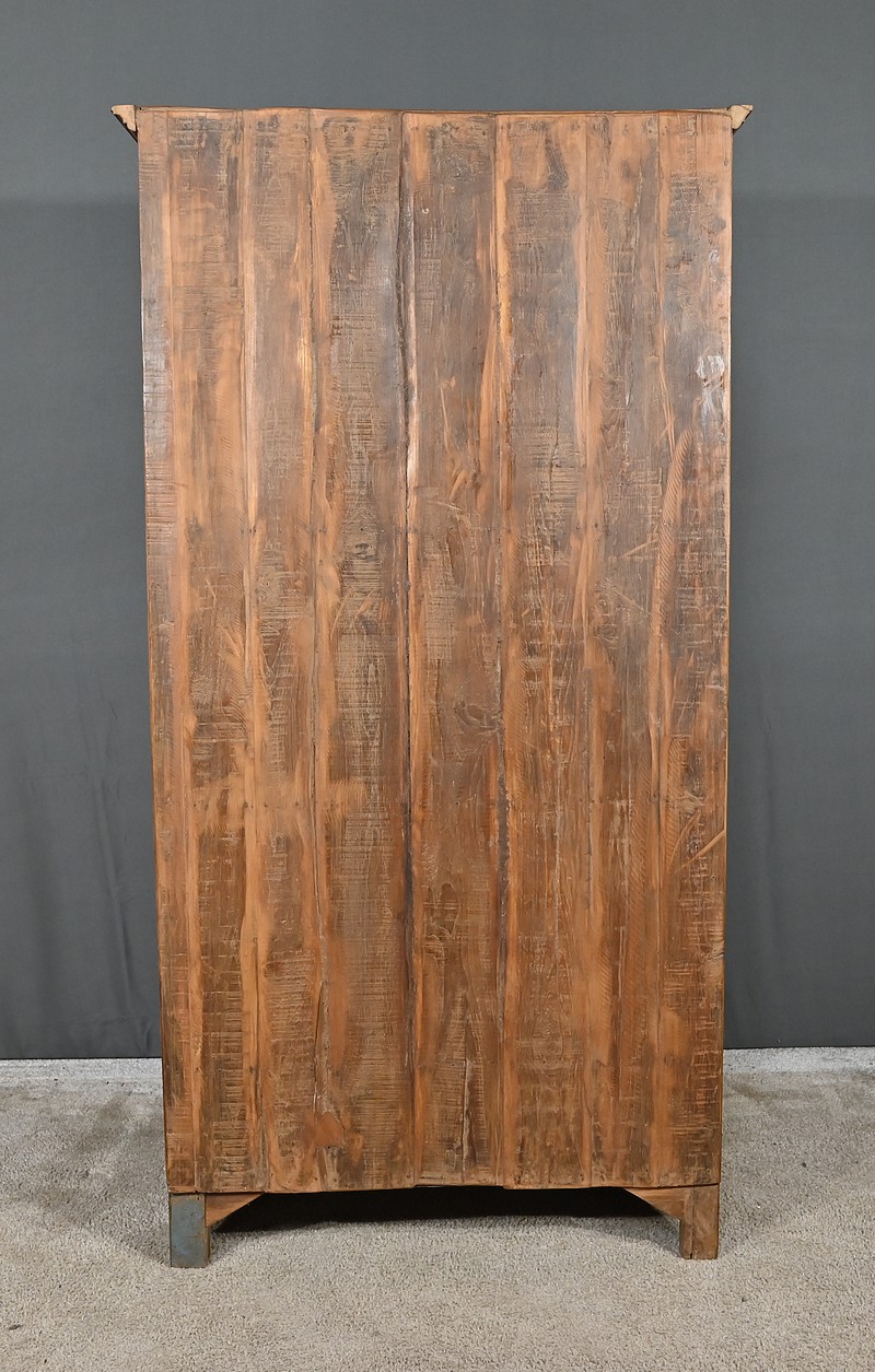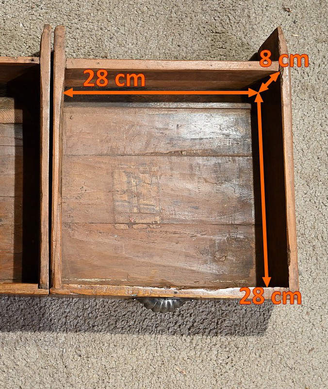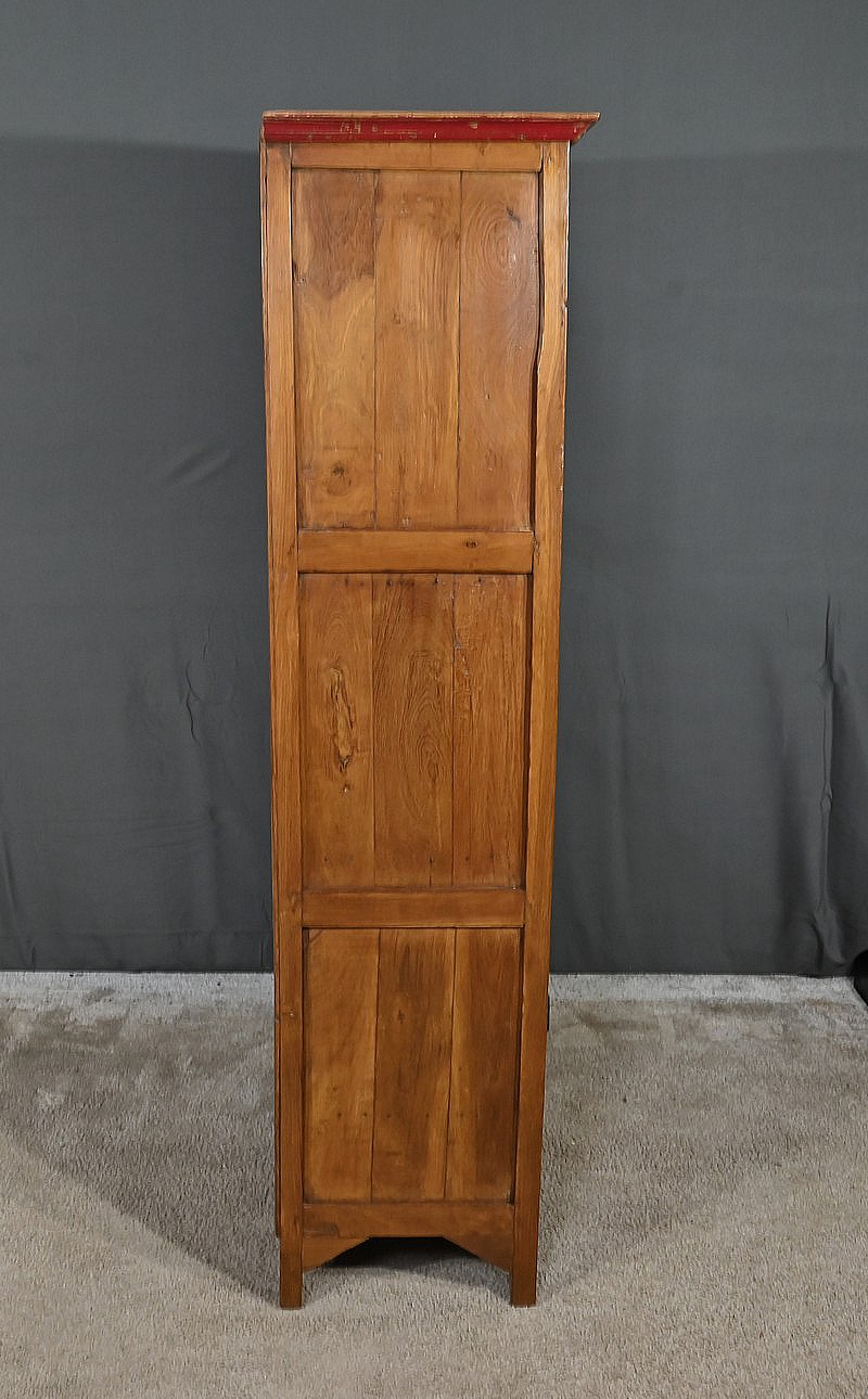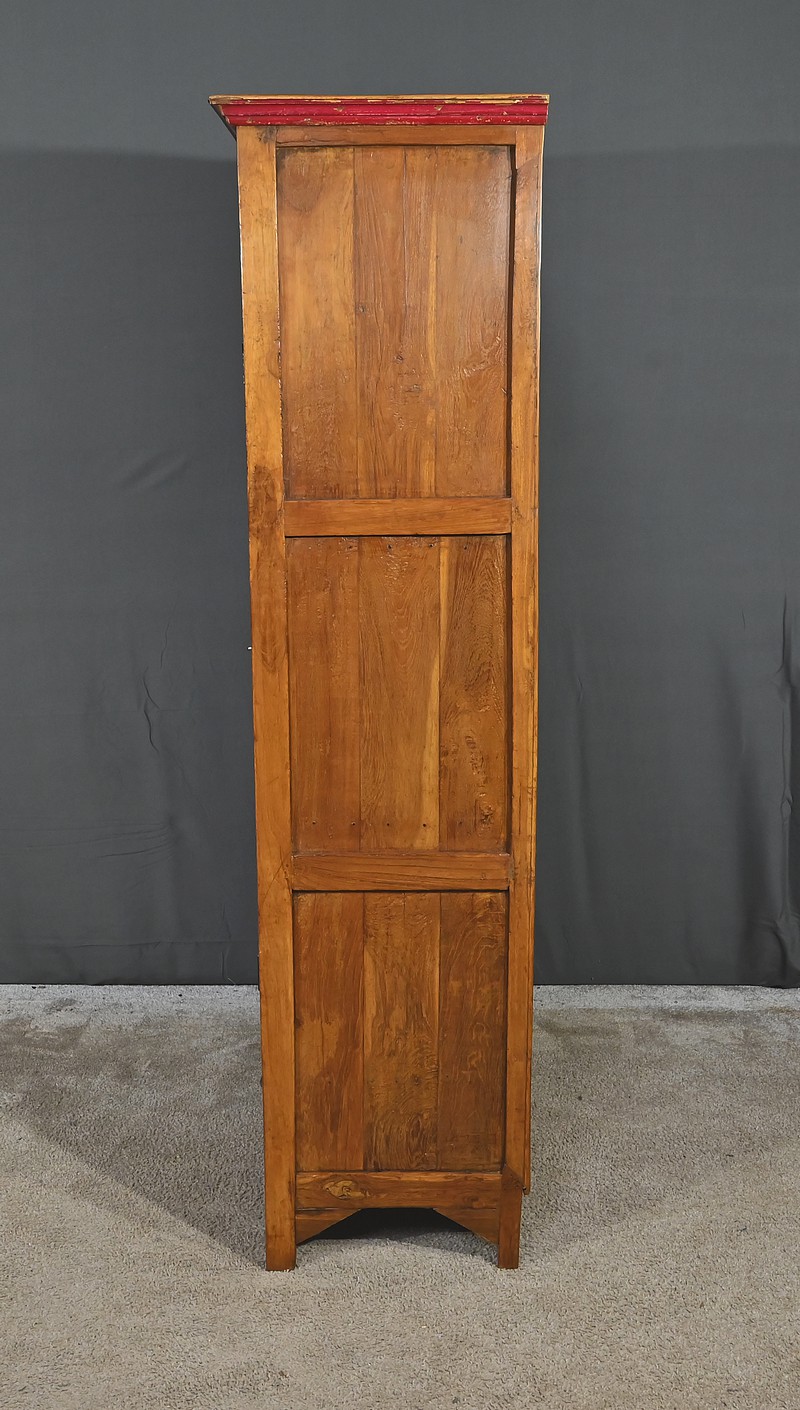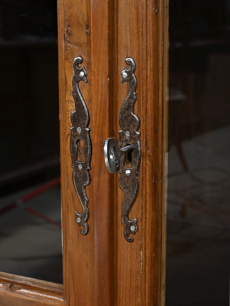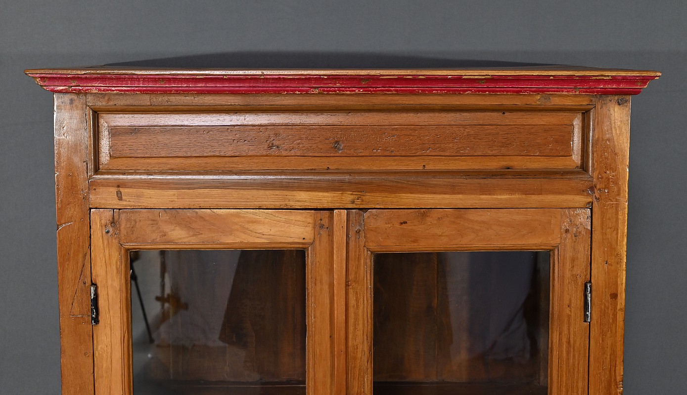 Meuble Vitrine en teck massif, intéressante par ses dimensions, ouvrant par deux portes dotées de trois vitres séparées de larges barreaux. L’intérieur de ce meuble de rangement est garni de deux étagères fixes. Deux entrées fer, une clé et une serrure en état de fonctionnement complètent ce bien. On notera également la présence de deux tiroirs avec poignée de tirage en forme de coquille. La petite corniche de ce meuble est teinte d’un rouge patiné par le temps.