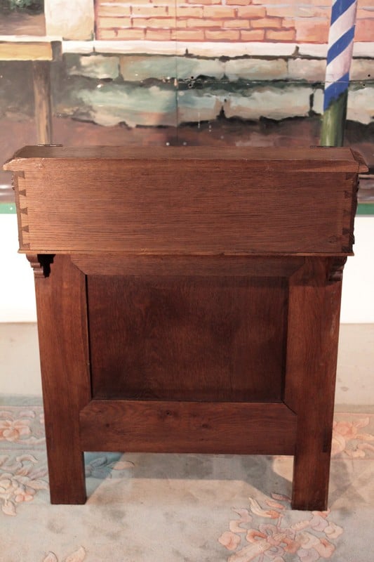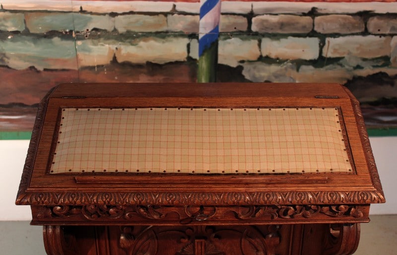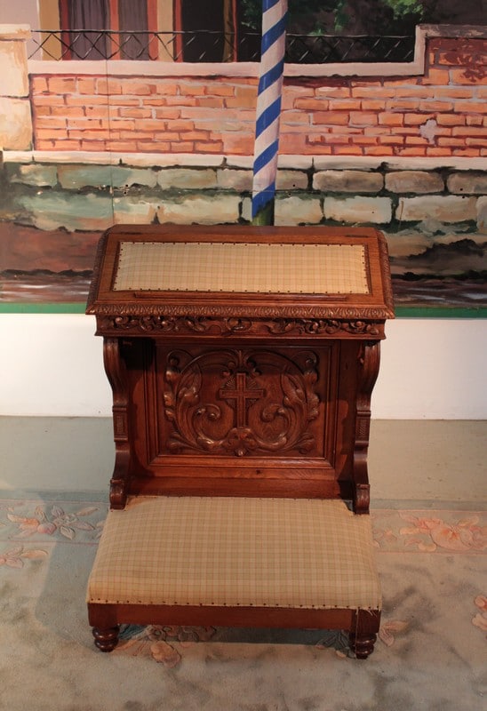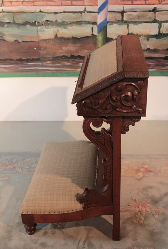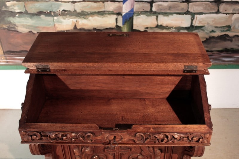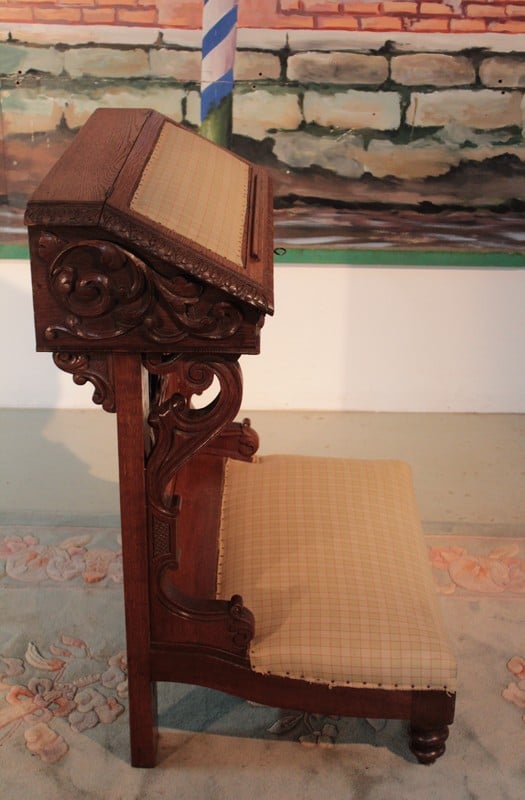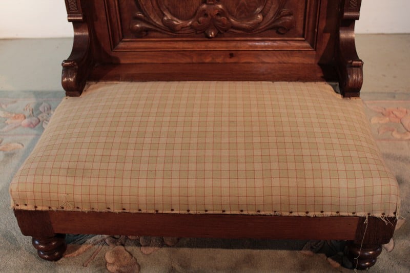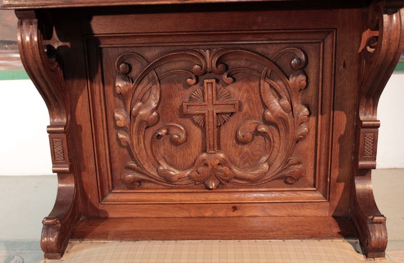 Oratoire en chêne sculpté avec motif de croix. Petit compartiment fermant à clé en partie haute. La tapisserie a été refaite. Il reste le tissu final à poser.