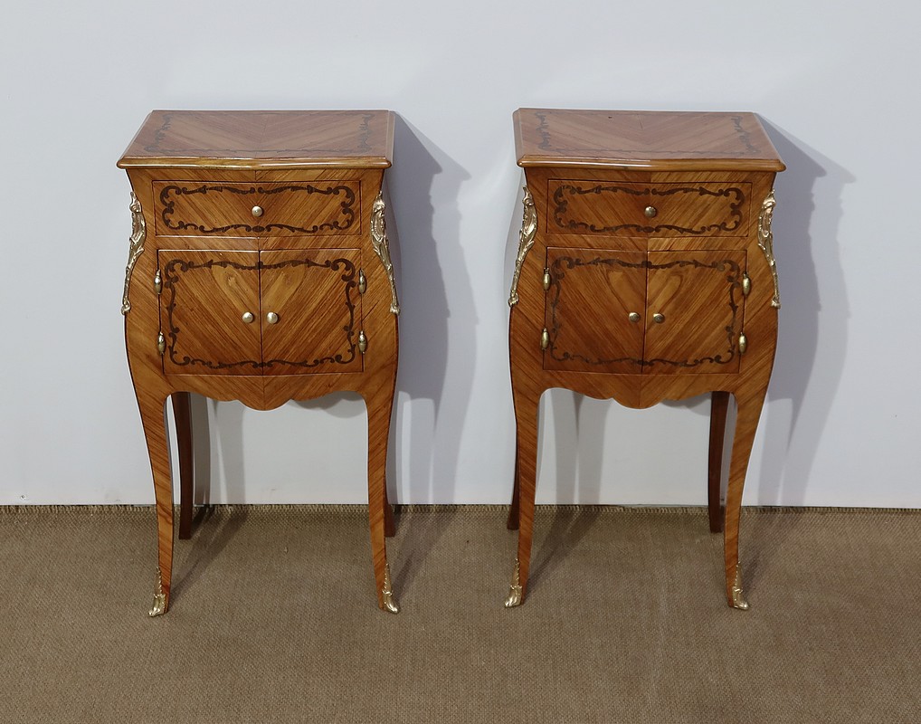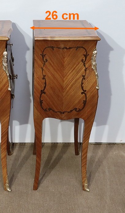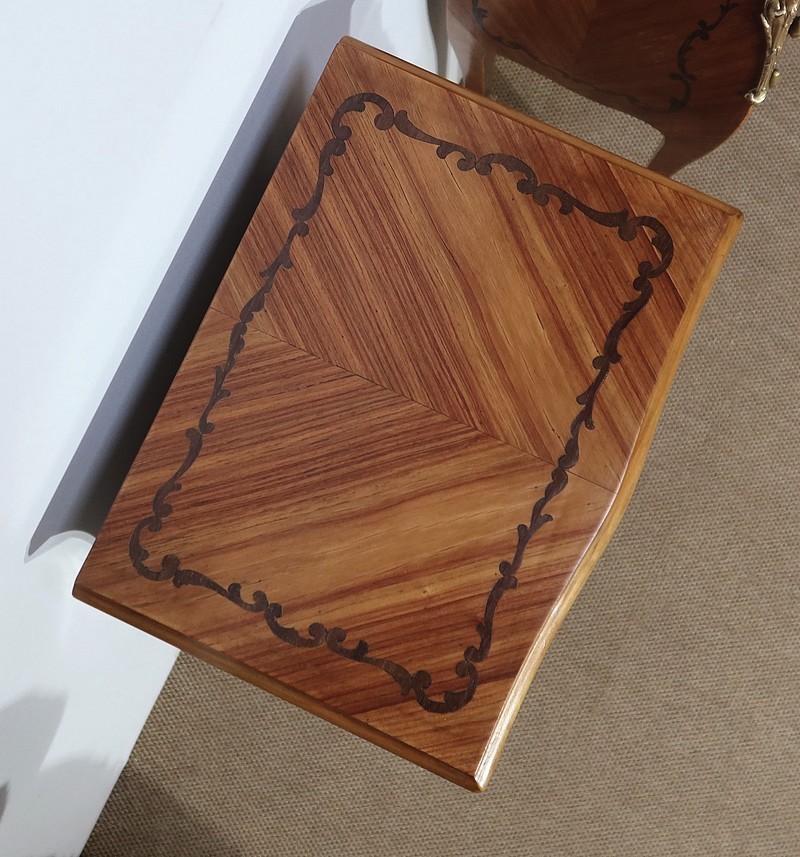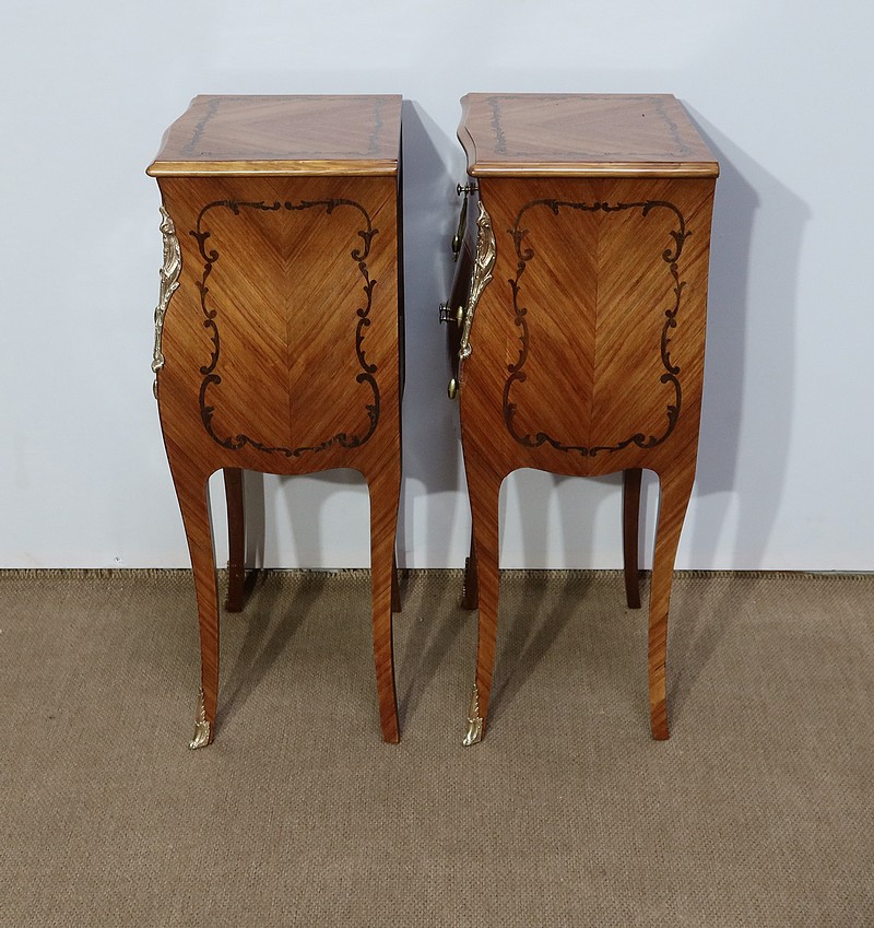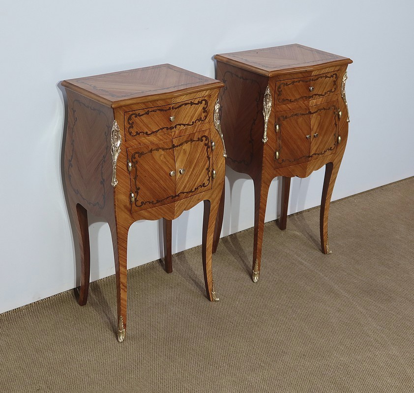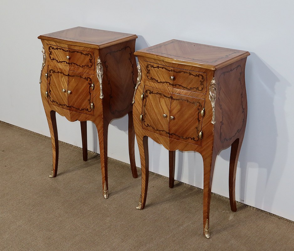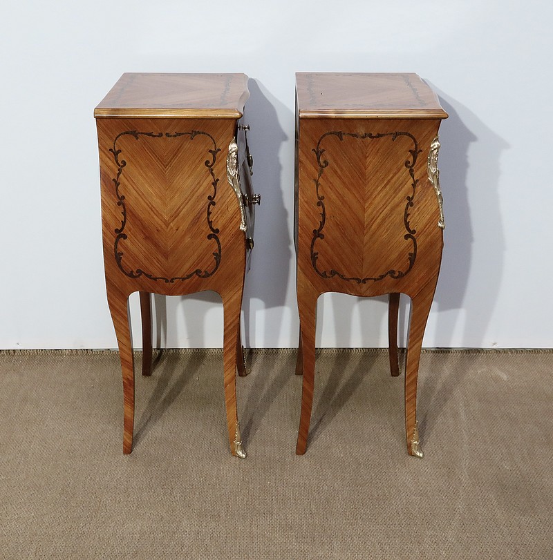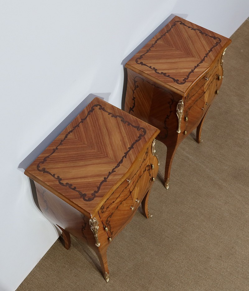 Belle paire de petits meubles en marqueterie de bois de rose et d’amarante, galbés en façade et sur les côtés, rappelant la forme tombeau typique des meubles Louis XV.