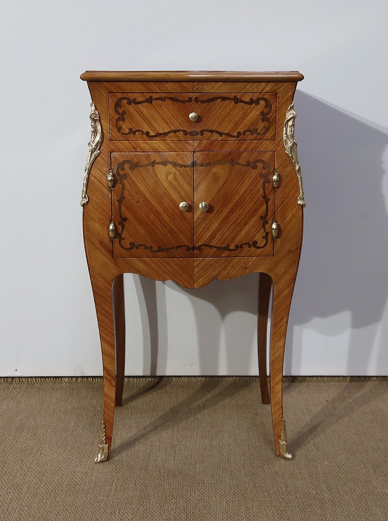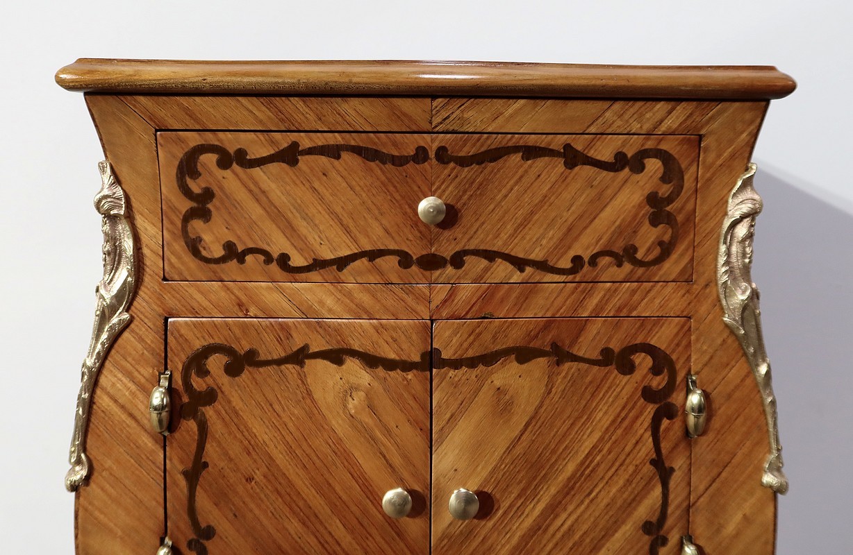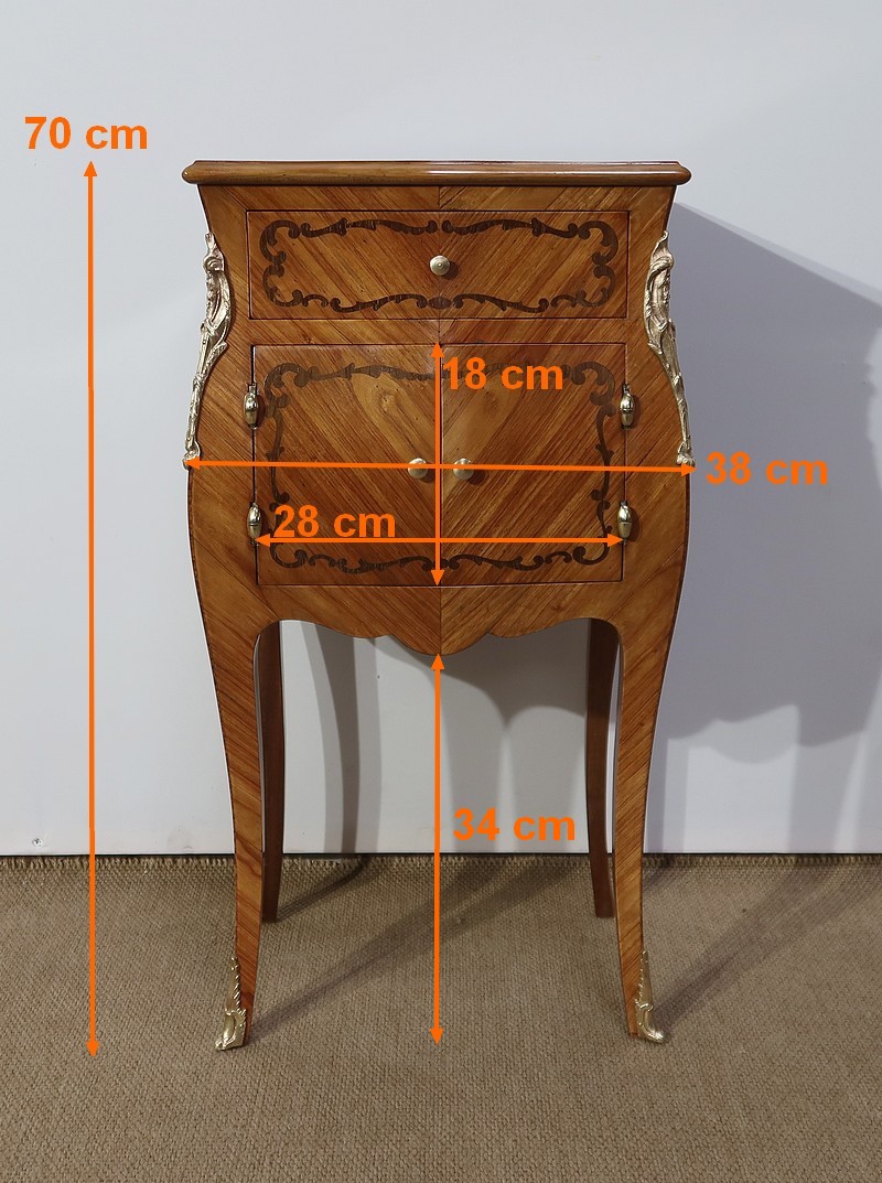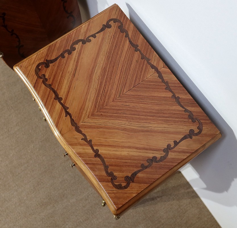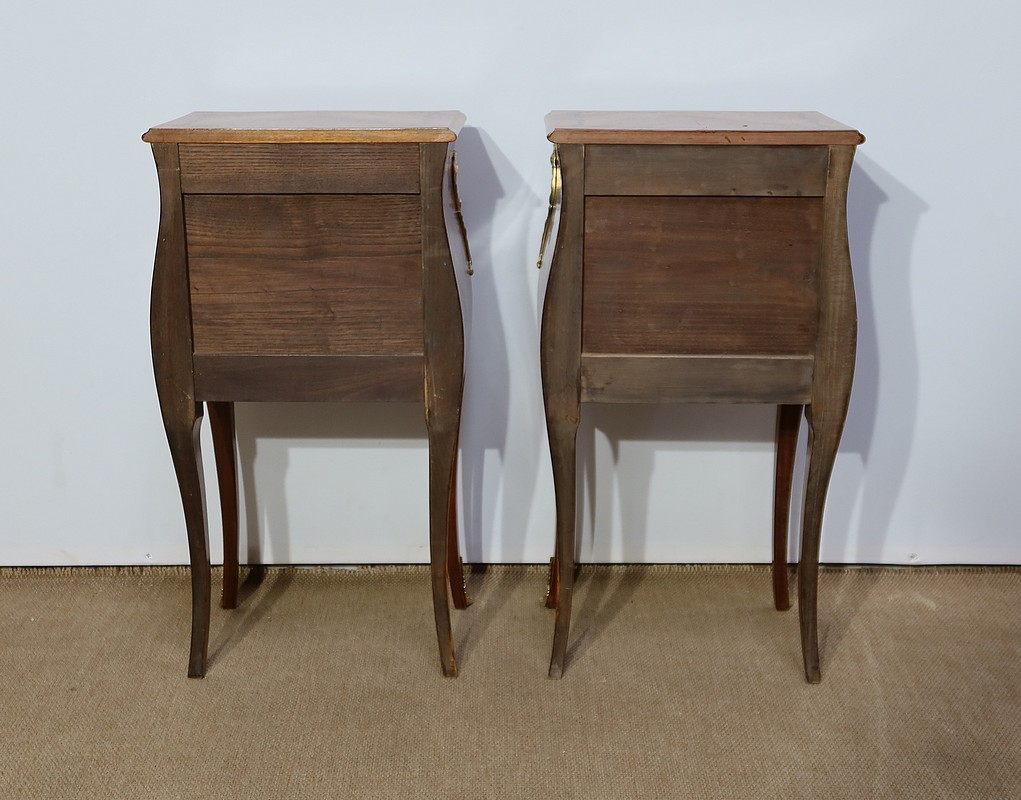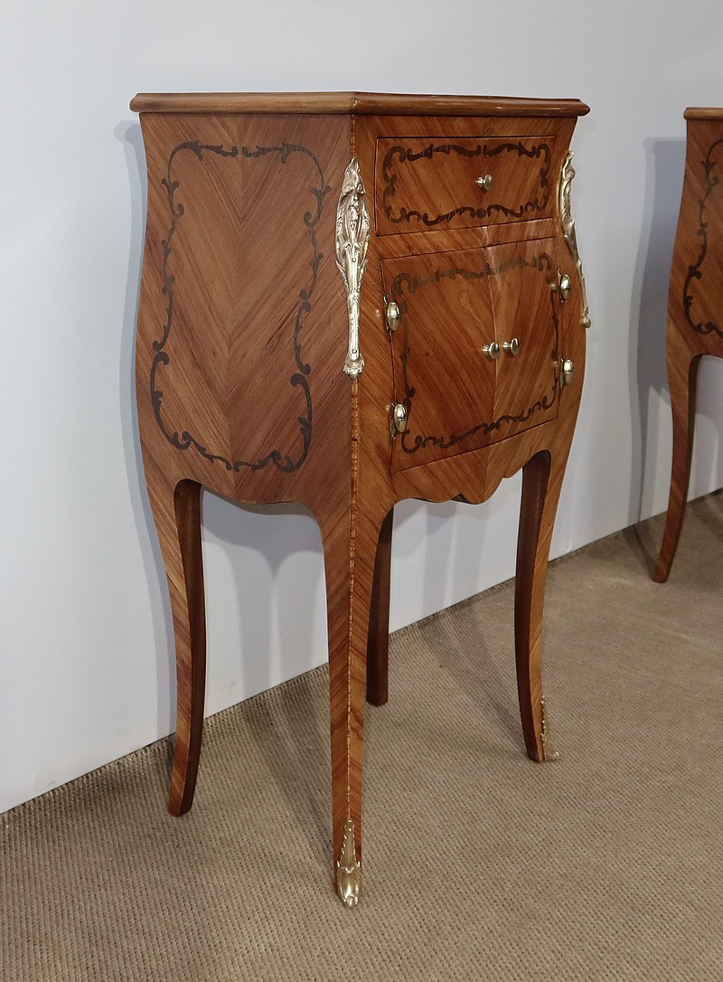 Belle paire de petits meubles en marqueterie de bois de rose et d’amarante, galbés en façade et sur les côtés, rappelant la forme tombeau typique des meubles Louis XV.