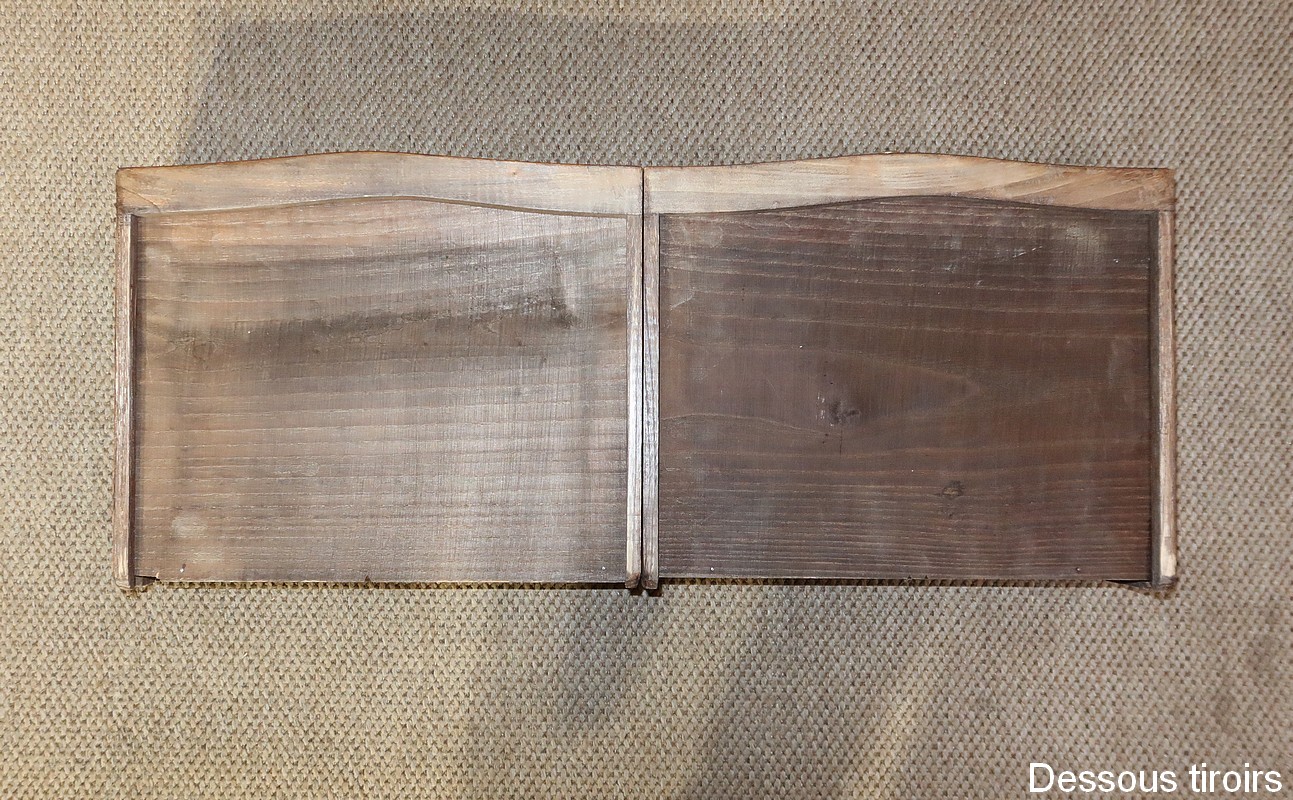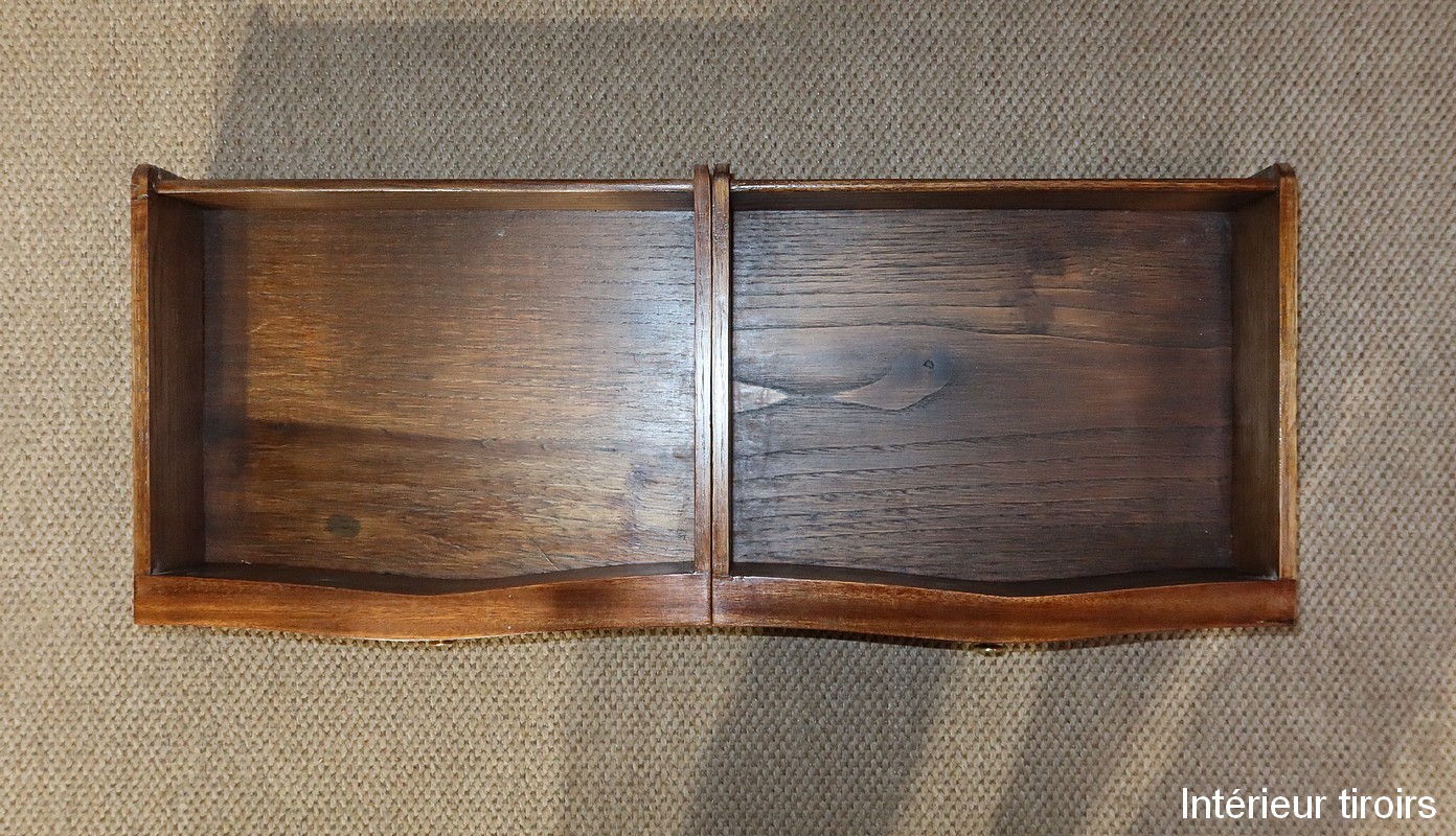 En dessous deux petites portes galbées dans les 2 sens ont un placage identique au tiroir, avec festonnage, ruban de volutes et placage de bois de rose.