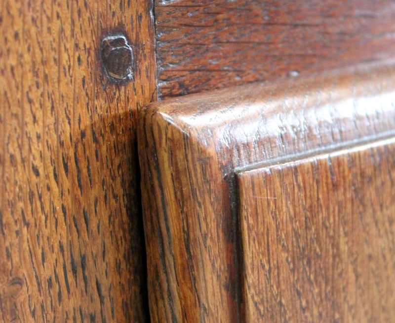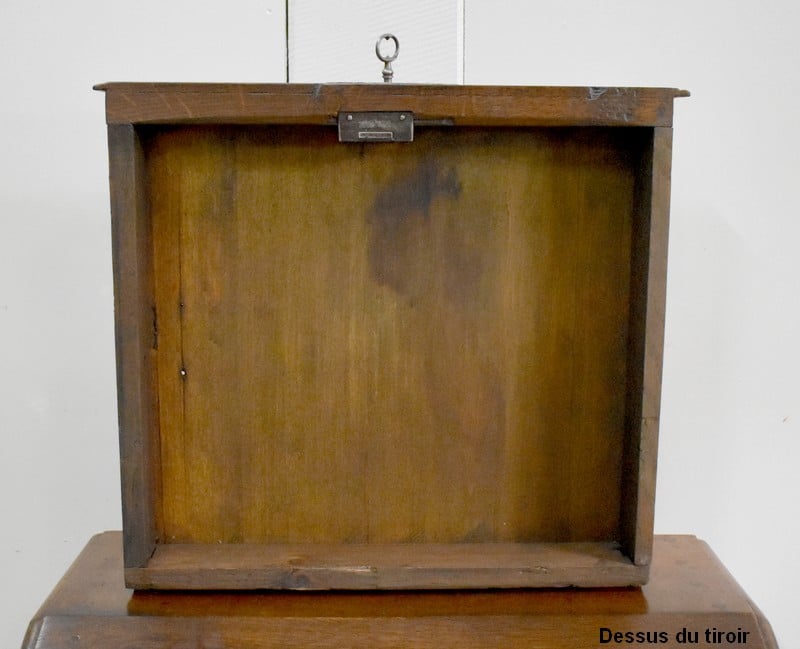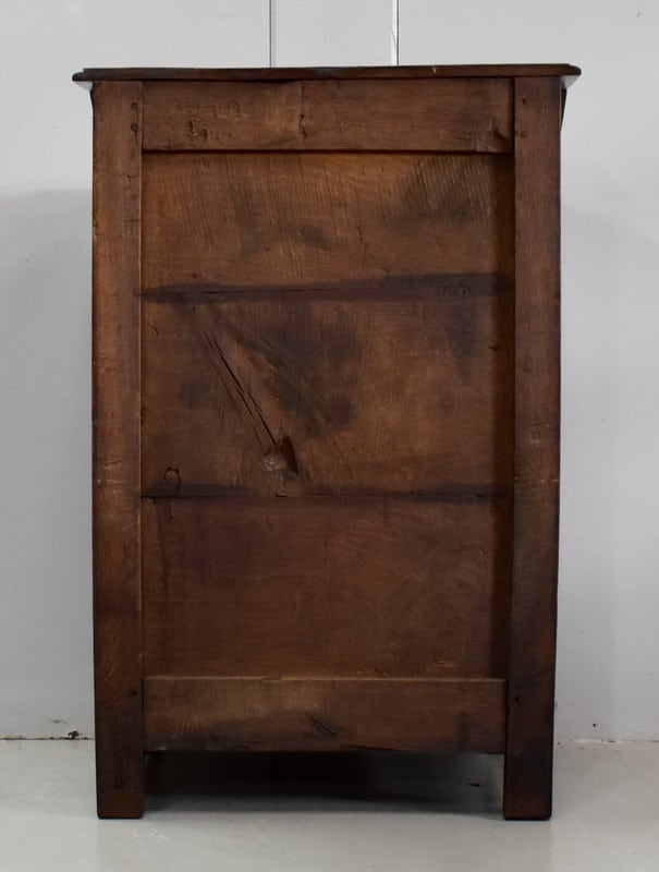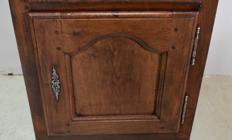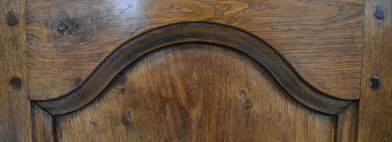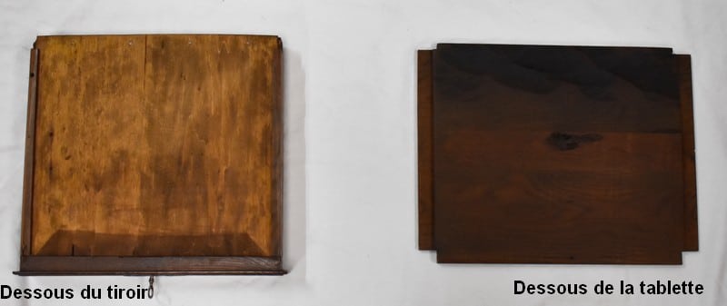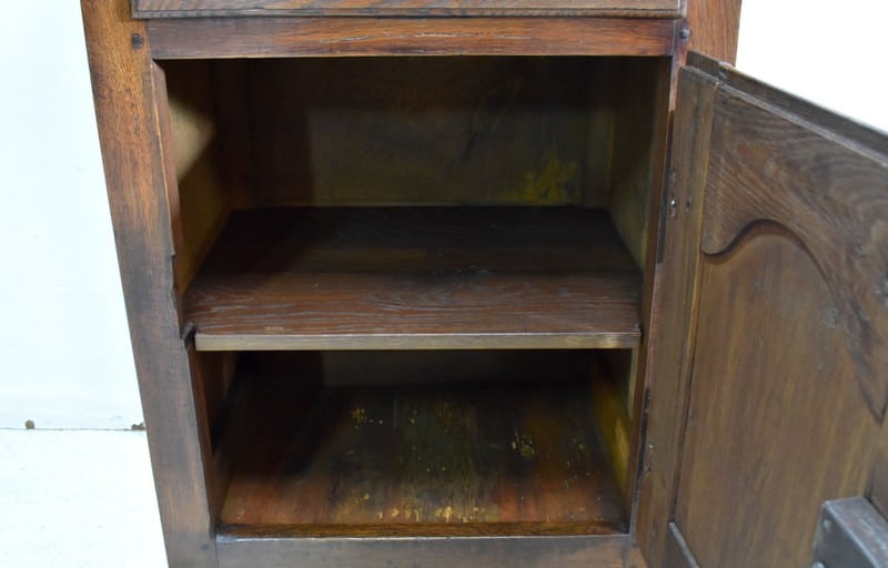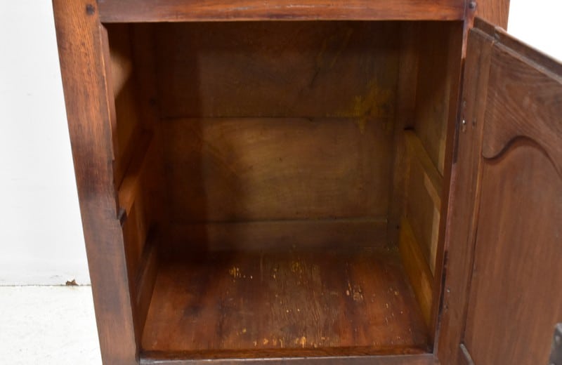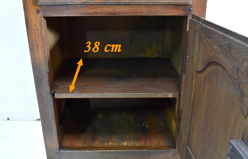 En dessous, il propose une Petite porte avec panneau central en retrait, et encadrement Mouluré en, chapeau de Gendarme sur la traverse haute. Elle révèle deux compartiments de rangement formés par la présence d’une étagère amovible.