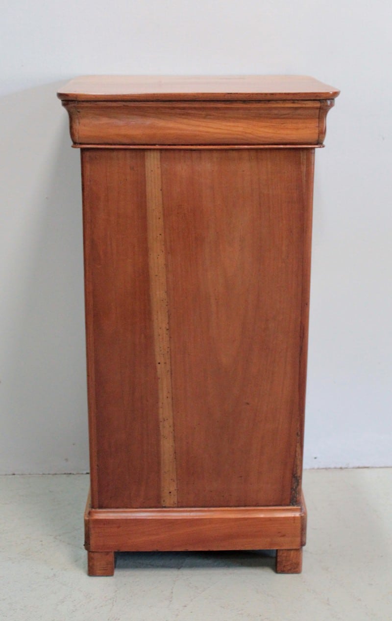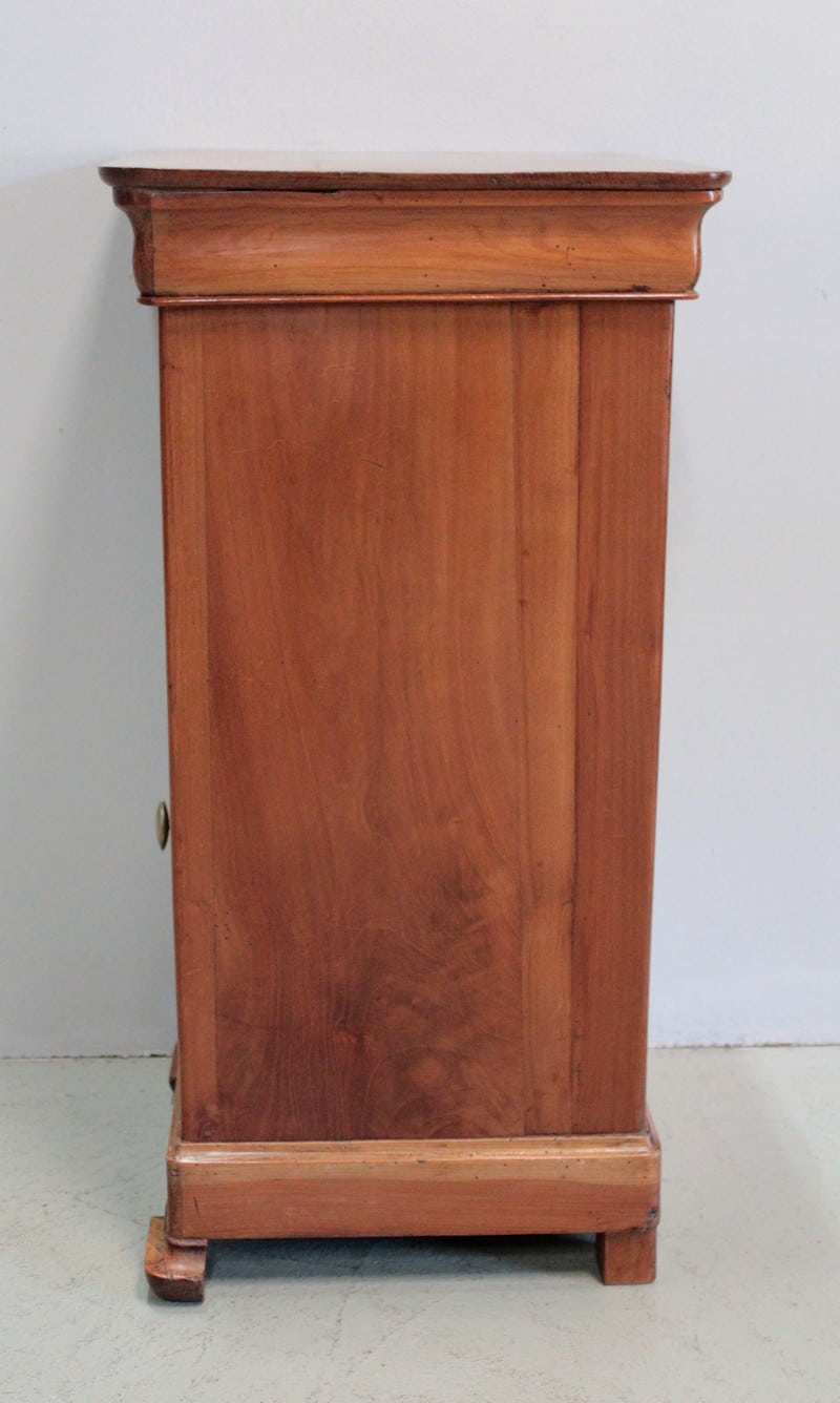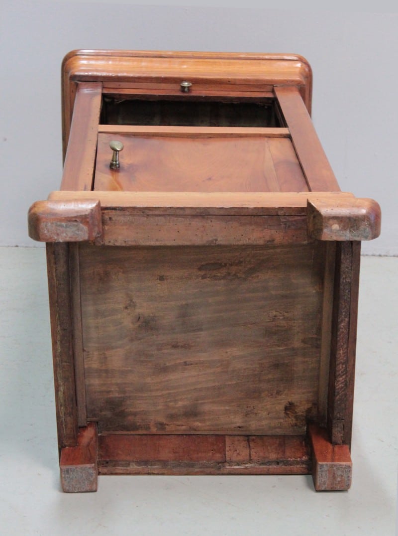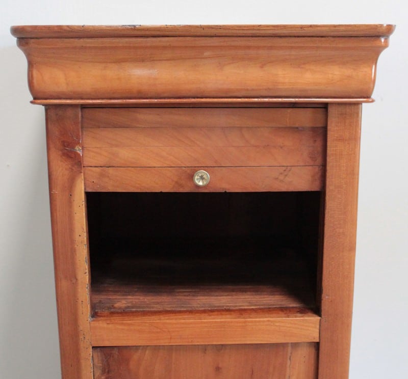 Petit meuble en merisier dont la partie haute ouvre sur une niche par un rideau et la partie basse par une porte donnant sur une étagère posée sur tasseaux.
