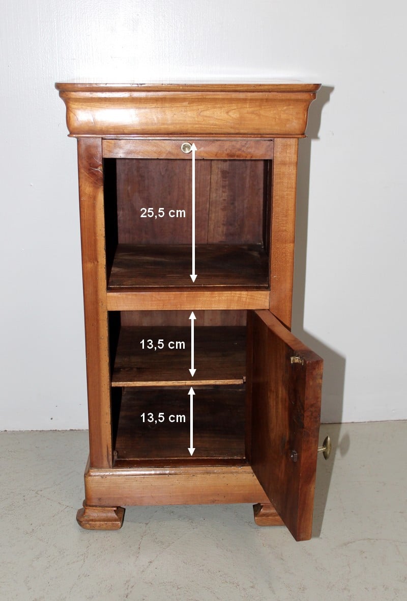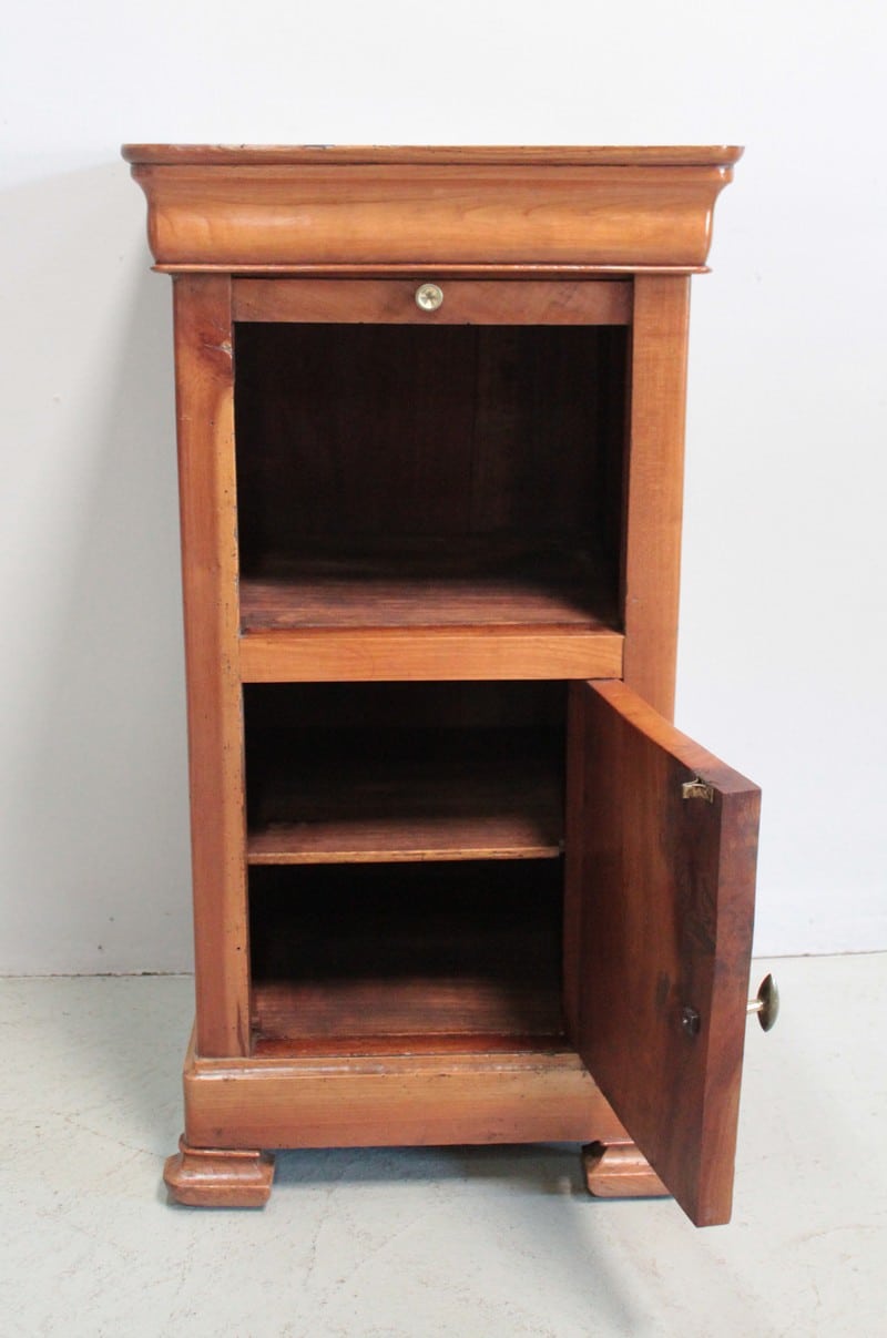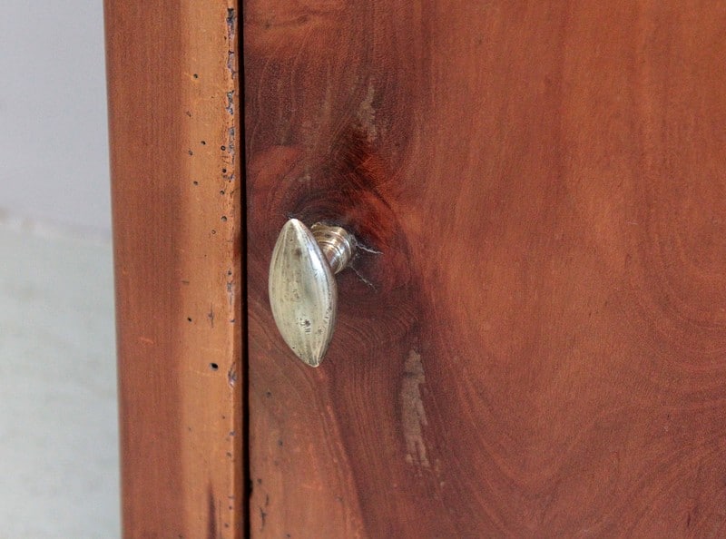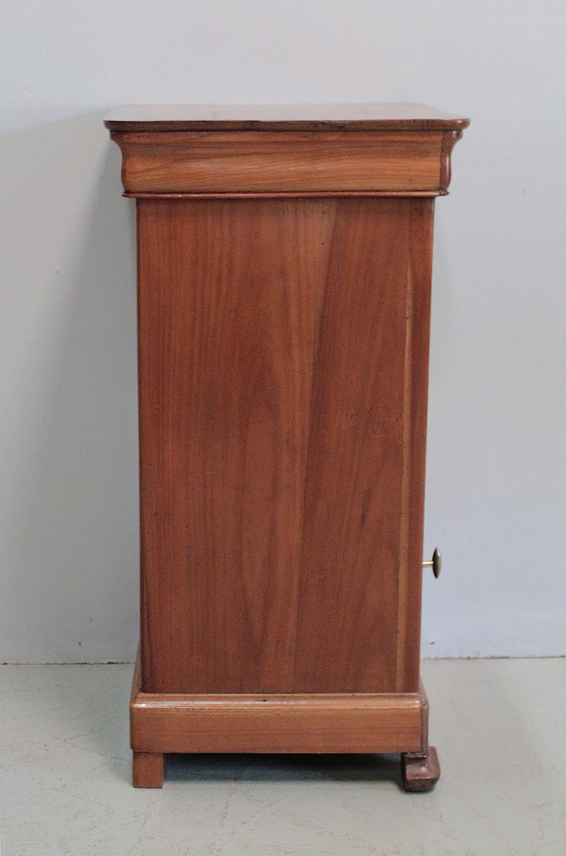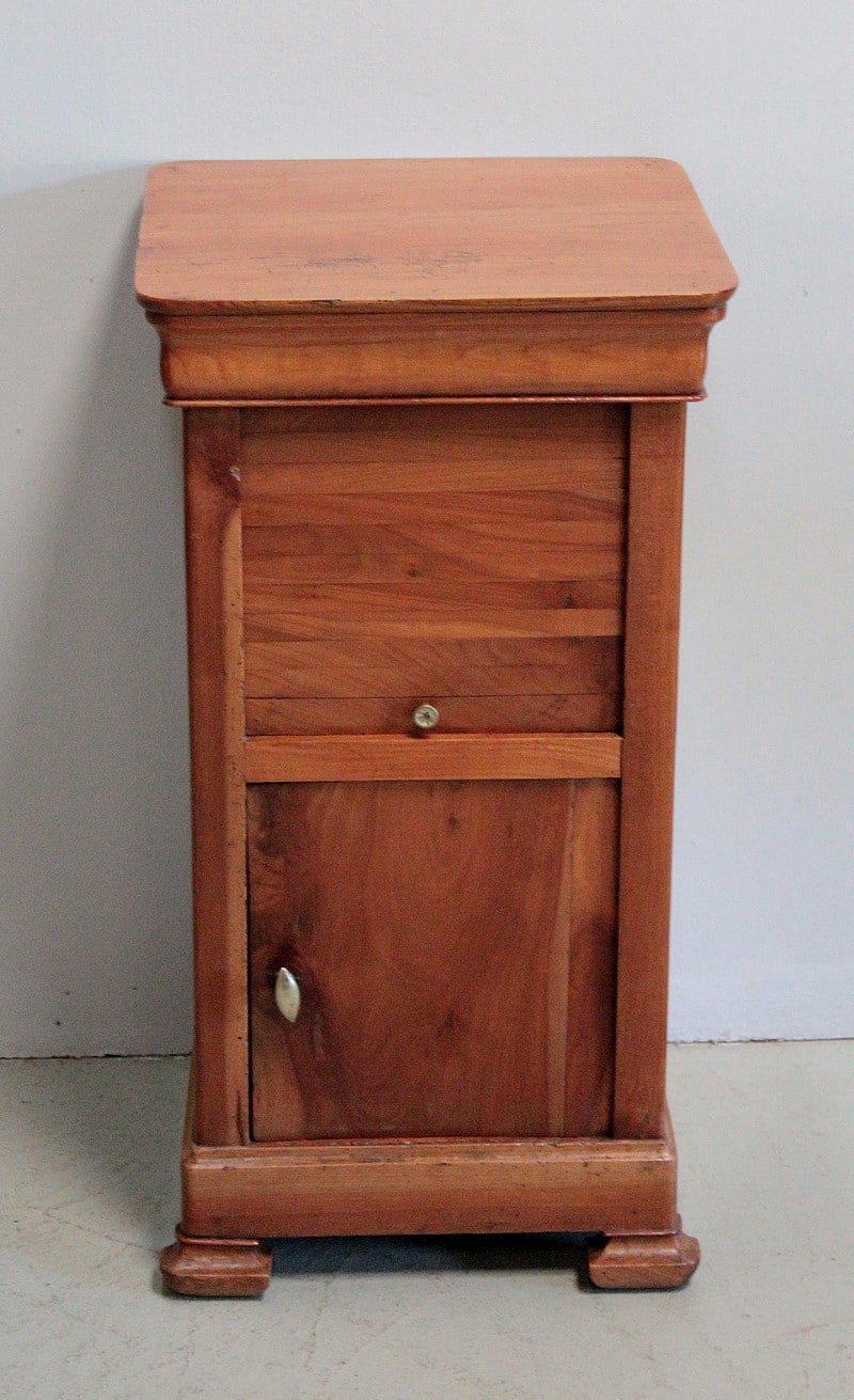 Petit meuble en merisier dont la partie haute ouvre sur une niche par un rideau et la partie basse par une porte donnant sur une étagère posée sur tasseaux.