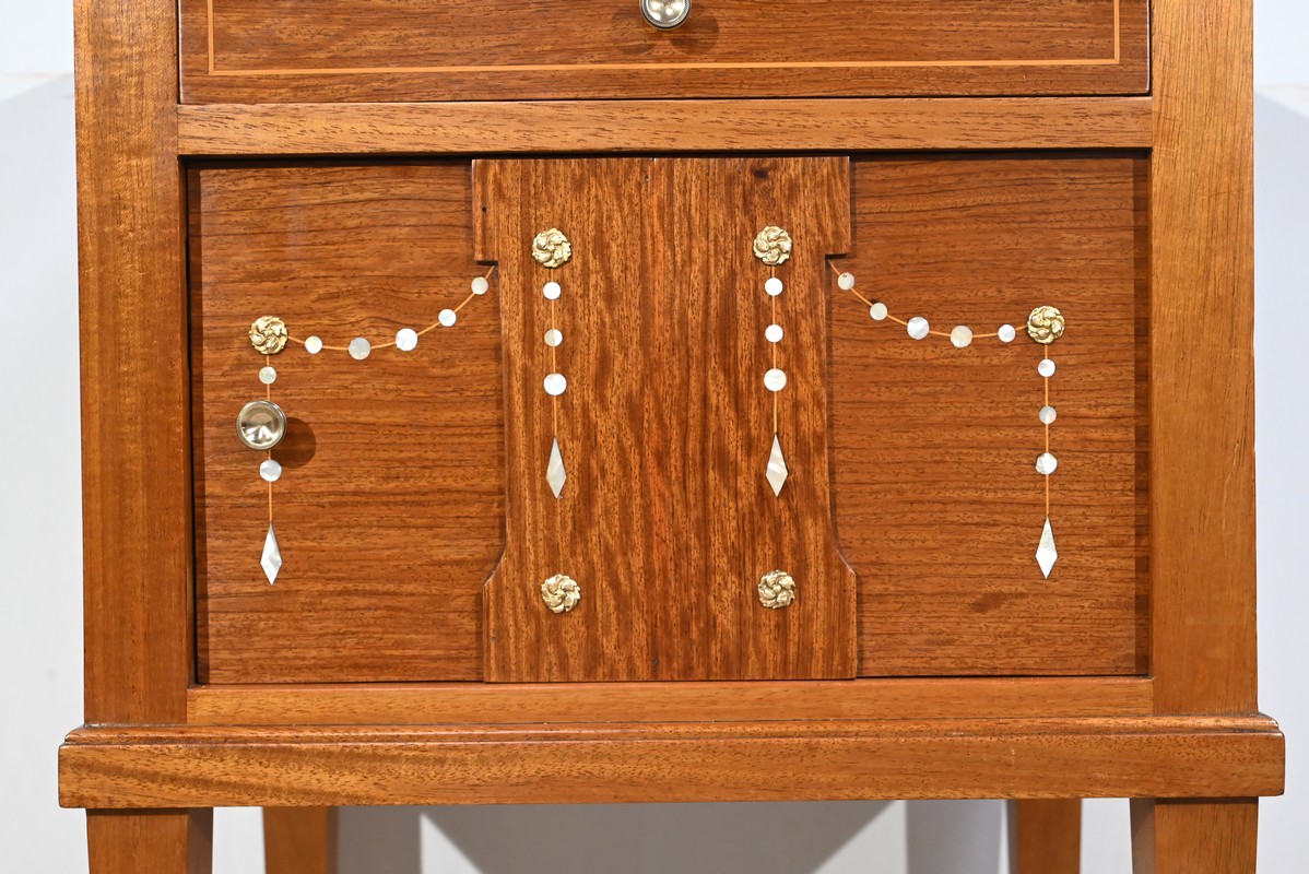 Ce meuble de petite dimension présente également une porte, à bouton cuvette, agrémenté d’une composition de nacre, de bois clair et de motifs bronze.